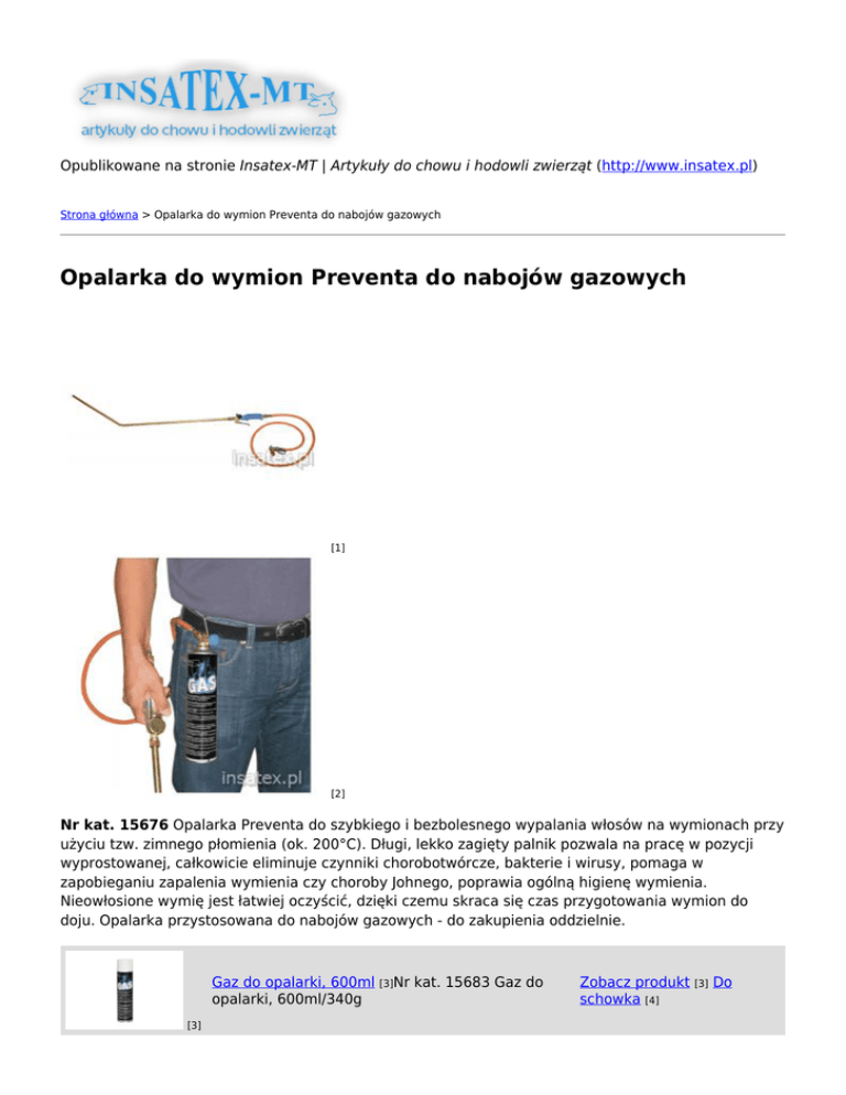 Opublikowane na stronie Insatex-MT | Artykuły do chowu i hodowli zwierząt (http://www.insatex.pl) Strona główna > Opalarka do wymion Preventa do nabojów gazowych Opalarka do wymion Preventa do nabojów gazowych [1] [2] Nr kat. 15676 Opalarka Preventa do szybkiego i bezbolesnego wypalania włosów na wymionach przy użyciu tzw. zimnego płomienia (ok. 200°C). Długi, lekko zagięty palnik pozwala na pracę w pozycji wyprostowanej, całkowicie eliminuje czynniki chorobotwórcze, bakterie i wirusy, pomaga w zapobieganiu zapalenia wymienia czy choroby Johnego, poprawia ogólną higienę wymienia. Nieowłosione wymię jest łatwiej oczyścić, dzięki czemu skraca się czas przygotowania wymion do doju. Opalarka przystosowana do nabojów gazowych - do zakupienia oddzielnie. Gaz do opalarki, 600ml [3]Nr kat. 15683 Gaz do opalarki, 600ml/340g [3] Zobacz produkt [3] Do schowka [4] tel./fax: 61 8220 121 Przedsiębiorstwo kom.: +48 663 Handlowo-Usługowe © Insatex 2014 48 47 12 INSATEX-MT created by kom.: +48 663 ul. Madziarska 38 netmachina.com 48 47 11 61-615 Poznań e-mail: [email protected] Link źródłowy: http://www.insatex.pl/produkty/opalarka-do-wymion-preventa-do-naboj%C3%B3w-gazowych Linki [1] http://www.insatex.pl/sites/default/files/products/15676%20opa.jpg [2] http://www.insatex.pl/sites/default/files/products/15676%2B2%20opal.jpg [3] http://www.insatex.pl/produkty/gaz-do-opalarki-600ml [4] http://www.insatex.pl/flag/flag/schowek/2509?destination=printpdf/2510&token=c394b02dc65f5db29646641c4cf 0c963