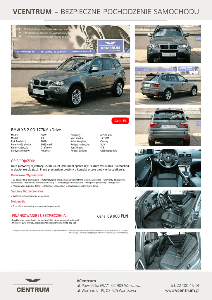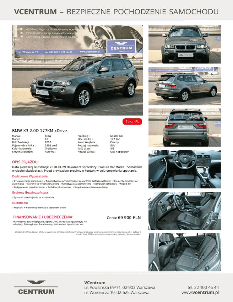 BMW X3 2.0D 177KM xDrive Marka: Model: Rok Produkcji: Pojemność silnika : Kolor Nadwozia: Skrzynia biegów: BMW X3 2010 1995 cm3 Grafitowy Automat Przebieg : Moc silnika : Kolor Wnętrza: Rodzaj nadwozia: Ilość drzwi: Rodzaj paliwa: 63500 km 177 KM Czarny SUV 4/5 Olej napędowy OPIS POJAZDU: Data pierwszej rejestracji: 2010.04.29 Dokument sprzedaży: Faktura Vat Marża Samochód w ciągłej eksploatacji. Przed przyjazdem prosimy o kontakt w celu umówienia spotkania. Dodatkowe Wyposażenie ✓17-calowe felgi aluminiowe ✓Automatycznie przyciemniane wewnętrzne lusterko wsteczne ✓Elementy dekoracyjne aluminiowe ✓Kierownica wykończona skórą ✓Klimatyzacja automatyczna ✓Komputer pokładowy ✓Nepęd 4x4 ✓Podgrzewane przednie fotele ✓Reflektory ksenonowe ✓Spryskiwacze ciśnieniowe lamp Systemy Bezpieczeństwa ✓System kontroli zjazdu ze wzniesienia Multimedia ✓Przyciski w kierownicy sterujące zestawem audio FINANSOWANIE I UBEZPIECZENIA: Cena: 69 900 PLN Przykładowa rata miesięczna, wpłata 20%, okres leasingu/kredytu 48 miesięcy, 10% wykupu. Rata leasingu jest wartością netto bez vat. Niniejsza treść nie stanowi oferty w rozumieniu przepisów Kodeksu Cywilnego oraz opisu towaru ani zapewnienia w rozumieniu art. 4 Ustawy z dnia 27 lipca 2002r o szczególnych warunkach sprzedaży konsumenckiej. Powered by TCPDF (www.tcpdf.org)