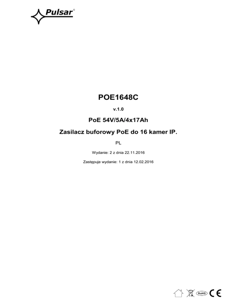 POE1648C v.1.0 PoE 54V/5A/4x17Ah Zasilacz buforowy PoE do 16 kamer IP. PL Wydanie: 2 z dnia 22.11.2016 Zastępuje wydanie: 1 z dnia 12.02.2016 www.pulsar.pl POE1648C Cechy zasilacza: bezprzerwowe zasilanie DC 54V do 16 kamer IP miejsce na akumulatory 4x17Ah/12V szeroki zakres napięcia zasilania AC: 176÷264V wysoka sprawność 85% kontrola ładowania i konserwacji akumulatora ochrona akumulatora przed nadmiernym rozładowaniem (UVP) prąd ładowania akumulatora 0,5A zabezpieczenie wyjścia akumulatora przed zwarciem i odwrotnym podłączeniem przeznaczony do pracy w sieciach 10Mbit/s i 100Mbit/s sygnalizacja optyczna LED zabezpieczenia: przeciwzwarciowe SCP nadnapięciowe OVP przepięciowe antysabotażowe przeciążeniowe OLP gwarancja – 2 lata od daty produkcji Przykład zasilania 16 kamer IP. 54V DC/16 x 0,3A SPIS TREŚCI: 1. Opis techniczny. 1.1. Opis ogólny 1.2. Schemat blokowy 1.3. Opis elementów i złącz zasilacza 1.4. Parametry techniczne 2. Instalacja. 2.1. Wymagania 2.2. Procedura instalacji 3. Sygnalizacja pracy zasilacza. 4. Obsługa oraz eksploatacja. 4.1. Przeciążenie lub zwarcie wyjścia zasilacza 4.2. Praca bateryjna 4.3. Konserwacja 2 www.pulsar.pl 1. POE1648C Opis techniczny. 1.1. Opis ogólny. Zasilacz przeznaczony jest do zasilania maksymalnie 16 kamer internetowych wymagających stabilizowanego napięcia 48V DC (+/-15%). Zasilacz dostarcza napięcia 54V DC o wydajności prądowej I=16x0,3A+0,5A ładowanie akumulatora*. W przypadku zaniku napięcia sieciowego następuje natychmiastowe przełączenie na zasilanie akumulatorowe. Zasilacz skonstruowany jest w oparciu o moduł zasilacza impulsowego, o wysokiej sprawności energetycznej umieszczony w obudowie metalowej (kolor RAL 9003) z miejscem na akumulatory 4x17Ah/12V. Obudowa wyposażona jest w mikroprzełącznik sygnalizujący otwarcie drzwiczek (czołówki). Zasilanie do kamer jest dostarczane przy pomocy okablowania sieciowego z wykorzystaniem pary 4/5 (+) i 7/8 (-) które zgodnie ze standardem sieci Ethernet nie są wykorzystywane do transmisji danych (transmisja danych odbywa się z wykorzystaniem pary 1/2 i 3/6). Zasilacz nie może być wykorzystany w sieciach Gigabit Ethernet, gdzie wszystkie pary skrętki biorą udział w transmisji danych! W czasie normalnej eksploatacji suma prądów pobieranych przez odbiorniki nie może przekroczyć I=16x0,3A. Maksymalny prąd ładowania akumulatora wynosi 0,5A. Sumaryczny prąd odbiorników + akumulator wynosi max. 5A*. 1.2. Schemat blokowy. Rys. 1. Schemat blokowy zasilacza. 1.3. Opis elementów i złącz zasilacza. Tabela 1. Element nr [Rys. 2] Opis [1] IN – złącze śrubowe, wejście zasilania modułu (podłączenie fabryczne) [2] DC LED czerwona – sygnalizacja obecności napięcia na wejściu IN [3] Złącze dodatkowej, zewnętrznej sygnalizacji optycznej (podłączenie fabryczne) [4] PoE 1 ÷ PoE4 - wyjścia sieciowe (Ethernet + zasilanie) – do podłączenia kamer [5] LAN1 ÷ LAN4 - wejścia sieciowe (Ethernet) – do podłączenia przełącznika sieciowego Ethernet Switch [6] Listwa montażowa Tab. 1. Opis elementów modułu PoE. * Patrz wykres 1. 3 www.pulsar.pl POE1648C Rys. 2. Rozmieszczenie elementów. Rys. 3. Widok zasilacza. Element nr [Rys. 3] [1] Opis Moduł zasilacza impulsowego [2] L-N złącze zasilania 230V AC, [3] Dioda LED sygnalizująca poprawną pracę zasilacza impulsowego [4] Potencjometr ADJ. – regulacja napięcia wyjściowego zasilacza [5] Moduł PoE [6] Konektory do podłączenia akumulatorów: +BAT = czerwony, - BAT = czarny [7] TAMPER – mikrowyłącznik (styki) ochrony antysabotażowej (NC) Tab. 2. Elementy zasilacza (patrz rys. 3). 1.4 Parametry techniczne. - parametry elektryczne (tab.3) - parametry mechaniczne (tab.4) - bezpieczeństwo użytkowania (tab.5) - parametry eksploatacyjne (tab.6) 4 Złącze ochrony PE www.pulsar.pl POE1648C Parametry elektryczne (tab. 3). Napięcie zasilania Pobór prądu Moc zasilacza Sprawność Napięcie wyjściowe Zakres regulacji napięcia wyjściowego Prąd wyjściowy tAMB<30°C Prąd wyjściowy tAMB=40°C Napięcie tętnienia Pobór prądu przez układy zasilacza Prąd ładowania akumulatora Zabezpieczenie przed zwarciem SCP Zabezpieczenie przed przeciążeniem OLP Zabezpieczenie w obwodzie akumulatora SCP i odwrotna polaryzacja podłączenia Zabezpieczenie nadnapięciowe OVP Zabezpieczenie akumulatora przed nadmiernym rozładowaniem UVP: Zabezpieczenie przepięciowe Zabezpieczenie antysabotażowe: - TAMPER wyjście sygnalizujące otwarcie obudowy zasilacza Optyczna sygnalizacja pracy: 176÷264V AC 1,5A@230V AC typ. 270W max. 85% 44V÷ 54V DC – praca buforowa 38V÷ 54V DC – praca bateryjna 48÷56V DC 16 x 0,3A + 0,5A ładowanie akumulatora – patrz wykres 1 16 x 0,2A + 0,5A ładowanie akumulatora – patrz wykres 1 150 mV p-p max. 150mA 0,5A 105% ÷ 150% mocy zasilacza, automatyczny powrót 105% ÷ 150% mocy zasilacza, automatyczny powrót bezpiecznik topikowy >62V (zadziałanie wymaga odłączenia napięcia zasilania na czas min. 20 s.) U<38V (± 5%) – odłączenie zacisku akumulatora warystor - microswitch, styki NC (obudowa zamknięta), 0,5A@50V DC (max.) TAK – diody LED Parametry mechaniczne (tab. 4). Wymiary obudowy 420 x 373 x 181+14 mm (WxHxD) Mocowanie patrz rysunek 3 Miejsce na akumulator 4x17Ah/12V (SLA) max. 415x170x170mm (WxHxD) max Waga netto Obudowa Zamykanie Złącza Uwagi H W D 7,70kg / 8,30kg Blacha stalowa DC01, 1,0mm, RAL 9003 Wkręt walcowy x 2 (z czoła), możliwość montażu zamka Zasilacz impulsowy: Φ0,63-2,5 (AWG 22-10) Wyjścia LAN/PoE 1...16: RJ45 8pin Wyjscie TAMPER: Φ0,8 Obudowa posiada dystans od podłoża montażowego w celu prowadzenia okablowania – 14mm. Chłodzenie zasilacza: wymuszone (wentylator) Bezpieczeństwo użytkowania (tab.5). Klasa ochronności PN-EN 60950-1:2007 Stopień ochrony PN-EN 60529: 2002 (U) Wytrzymałość elektryczna izolacji: - pomiędzy obwodem wejściowym (sieciowym) a obwodami wyjściowymi zasilacza (I/P-O/P) - pomi