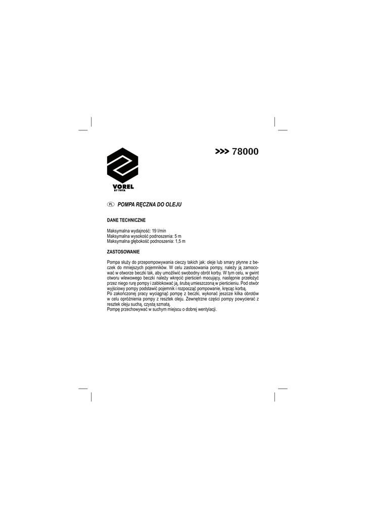 78000 PL POMPA RĘCZNA DO OLEJU DANE TECHNICZNE Maksymalna wydajność: 19 l/min Maksymalna wysokość podnoszenia: 5 m Maksymalna głębokość podnoszenia: 1,5 m ZASTOSOWANIE Pompa służy do przepompowywania cieczy takich jak: oleje lub smary płynne z beczek do mniejszych pojemników. W celu zastosowania pompy, należy ją zamocować w otworze beczki tak, aby umożliwić swobodny obrót korby. W tym celu, w gwint otworu wlewowego beczki należy wkręcić pierścień mocujący, następnie przełożyć przez niego rurę pompy i zablokować ją, śrubą umieszczoną w pierścieniu. Pod otwór wyjściowy pompy podstawić pojemnik i rozpocząć pompowanie, kręcąc korbą. Po zakończonej pracy wyciągnąć pompę z beczki, wykonać jeszcze kilka obrotów w celu opróżnienia pompy z resztek oleju. Zewnętrzne części pompy powycierać z resztek oleju suchą, czystą szmatą. Pompę przechowywać w suchym miejscu o dobrej wentylacji.