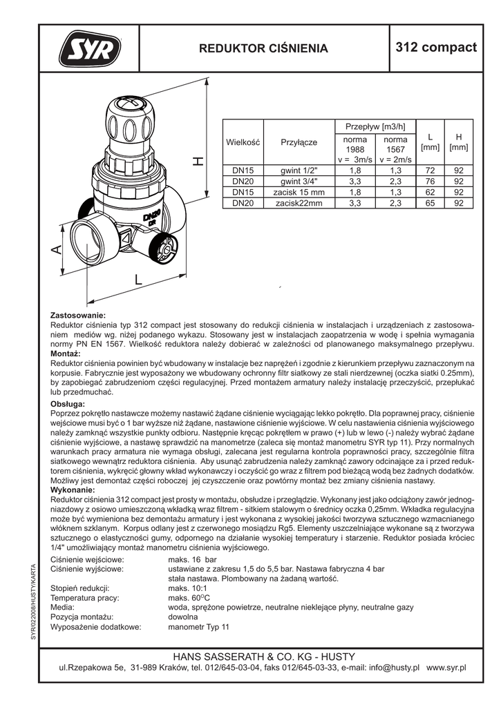 312 compact REDUKTOR CIŚNIENIA SYR/022008/HUSTY/KARTA Przepływ [m3/h] Wielkość Przyłącze DN15 DN20 DN15 DN20 gwint 1/2" gwint 3/4" zacisk 15 mm zacisk22mm norma norma 1988 1567 v = 3m/s v = 2m/s 1,8 1,3 3,3 2,3 1,8 1,3 3,3 2,3 L [mm] H [mm] 72 76 62 65 92 92 92 92 Zastosowanie: Reduktor ciśnienia typ 312 compact jest stosowany do redukcji ciśnienia w instalacjach i urządzeniach z zastosowaniem mediów wg. niżej podanego wykazu. Stosowany jest w instalacjach zaopatrzenia w wodę i spełnia wymagania normy PN EN 1567. Wielkość reduktora należy dobierać w zależności od planowanego maksymalnego przepływu. Montaż: Reduktor ciśnienia powinien być wbudowany w instalacje bez naprężeń i zgodnie z kierunkiem przepływu zaznaczonym na korpusie. Fabrycznie jest wyposażony we wbudowany ochronny filtr siatkowy ze stali nierdzewnej (oczka siatki 0.25mm), by zapobiegać zabrudzeniom części regulacyjnej. Przed montażem armatury należy instalację przeczyścić, przepłukać lub przedmuchać. Obsługa: Poprzez pokrętło nastawcze możemy nastawić żądane ciśnienie wyciągając lekko pokrętło. Dla poprawnej pracy, ciśnienie wejściowe musi być o 1 bar wyższe niż żądane, nastawione ciśnienie wyjściowe. W celu nastawienia ciśnienia wyjściowego należy zamknąć wszystkie punkty odbioru. Następnie kręcąc pokrętłem w prawo (+) lub w lewo (-) należy wybrać żądane ciśnienie wyjściowe, a nastawę sprawdzić na manometrze (zaleca się montaż manometru SYR typ 11). Przy normalnych warunkach pracy armatura nie wymaga obsługi, zalecana jest regularna kontrola poprawności pracy, szczególnie filtra siatkowego wewnątrz reduktora ciśnienia. Aby usunąć zabrudzenia należy zamknąć zawory odcinające za i przed reduktorem ciśnienia, wykręcić głowny wkład wykonawczy i oczyścić go wraz z filtrem pod bieżącą wodą bez żadnych dodatków. Możliwy jest demontaż części roboczej jej czyszczenie oraz powtórny montaż bez zmiany ciśnienia nastawy. Wykonanie: Reduktor ciśnienia 312 compact jest prosty w montażu, obsłudze i przeglądzie. Wykonany jest jako odciążony zawór jednogniazdowy z osiowo umieszczoną wkładką wraz filtrem - sitkiem stalowym o średnicy oczka 0,25mm. Wkładka regulacyjna może być wymieniona bez demontażu armatury i jest wykonana z wysokiej jakości tworzywa sztucznego wzmacnianego włóknem szklanym. Korpus odlany jest z czerwonego mosiądzu Rg5. Elementy uszczelniające wykonane są z tworzywa sztucznego o elastyczności gumy, odpornego na działanie wysokiej temperatury i starzenie. Reduktor posiada króciec 1/4" umożliwiający montaż manometru ciśnienia wyjściowego. Ciśnienie wejściowe: maks. 16 bar Ciśnienie wyjściowe: ustawiane z zakresu 1,5 do 5,5 bar. Nastawa fabryczna 4 bar stała nastawa. Plombowany na żadaną wartość. Stopień redukcji: maks. 10:1 Temperatura pracy: maks. 60OC Media: woda, sprężone powietrze, neutralne nieklejące płyny, neutralne gazy Pozycja montażu: dowolna Wyposażenie dodatkowe: manometr Typ 11 HANS SASSERATH & CO. KG - HUSTY ul.Rzepakowa 5e, 31-989 Kraków, tel. 012/645-03-04, faks 012/645-03-33, e-mail: [email protected] www.syr.pl Wkładka reduktora ciśnienia 0312.20.955 Korek manometru 0828.08.000