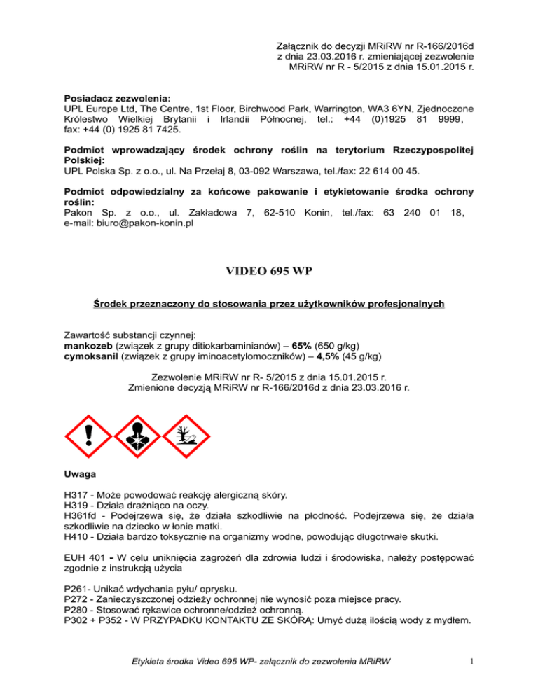 Załącznik do decyzji MRiRW nr R-166/2016d z dnia 23.03.2016 r. zmieniającej zezwolenie MRiRW nr R - 5/2015 z dnia 15.01.2015 r. Posiadacz zezwolenia: UPL Europe Ltd, The Centre, 1st Floor, Birchwood Park, Warrington, WA3 6YN, Zjednoczone Królestwo Wielkiej Brytanii i Irlandii Północnej, tel.: +44 (0)1925 81 9999, fax: +44 (0) 1925 81 7425. Podmiot wprowadzający środek ochrony roślin na terytorium Rzeczypospolitej Polskiej: UPL Polska Sp. z o.o., ul. Na Przełaj 8, 03-092 Warszawa, tel./fax: 22 614 00 45. Podmiot odpowiedzialny za końcowe pakowanie i etykietowanie środka ochrony roślin: Pakon Sp. z o.o., ul. Zakładowa 7, 62-510 Konin, tel./fax: 63 240 01 18, e-mail: [email protected] VIDEO 695 WP Środek przeznaczony do stosowania przez użytkowników profesjonalnych Zawartość substancji czynnej: mankozeb (związek z grupy ditiokarbaminianów) – 65% (650 g/kg) cymoksanil (związek z grupy iminoacetylomoczników) – 4,5% (45 g/kg) Zezwolenie MRiRW nr R- 5/2015 z dnia 15.01.2015 r. Zmienione decyzją MRiRW nr R-166/2016d z dnia 23.03.2016 r. Uwaga H317 - Może powodować reakcję alergiczną skóry. H319 - Działa drażniąco na oczy. H361fd - Podejrzewa się, że działa szkodliwie na płodność. Podejrzewa się, że działa szkodliwie na dziecko w łonie matki. H410 - Działa bardzo toksycznie na organizmy wodne, powodując długotrwałe skutki. EUH 401 - W celu uniknięcia zagrożeń dla zdrowia ludzi i środowiska, należy postępować zgodnie z instrukcją użycia P261- Unikać wdychania pyłu/ oprysku. P272 - Zanieczyszczonej odzieży ochronnej nie wynosić poza miejsce pracy. P280 - Stosować rękawice ochronne/odzież ochronną. P302 + P352 - W PRZYPADKU KONTAKTU ZE SKÓRĄ: Umyć dużą ilością wody z mydłem. Etykieta środka Video 695 WP- załącznik do zezwolenia MRiRW 1 P305 + P351 + P338 - W PRZYPADKU DOSTANIA SIĘ DO OCZU: Ostrożnie płukać wodą przez kilka minut. Wyjąć soczewki kontaktowe, jeżeli są i można je łatwo usunąć. Nadal płukać. P333 + P313 - W przypadku wystąpienia podrażnienia skóry lub wysypki: Zwrócić się po pomoc do lekarza. P337 + P313 – W przypadku utrzymywania się działania drażniącego na oczy: Zasięgnąć porady/ zgłosić się pod opiekę lekarza. P363 - Wyprać zanieczyszczoną odzież przed ponownym użyciem. P308 + P313 - W przypadku narażenia lub styczności: Zwrócić się po pomoc/poradę do lekarza. Zebrać rozsypany produkt. OPIS DZIAŁANIA Video 695 WP jest środkiem grzybobójczym w formie proszku do sporządzania zawiesiny wodnej o działaniu wgłębnym i powierzchniowym, do stosowania zapobiegawczego i interwencyjnego w ochronie ziemniaka w gruncie przed zarazą ziemniaka. Środek przeznaczony do stosowania przy użyciu opryskiwaczy polowych. STOSOWANIE ŚRODKA Ziemniak zaraza ziemniaka Maksymalna dawka dla jednorazowego zastosowania: 2,25 kg/ha Zalecana dawka dla jednorazowego zastosowania: 2,25 kg/ha Termin stosowania: Środek stosować od końca fazy zakrywania międzyrzędzi (około 90% zakrycia powierzchni gleby) do fazy początku żółknięcia liści (BBCH 39-91). Pierwszy zabieg wykonać zgodnie z sygnalizacją lub gdy występuje ryzyko infekcji. Po wykonaniu pierwszego zabiegu środkiem o działaniu układowym lub środkiem Video 695 WP, następne zabiegi wykonywać w miarę potrzeby co 7-10 dni. Krótszy z podanych odstęp pomiędzy zabiegami zachować w warunkach większego zagrożenia patogenem oraz na odmianach bardziej podatnych na zarazę ziemniaka. Maksymalna liczba zabiegów w sezonie wegetacyjnym: 4 Odstęp między zabiegami: co najmniej 7 dni. Zalecana ilość wody: 200-600 l/ha Zalecane opryskiwanie: drobnokropliste Większą ilość wody stosować w uprawach zagęszczonych lub o silnie rozwiniętych łętach. ŚRODKI OSTROŻNOŚCI PRAKTYKĄ ROLNICZĄ I ZALECENIA STOSOWANIA ZWIĄZANE Z DOBRĄ 1. Warunkiem skuteczności zabiegu jest dokładne pokrycie roślin cieczą użytkową. 2. Wielokrotne stosowanie środków grzybobójczych zawierających substancje czynne o tym samym mechanizmie działania może przyczynić się do wyselekcjonowania w populacji sprawcy choroby form odpornych i w konsekwencji obniżenia skuteczności zabiegów. Z tego też względu w ramach strategii antyodpornościowej zaleca się: - włączenie do programu ochrony ziemniaka przed zarazą ziemniaka środków zawierających substancje czynne o różnych mechanizmach działania, - wybór środków zawierających substancję czynną cymoksanil do maksymalnie połowy przewidzianych w sezonie zabiegów. SPORZĄDZANIE CIECZY UŻYTKOWEJ Etykieta środka Video 695 WP- załącznik do zezwolenia MRiRW 2 Przed przystąpieniem do sporządzania cieczy użytkowej dokładnie ustalić potrzebną jej ilość. Odważoną ilość środka wymieszać w osobnym naczyniu z małą ilością wody, następnie wlać przez sito do zbiornika opryskiwacza napełnionego częściowo wodą (z włączonym mieszadłem) i uzupełnić wodą do potrzebnej ilości. Po wlaniu cieczy użytkowej do zbiornika opryskiwacza niewyposażonego w mieszadło hydrauliczne ciecz mechaniczne wymieszać. Opryskiwać z włączonym mieszadłem. Opróżnione opakowania po środku przepłukać trzykrotnie wodą, a popłuczyny wlać do zbiornika opryskiwacza z cieczą użytkową. POSTĘPOWANIE Z RESZTKAMI CIECZY UŻYTKOWEJ I MYCIE APARATURY Z resztkami cieczy użytkowej po zabiegu należy postępować w sposób ograniczający ryzyko skażenia wód powierzchniowych i podziemnych w rozumieniu przepisów Prawa wodnego oraz skażenia gruntu, tj.: – po uprzednim rozcieńczeniu zużyć na powierzchni, na której przeprowadzono zabieg, jeżeli jest to możliwe lub – unieszkodliwić z wykorzystaniem rozwiązań technicznych zapewniających biologiczną degradację substancji czynnych środków ochrony roślin, lub – unieszkodliwić w inny sposób, zgodny z przepisami o odpadach. Po pracy aparaturę dokładnie wymyć. WARUNKI BEZPIECZNEGO STOSOWANIA ŚRODKA Przed za