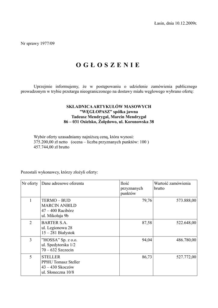 Łasin, dnia 10.12.2009r. Nr sprawy 1977/09 OGŁOSZENIE Uprzejmie informujemy, że w postępowaniu o udzielenie zamówienia publicznego prowadzonym w trybie przetargu nieograniczonego na dostawy miału węglowego wybrano ofertę: SKŁADNICA ARTYKUŁÓW MASOWYCH ”WĘGLOPASZ” spółka jawna Tadeusz Mendrygał, Marcin Mendrygał 86 – 031 Osielsko, Żołędowo, ul. Koronowska 38 Wybór oferty uzasadniamy najniższą ceną, która wynosi: 375.200,00 zł netto (ocena – liczba przyznanych punktów: 100 ) 457.744,00 zł brutto Pozostali wykonawcy, którzy złożyli oferty: Nr oferty Dane adresowe oferenta Ilość przyznanych punktów Wartość zamówienia brutto 1 TERMO – BUD MARCIN ANBILD 47 – 400 Racibórz ul. Mikołaja 9b 79,76 573.888,00 2 BARTER S.A. ul. Legionowa 28 15 – 281 Białystok 87,58 522.648,00 3 ”HOSSA” Sp. z o.o. ul. Spedytorska 1/2 70 – 632 Szczecin 94,04 486.780,00 5 STELLER PPHU Tomasz Steller 43 – 430 Skoczów ul. Słoneczna 10/8 86,73 527.772,00 6 TRANSPORT, USŁUGI, HANDEL skład opału, mat. bud., skup złomu Tadeusz Decka 83 – 132 Morzeszczyn, Osiedle XXX-Lecia PRL 1 90,24 507.276,00 7 ”GS” Robert Sip, Monika Glezner Sp.j. ul. 29. Grudnia 2c 63 – 460 Nowe Skalmierzyce 75,50 606.305,84 9 Transport Handel Marek Hawrylak 41 – 800 Zabrze ul. Kotarbińskiego 10/4 81,21 563.640,00 11 Przedsiębiorstwo Usługowo – Handlowe ”TOREC” Sp. z o.o. 87 – 100 Toruń ul. Ceramiczna 6 91,16 502.152,00 12 SKŁAD OPAŁU ”U ANTKA” Hanna Burkacka ul. Dębowa 10 86 – 300 Grudziądz 70,90 645.624,00 13 PW „SAABAT” Sp. z o.o. ul. Pułaskiego 35 85 – 619 Bydgoszcz 73,42 623.420,00 Z postępowania wykluczono następujących oferentów: 8 BARTEX Sp. z o.o. 14 – 526 Płoskinia Chruściel 4 Oddział Bydgoszcz 85 – 451 Bydgoszcz ul. Grunwaldzka 207 Oferenta nie oceniono z powodu wykluczenia zgodnie z art. 24 ust. 2 pkt. 3 Ustawy Prawo zamówień publicznych. 491.904,00 10 ”TRANSBUD” sp.j. 84 – 240 Reda ul. Gdańska 78a Oferenta nie oceniono z powodu wykluczenia zgodnie z art. 24 ust. 2 pkt. 3 Ustawy Prawo zamówień publicznych. 510.692,00