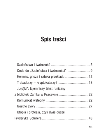 Szaleństwo i twórczość Spis treści Szaleństwo i twórczość ........................................... 5 Coda do „Szaleństwa i twórczości” ......................... 9 Hermes, gnoza i sztuka przekładu ..........................12 Trubadurzy – kryptokatarzy? .................................18 „L(o)ki”: tajemniczy tekst runiczny z biblioteki Zamku w Pszczynie .................................22 Komunikat wstępny ...............................................22 Goethe żywy ..........................................................27 Utopia i profesja, czyli dwie dusze Fryderyka Schillera ...................................................43 421 Spis treści Prawdy szukamy obaj ............................................79 Novalis, czyli ziarno przyszłości ...........................108 Gnoza, indywidualny mit i „tantra” Williama Blake’a .....................................................154 Gustaw Meyrink – „Szatan z Pragi” (i jego Golem) ........................................................160 Franz Kafka, nicość i Nicość ................................194 Hermanna Hessego Spirala Życia ........................198 Utopia i tragedia Hermanna Hessego: Gra szklanych paciorków........................................239 Po trzykroć romantyczny „Mistrz” .......................246 Stwory, bestie i zwierzęta ....................................256 W zoo symbolicznym, ale praktycznym ...............268 Kuncewicz, czyli podwójna pokusa antyku...........270 Moje encyklopedie ...............................................278 Zmiana kodu. Glosa .............................................283 Outsidera wspomnienie z początków „Współczesności” ..............................286 422 Spis treści Ecce Homo. O Maksymilianie Wołoszynie, poecie i antropozofie ..............................................293 Armata Pachelbela, czyli dna i szczyty literatury okultystycznej .............298 Pośmiertny sen miłości chłopców .......................310 O teatrze zapis rozmowy ......................................314 Wino, bogowie i krew ..........................................324 Co się przyśniło Dänikenowi? ..............................326 Szekspirowska Burza – sztuka ezoteryczno-polityczna ...........................................332 „Samuel Zborowski” – sztuka heretycka ..............341 Noc z Grotowskim ...............................................348 Zagadki Ingmara Bergmana .................................352 Chłopiec wśród potworów, czyli film gnostycki .................................................362 „Misja” i parę przeklętych problemów ..................367 Demony są wśród nas .........................................384 Tajemnica wampira ..............................................389 423 Spis treści „Potwór” Frankensteina: stworzenie, które cierpi i wzdycha do odrodzenia ......................397 Paradoksalny świat Matrixa .................................406 Mariusz Dobkowski. Matrix, czyli filmowe odczytanie gnozy ..............................413 424