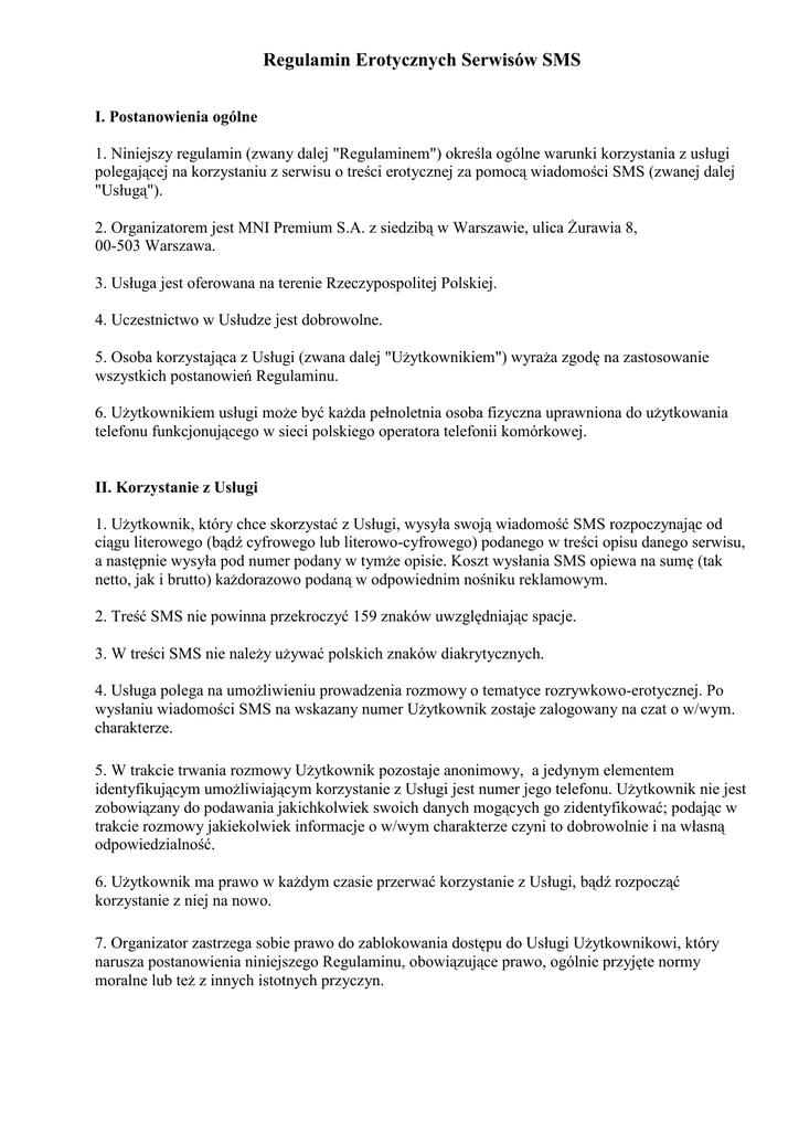 Regulamin Erotycznych Serwisów SMS I. Postanowienia ogólne 1. Niniejszy regulamin (zwany dalej "Regulaminem") określa ogólne warunki korzystania z usługi polegającej na korzystaniu z serwisu o treści erotycznej za pomocą wiadomości SMS (zwanej dalej "Usługą"). 2. Organizatorem jest MNI Premium S.A. z siedzibą w Warszawie, ulica Żurawia 8, 00-503 Warszawa. 3. Usługa jest oferowana na terenie Rzeczypospolitej Polskiej. 4. Uczestnictwo w Usłudze jest dobrowolne. 5. Osoba korzystająca z Usługi (zwana dalej "Użytkownikiem") wyraża zgodę na zastosowanie wszystkich postanowień Regulaminu. 6. Użytkownikiem usługi może być każda pełnoletnia osoba fizyczna uprawniona do użytkowania telefonu funkcjonującego w sieci polskiego operatora telefonii komórkowej. II. Korzystanie z Usługi 1. Użytkownik, który chce skorzystać z Usługi, wysyła swoją wiadomość SMS rozpoczynając od ciągu literowego (bądź cyfrowego lub literowo-cyfrowego) podanego w treści opisu danego serwisu, a następnie wysyła pod numer podany w tymże opisie. Koszt wysłania SMS opiewa na sumę (tak netto, jak i brutto) każdorazowo podaną w odpowiednim nośniku reklamowym. 2. Treść SMS nie powinna przekroczyć 159 znaków uwzględniając spacje. 3. W treści SMS nie należy używać polskich znaków diakrytycznych. 4. Usługa polega na umożliwieniu prowadzenia rozmowy o tematyce rozrywkowo-erotycznej. Po wysłaniu wiadomości SMS na wskazany numer Użytkownik zostaje zalogowany na czat o w/wym. charakterze. 5. W trakcie trwania rozmowy Użytkownik pozostaje anonimowy, a jedynym elementem identyfikującym umożliwiającym korzystanie z Usługi jest numer jego telefonu. Użytkownik nie jest zobowiązany do podawania jakichkolwiek swoich danych mogących go zidentyfikować; podając w trakcie rozmowy jakiekolwiek informacje o w/wym charakterze czyni to dobrowolnie i na własną odpowiedzialność. 6. Użytkownik ma prawo w każdym czasie przerwać korzystanie z Usługi, bądź rozpocząć korzystanie z niej na nowo. 7. Organizator zastrzega sobie prawo do zablokowania dostępu do Usługi Użytkownikowi, który narusza postanowienia niniejszego Regulaminu, obowiązujące prawo, ogólnie przyjęte normy moralne lub też z innych istotnych przyczyn. III. Postanowienia końcowe 1. Usługa jest dostępna w sieciach polskich operatorów telefonii komórkowej (T-Mobile, Plus GSM, Orange, P4), zarówno w systemie prepaid, jak i postpaid (abonamentowym). Do korzystania z Usługi nie mają zastosowania ulgi dla grup abonentów na opłaty abonamentowe oraz usługi dodatkowe. 2. Organizator dołoży wszelkich starań w celu zapewnienia prawidłowego działania Usługi. 3. Wysyłając swój SMS Użytkownik wyraża jednocześnie zgodę na otrzymywanie od Organizatora wiadomości aktywizująco-informacyjnych oraz przetwarzanie jego numeru telefonu (rozumianego jako dana osobowa). 4. Organizator nie ponosi odpowiedzialności za: a) treść wiadomości SMS wysyłanych przez Użytkownika w ramach korzystania z Usługi, b) korzystanie z Usługi przez osoby niepełnoletnie oraz osoby nieuprawnione do użytkowania telefonu komórkowego, c) szkody spowodowane nieprawidłowym korzystaniem przez Użytkownika z Usługi, d) wiadomości SMS, które zostały nadane przez Użytkownika w sposób nieprawidłowy, a w szczególności uniemożliwiające mu prawidłowe zalogowanie się do wybranego serwisu, e) ewentualny dyskomfort psychiczno-moralny, jaki może zostać potencjalnie wywołany poprzez treści otrzymywane w trakcie rozmowy na czacie, f) za błędy lub przekłamania występujące w trakcie rozmowy, jeśli przyczyną tej sytuacji były błędy lub problemy techniczne leżące po stronie podmiotów trzecich, ze szczególnym uwzględnieniem operatorów telefonii komórkowej, g) korzystanie z Usługi przez Użytkowników niezgodnie z postanowieniami niniejszego Regulaminu lub bez zapoznania się z Regulaminem, w tym zwłaszcza wynikające z niewłaściwego zrozumienia przez Użytkownika charakteru Usługi oraz związanych z tym postanowień regulaminowych, przerwy w świadczeniu Usługi zaistniałe z przyczyn technicznych (np. konserwacja, przegląd, wymiana sprzętu) lub niezależnych od Organizatora, h) korzystanie z Usługi przez Użytkowników niezgodnie z postanowieniami niniejszego Regulaminu lub bez zapoznania się z Regulaminem, w tym zwłaszcza wynikające z niewłaściwego zrozumienia przez Użytkownika charakteru Usługi, przerwy w świadczeniu Usługi zaistniałe z przyczyn technicznych (np. konserwacja, przegląd, wymiana sprzętu) lub niezależnych od Organizatora. 5. Organizator zastrzega, iż treści zamieszczone w materiałach reklamowych nie mają charakteru oferty, jak i nie jest w stanie zagwarantować, iż rezultatem rozmowy prowadzonej przez Użytkownika będzie zadzierzgnięcie bezpośredniej formy kontaktu w jakiejkolwiek formie. Wszelkie ewentualne działania podjęte przez Użytkownika na skutek przeprowadzonej rozmowy są dobrowolne, a Organizator nie ponosi za nie odpowiedzialności. 6. Organizator zastrzega sobie prawo zmiany postanowień Regulaminu w razie zmiany przepisów prawnych lub z innej przyczyny. Regulamin w zmienionej formie obowiązuje od chwili podania do wiadomości Użytkowników Usługi. 7. Reklamacje dotyczące Usługi należy zgłaszać pisemnie pod adresem email: [email protected]