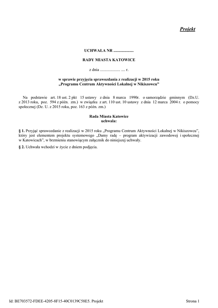 Projekt UCHWAŁA NR .................... RADY MIASTA KATOWICE z dnia .................... .... r. w sprawie przyjęcia sprawozdania z realizacji w 2015 roku „Programu Centrum Aktywności Lokalnej w Nikiszowcu” Na podstawie art. 18 ust. 2 pkt 15 ustawy z dnia 8 marca 1990r. o samorządzie gminnym (Dz.U. z 2013 roku, poz. 594 z późn. zm.) w związku z art. 110 ust. 10 ustawy z dnia 12 marca 2004 r. o pomocy społecznej (Dz. U. z 2015 roku, poz. 163 z późn. zm.) Rada Miasta Katowice uchwala: § 1. Przyjąć sprawozdanie z realizacji w 2015 roku „Programu Centrum Aktywności Lokalnej w Nikiszowcu”, który jest elementem projektu systemowego „Damy radę – program aktywizacji zawodowej i społecznej w Katowicach”, w brzmieniu stanowiącym załącznik do niniejszej uchwały. § 2. Uchwała wchodzi w życie z dniem podjęcia. Id: BE703572-FDEE-4205-8F15-40C0139C58E5. Projekt Strona 1 Sprawozdanie końcowe z realizacji programu Centrum Aktywności Lokalnej w Nikiszowcu, przyjętego Uchwałą Rady Miasta Katowice nr XLVII/1097/14 z dnia 26.03.2014r. oraz uchwałą zmieniającą nr VII/119/15/ z dnia 01.04.2015r. Id: BE703572-FDEE-4205-8F15-40C0139C58E5. Projekt Strona 1 I. WSTĘP Program Centrum Aktywności Lokalnej w Nikiszowcu (PCAL Nikiszowiec) był realizowany od 01.06.2008r. w ramach projektu „Damy radę – program aktywizacji zawodowej i społecznej w Katowicach” i był współfinansowany przez Unię Europejską ze środków Europejskiego Funduszu Społecznego. Od 01 sierpnia 2012r. program realizowany był przez Stowarzyszenie Fabryka Inicjatyw Lokalnych w partnerstwie z Miejskim Ośrodkiem Pomocy Społecznej w Katowicach. Głównym celem programu było podniesienie poziomu integracji społecznej i aktywności lokalnej w osiedlu Nikiszowiec z uwzględnieniem dzielnicy Janów, poprzez m.in. konsolidację, sieciowanie różnych podmiotów działających na rzecz rozwoju lokalnego w dzielnicy oraz wspieranie działań integrujących społeczność Nikiszowca z innymi dzielnicami Katowic. W realizację programu bezpośrednio zaangażowani byli pracownicy Stowarzyszenia FIL oraz pracownik socjalny MOPS Katowice. Zatrudniano także na umowę zlecenie osoby realizujące poszczególne zadania programowe. Korzystano także z usług firm i organizacji prowadzących działalność w zakresie m.in. prowadzenia warsztatów czy realizacji wydarzeń kulturalno – rozrywkowych. Okres realizacji programu to w dużej mierze okres utrwalania się aktywności młodzieży w Nikiszowcu. Inicjatywa rozpoczęta w 2012r. to duże przedsięwzięcie, wymagające znacznie większego zaangażowania, niż wcześniej planowano. Zatem to działalność z i na rzecz młodzieży zdominowała działania programu. Większość działań to szkolenia, warsztaty, edukacja obywatelska, integracja grup młodzieżowych z Nikiszowca i okolic. Uruchomienie Centrum Zimbardo – przestrzeni otwartej na inicjatywy lokalne spowodowało „wysyp” różnych inicjatyw, zgłaszanych przez mieszkańców, które przeradzały się w różne formy aktywności od klubów społecznościowych po inicjatywy artystyczne. Część aktywności w ramach programu została naturalnie ”przeniesiona” do przestrzeni Centrum Zimbardo, która przez samych mieszkańców została szybko zaakceptowana. Akcentowano wręcz „bliskość” tego miejsca dla mieszkańca, brak barier przestrzennych i mentalnych. Spowodowało to powstanie naturalnej „ścieżki” w sercu Nikiszowca, łączącej różne podmioty, tworzącej zalążki sieci lokalnej. W jej skład wchodzą podmioty gastronomiczne (kawiarnie i restauracje), społeczne (PCAL Nikiszowiec i Centrum Zimbardo oraz nieco dalej Parafia św. Anny) i kulturalne (Muzeum Historii Katowic). Na tej osi udało się zrealizować kilka wydarzeń kulturalnych i integracyjnych, co stanowi dobry zaczyn do utrwalania sieci. Duże znaczenie miała realizacja inicjatyw lokalnych, z których wiele udało się podjąć i z dobrym skutkiem zrealizować. Dotyczy to zwłaszcza inicjatyw młodzieżowych. Niektóre – jak choćby inicjatywa powstania Uniwersytetu Trzeciego Wieku - wymaga nieco więcej czasu i przeformułowania, gdyż brak jest na ten moment jeszcze gotowości do pełnego zrealizowania pomysłu. Wiele czasu poświęcono na dyskusję dotyczącą rewitalizacji Nikiszowca i jego najbliższego otoczenia. Podejmowane działania, zwłaszcza w zakresie animacji lokalnej i komunikacji społecznej są zbieżne z założeniami Zintegrowanego Programu Rewitalizacji Nikiszowca. Pełna realizacja któregokolwiek z zaplanowanych w 2011r. projektów, wymaga jednak znacznie większych środków finansowych, prawdopodobnie dostępnych dopiero w nowym okresie finansowania unijnego. Ostatnie miesiące realizacji programu to intensyfikacja działania na osiedlu „Korea”. Pozyskano pierwszych liderów, podjęto Id: BE703572-FDEE-4205-8F15-40C0139C58E5. Projekt Strona 2 się budowania sieci porozumienia pomiędzy mieszkańcami i administracją mieszkaniową w zakresie diagnozy potrzeb społeczności i realizacji inicjatyw lokalnych. Zaplanowano działania środowiskowe, które w dużej mierze będą realizowane już po zakończeniu formalnie realizacji programu. Działania z zakresu rewitalizacji i rozwoju społeczności lokalnej w Nikiszowcu oraz w najbliższym otoczeniu osiedla będą kontynuowane przez Stowarzyszenie FIL także po zakończeniu programu w formule Centrum Społecznościowego. Planowane jest włączenie tych działań w koncepcję projektu „Centrum Społecznościowe w Nikiszowcu”, opracowanego przez Stowarzyszenie FIL, na potrzeby nowego instrumentu finansowania unijnego na lata 2014-2020 - Zintegrowanych Inwestycji Terytorialnych. II. SPOSÓB REALIZACJI. Podobnie jak w latach ubiegłych program kontynuował formułę centrum społecznościowego, w ramach którego oferowana była przestrzeń dla różnych form aktywności. Działania aktywizujące i organizujące społeczność reali