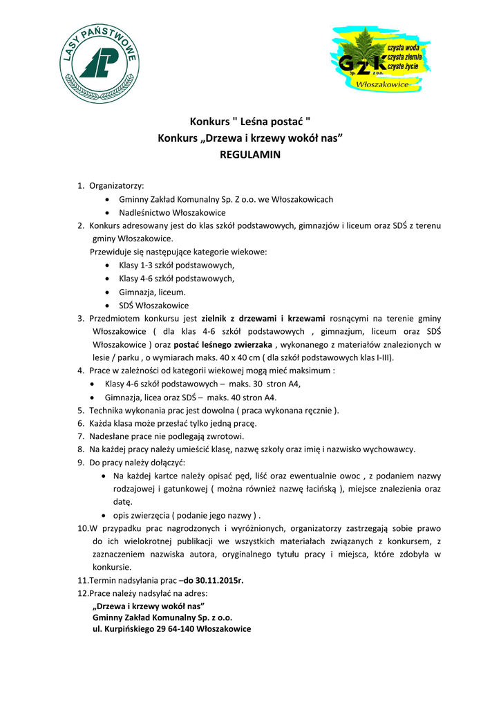 Konkurs " Leśna postać " Konkurs „Drzewa i krzewy wokół nas” REGULAMIN 1. Organizatorzy: Gminny Zakład Komunalny Sp. Z o.o. we Włoszakowicach Nadleśnictwo Włoszakowice 2. Konkurs adresowany jest do klas szkół podstawowych, gimnazjów i liceum oraz SDŚ z terenu gminy Włoszakowice. Przewiduje się następujące kategorie wiekowe: Klasy 1-3 szkół podstawowych, Klasy 4-6 szkół podstawowych, Gimnazja, liceum. SDŚ Włoszakowice 3. Przedmiotem konkursu jest zielnik z drzewami i krzewami rosnącymi na terenie gminy Włoszakowice ( dla klas 4-6 szkół podstawowych , gimnazjum, liceum oraz SDŚ Włoszakowice ) oraz postać leśnego zwierzaka , wykonanego z materiałów znalezionych w lesie / parku , o wymiarach maks. 40 x 40 cm ( dla szkół podstawowych klas I-III). 4. Prace w zależności od kategorii wiekowej mogą mieć maksimum : Klasy 4-6 szkół podstawowych – maks. 30 stron A4, Gimnazja, licea oraz SDŚ – maks. 40 stron A4. 5. Technika wykonania prac jest dowolna ( praca wykonana ręcznie ). 6. Każda klasa może przesłać tylko jedną pracę. 7. Nadesłane prace nie podlegają zwrotowi. 8. Na każdej pracy należy umieścić klasę, nazwę szkoły oraz imię i nazwisko wychowawcy. 9. Do pracy należy dołączyć: Na każdej kartce należy opisać pęd, liść oraz ewentualnie owoc , z podaniem nazwy rodzajowej i gatunkowej ( można również nazwę łacińską ), miejsce znalezienia oraz datę. opis zwierzęcia ( podanie jego nazwy ) . 10.W przypadku prac nagrodzonych i wyróżnionych, organizatorzy zastrzegają sobie prawo do ich wielokrotnej publikacji we wszystkich materiałach związanych z konkursem, z zaznaczeniem nazwiska autora, oryginalnego tytułu pracy i miejsca, które zdobyła w konkursie. 11.Termin nadsyłania prac –do 30.11.2015r. 12.Prace należy nadsyłać na adres: „Drzewa i krzewy wokół nas” Gminny Zakład Komunalny Sp. z o.o. ul. Kurpińskiego 29 64-140 Włoszakowice 13.Organizatorzy powołają komisję konkursową, która oceni prace i wyłoni laureatów. 14. Nagroda główna dla wszystkich kategorii -jednodniowa wycieczka klasowa ( termin do uzgodnienia z wychowawcą lub opiekunem ) 15.Dla zwycięzców pozostałych kategorii (miejsca I-III ) przewidziano atrakcyjne nagrody rzeczowe.