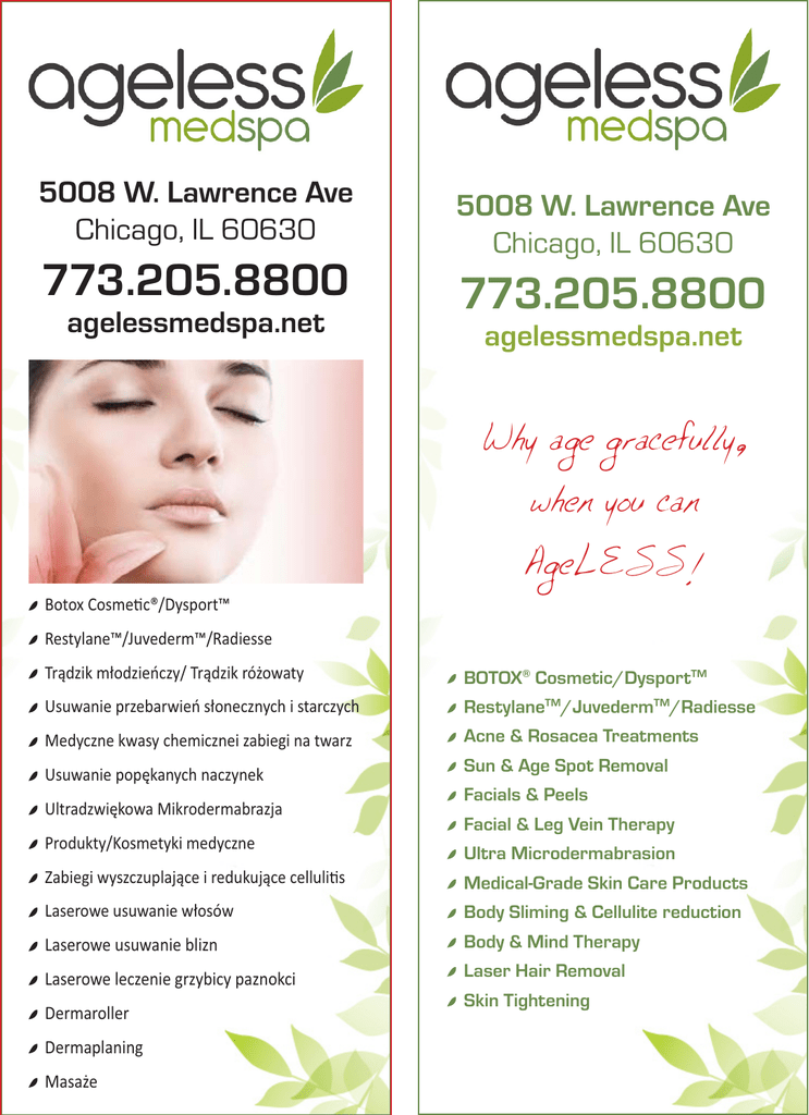 5008 W. Lawrence Ave Chicago, IL 60630 5008 W. Lawrence Ave Chicago, IL 60630 773.205.8800 773.205.8800 agelessmedspa.net agelessmedspa.net Why age gracefully, when you can AgeLESS! Botox Cosmec®/Dysport™ Restylane™/Juvederm™/Radiesse Trądzik młodzieńczy/ Trądzik różowaty BOTOX® Cosmetic/DysportTM Usuwanie przebarwień słonecznych i starczych RestylaneTM/JuvedermTM/Radiesse Medyczne kwasy chemicznei zabiegi na twarz Acne & Rosacea Treatments Usuwanie popękanych naczynek Sun & Age Spot Removal Ultradzwiękowa Mikrodermabrazja Produkty/Kosmetyki medyczne Facials & Peels Facial & Leg Vein Therapy Ultra Microdermabrasion Zabiegi wyszczuplające i redukujące cellulis Medical-Grade Skin Care Products Laserowe usuwanie włosów Body Sliming & Cellulite reduction Laserowe usuwanie blizn Body & Mind Therapy Laserowe leczenie grzybicy paznokci Laser Hair Removal Dermaroller Dermaplaning Masaże Skin Tightening