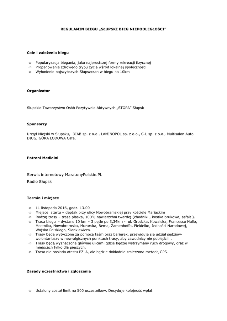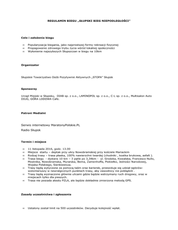 REGULAMIN BIEGU „SŁUPSKI BIEG NIEPODLEGŁOŚCI” Cele i założenia biegu • • • Popularyzacja biegania, jako najprostszej formy rekreacji fizycznej Propagowanie zdrowego trybu życia wśród lokalnej społeczności Wyłonienie najszybszych Słupszczan w biegu na 10km Organizator Słupskie Towarzystwo Osób Pozytywnie Aktywnych „STOPA” Słupsk Sponsorzy Urząd Miejski w Słupsku, DIAB sp. z o.o., LAMINOPOL sp. z o.o., C-L sp. z o.o., Multisalon Auto DIUG, GÓRA LODOWA Cafe. Patroni Medialni Serwis internetowy MaratonyPolskie.PL Radio Słupsk Termin i miejsce • • • • • • • 11 listopada 2016, godz. 13.00 Miejsce startu – deptak przy ulicy Nowobramskiej przy kościele Mariackim Rodzaj trasy – trasa płaska, 100% nawierzchni twardej (chodniki , kostka brukowa, asfalt ). Trasa biegu - dystans 10 km – 3 pętle po 3,34km - ul. Grodzka, Kowalska, Francesco Nullo, Mostnika, Nowobramska, Murarska, Bema, Zamenhoffa, Piekiełko, Jedności Narodowej, Wojska Polskiego, Sienkiewicza. Trasy będą wytyczone za pomocą taśm oraz barierek, przewiduje się udział sędziówwolontariuszy w newralgicznych punktach trasy, aby zawodnicy nie pobłądzili . Trasy będą wyznaczone głównie ulicami gdzie będzie wstrzymany ruch drogowy, oraz w miejscach tylko dla pieszych. Trasa nie posiada atestu PZLA, ale będzie dokładnie zmierzona metodą GPS. Zasady uczestnictwa i zgłoszenia • Ustalony został limit na 500 uczestników. Decyduje kolejność wpłat. • • • • • • • • Zgłoszenia będą dokonywane za pośrednictwem strony www.domtel-sport.pl , www.maratonypolskie.pl oraz na miejscu startu od godziny 11.00 do 12.40 Opłata startowa wynosi : o 20 PLN – do 31 października 2016. Opłata płatna przelewem na konto STOPA Słupsk, ul. Rynek Rybacki 1, BGŻ O/Słupsk 48 2030 0045 1110 0000 0255 2960 z dopiskiem „Bieg Niepodległości, imię i nazwisko” o 40 PLN – między 1 a 9 listopada 2016 płatna przelewem oraz płatna gotówką w dniu zawodów Opłata nie obejmuje pamiątkowej koszulki sportowej. Koszulkę można zamówić za dodatkową opłatą 20 PLN. Wzór koszulki będzie dostępny do obejrzenia na stronie internetowej biegu. Opłata nie podlega zwrotowi. W biegu mogą uczestniczyć biegacze indywidualni, którzy ukończyli 16 rok życia, niezależnie od miejsca zamieszkania, przynależności klubowej i narodowości. Zawodnicy powyżej 18 roku życia podpisują oświadczenie o biegu na własną odpowiedzialność. (Zawodnicy zobowiązani są do przedstawienia zaświadczenia lekarskiego o zdolności do udziału w biegach długodystansowych lub do podpisania oświadczenia udziału na własną odpowiedzialność). Osoby w wieku 16-18 lat (które w dniu biegu nie osiągnęły jeszcze pełnoletności) zobowiązane są do posiadania pozwolenia na udział od rodziców lub prawnych opiekunów, z ich podpisem i nr PESEL. Warunkiem dopuszczenia ich do startu jest obecność rodzica lub opiekuna wraz z dowodem osobistym w momencie weryfikacji zawodnika w biurze zawodów. Pomiar czasu dokonywany będzie elektronicznie przy pomocy chipów. Biuro zawodów będzie mieścić się w Ośrodku Sportowo-Rekreacyjnym przy ul. Niedziałkowskiego 2 . Czynne w dniu imprezy od 9.30 do 12.45 Klasyfikacja końcowa • • • • Organizator przewiduje podział zawodników na 4 kategorie wiekowe M1 i K1 16-35 lat, M2 i K2 36-45 lat, M3 i K3 45-55 lat, M4 i K4 – powyżej 55lat, oraz kategoria open – dla wszystkich uczestników z podziałem na płeć. Osobno będzie prowadzona klasyfikacja Słupszczan i Słupszczanek. Aby być klasyfikowanym w tej klasyfikacji, należy przedłożyć organizatorom przed biegiem dowód osobisty z aktualnym zameldowaniem w Słupsku. Klasyfikacja końcowa oparta na czasie brutto. Wyniki zostaną opublikowane na stronach internetowych www.maratonypolskie.pl, www.stopa.slupsk.pl oraz na stronach UM Słupsk. Klasyfikacje dodatkowe • • W ramach biegu zostaną rozegrane Drużynowe Mistrzostwa Firm Kompozytowych. Firmy zgłaszają drużyny co najmniej trzyosobowe. O kolejności decyduje łączny czas trzech najszybszych osób z drużyny. Regulamin dodatkowej klasyfikacji będzie opublikowany w osobnym dokumencie. W trakcie biegu będzie prowadzona klasyfikacja sprinterów. Regulamin „SPRINTEM DO GÓRY LODOWEJ” będzie opublikowany w osobnym dokumencie. Nagrody • Organizator przewiduje następujące nagrody pieniężne w kategorii open wśród kobiet i mężczyzn: 1 miejsce – 500 PLN, 2 miejsce – 400 PLN, 3 miejsce – 300 PLN. • • • • • • Organizator przewiduje następujące nagrody pieniężne w kategorii najlepszy Słupszczanin/Słupszczanka – 1 miejsce 300 PLN, 2 miejsce 200 PLN, 3 miejsce 100 PLN. Organizator przewiduje 3 nagrody pieniężne po 100 PLN za zajęcie miejsc bonusowych. Miejsca bonusowe zostaną podane tuż przed biegiem. Organizator przewiduje nagrody rzeczowe dla pierwszej trójki w kategoriach wiekowych Nagrody nie dublują się. Każdy uczestnik biegu otrzyma na mecie pamiątkowy odlewany medal. Rozdanie nagród odbędzie się tuż po biegu, ok. godziny 14.30 w Sali OSR przy ulicy Niedziałkowskiego 2. Postanowienia końcowe • • • • • • • • • • • • • • • • Bieg odbędzie się bez względu na pogodę. Uczestnicy mają obowiązek zachowania zasad fair-play podczas trwania biegu i na terenie biegu. Uczestnicy mają obowiązek zachowania szczególnej ostrożności podczas biegu gdyż, odbywa się on w miejscu turystycznych szlaków pieszych. Organizator zastrzega sobie prawo zakończenia przyjmowania zgłoszeń w momencie przekroczenia opłaconych zgłoszeń 500 uczestników. Organizator zapewnia szatnie, prysznice i depozyt. Będą się one znajdowały w OSR przy ulicy Niedziałkowskiego 2. Organizator zapewnia 40 miejsc parkingowych – 40 miejsc przy OSR ul. Niedziałkowskiego 2. Więcej miejsc parkingowych na parkingach publicznych miasta Słupska. Organizator zapewnia p