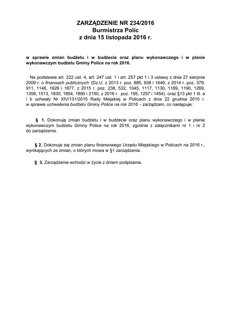ZARZĄDZENIE NR 234/2016 Burmistrza Polic z dnia 15 listopada 2016 r. w sprawie zmian budżetu i w budżecie oraz planu wykonawczego i w planie wykonawczym budżetu Gminy Police na rok 2016. Na podstawie art. 222 ust. 4, art. 247 ust. 1 i art. 257 pkt 1 i 3 ustawy z dnia 27 sierpnia 2009 r. o finansach publicznych (Dz.U. z 2013 r. poz. 885, 938 i 1646, z 2014 r. poz. 379, 911, 1146, 1626 i 1877, z 2015 r. poz. 238, 532, 1045, 1117, 1130, 1189, 1190, 1269, 1358, 1513, 1830, 1854, 1890 i 2150, z 2016 r. poz. 195, 1257 i 1454) oraz §13 pkt 1 lit. a i b uchwały Nr XIV/131/2015 Rady Miejskiej w Policach z dnia 22 grudnia 2015 r. w sprawie uchwalenia budżetu Gminy Police na rok 2016 - zarządzam, co następuje: § 1. Dokonuję zmian budżetu i w budżecie oraz planu wykonawczego i w planie wykonawczym budżetu Gminy Police na rok 2016, zgodnie z załącznikami nr 1 i nr 2 do zarządzenia. § 2. Dokonuje się zmian planu finansowego Urzędu Miejskiego w Policach na 2016 r., wynikających ze zmian, o których mowa w §1 zarządzenia. § 3. Zarządzenie wchodzi w życie z dniem podpisania. Załącznik nr 1 do Zarządzenia Nr 234/2016 Burmistrza Polic z dnia 15.11.2016 r. Zmiana planu dochodów i wydatków budżetowych oraz zmiany w planie wydatków budżetowych, a także zmiany planu wykonawczego i zmiany w planie wykonawczym budżetu Gminy Police na rok 2016. Zadania własne Dochody Dział 852 Rozdział Dysponent 85213 Urząd Miejski Wydział FN § 2030 Razem: Zmniejszenia w zł Zwiększenia w zł 0 8 642 - 8 642 0 8 642 Zmniejszenia w zł Zwiększenia w zł 205 000 10 000 195 000 54 000 42 500 40 500 2 000 5 100 1 300 300 1 500 2 000 - 205 000 10 000 195 000 54 000 42 500 500 30 000 10 000 2 000 5 100 3 100 2 000 Wydatki Dział 700 Rozdział Dysponent 70005 Urząd Miejski Wydział GG § 4390 4510 4590 4600 750 75023 Urząd Miejski Wydział OR 3030 4210 4270 4300 4410 4420 75075 Urząd Miejski Wydział PW 4090 4120 4170 4190 4210 4300 75095 Urząd Miejski Wydział FP Urząd Miejski Wydział FP PROJEKT: Przygotowanie programu rewitalizacji Urząd Miejski Wydział PW 754 6 400 2 000 2 000 - 100 100 4127 - 100 4307 100 - 4 300 1 500 300 1 500 1 000 5 889 1 380 3 000 1 509 5 000 4 300 3 300 1 000 5 889 605 380 1 4 903 0 5 000 - 75 815 0 84 457 8 642 - 8 642 30 000 30 000 45 000 20 000 10 000 15 000 815 315 500 30 000 30 000 45 000 45 000 815 815 - 4170 4300 4090 4120 4170 4190 4210 4300 75412 Urząd Miejski Wydział SO 758 6 400 2 000 2 000 4220 4270 4300 4360 4430 4440 4700 75818 Urząd Miejski Wydział TI Rezerwa celowa na wydatki inwestycyjne 6800 852 85213 Ośrodek Pomocy Społecznej w Policach 4130 85214 Ośrodek Pomocy Społecznej w Policach 3110 4330 85219 Ośrodek Pomocy Społecznej w Policach 4010 4110 4120 4210 85228 Ośrodek Pomocy Społecznej w Policach 3020 4270 4700 853 85305 6 900 6 900 2830 6 900 - 4210 - 6 900 15 000 7 000 20 000 0 7 000 - 0 15 000 6230 - 15 000 Urząd Miejski Wydział OŚ 4210 4300 8 000 8 000 2 000 6 000 5 000 0 - Urząd Miejski Wydział TI 6050 0 5 000 29 750 5 307 235 883 3 958 231 4 885 4 885 2 155 1 000 155 1 000 4 307 2 689 1 618 2 425 1 819 606 3 685 3 500 185 29 750 5 307 4 107 1 200 4 885 4 885 2 155 2 000 122 33 4 307 4 307 2 425 2 425 3 685 3 685 - Urząd Miejski Wydział OK Miejski Żłobek w Policach 900 90002 Urząd Miejski Wydział OŚ 4300 90005 Urząd Miejski Wydział OŚ 90095 921 92109 Urząd Miejski Wydział OR/ Osiedle "Stare Miasto" Rada Osiedla nr 2 Urząd Miejski Wydział OR/ Osiedle "Dąbrówki" Rada Osiedla nr 4 Urząd Miejski Wydział OR/ Osiedle "Gryfitów" Rada Osiedla nr 5 Urząd Miejski Wydział OR/ Sołectwo Niekłończyca 4210 4220 4260 4270 4300 4360 4260 4300 4210 4220 4270 4360 4400 4430 4210 4220 4300 Urząd Miejski Wydział OR/ Sołectwo Tanowo 4210 4220 4300 Urząd Miejski Wydział OR/ Sołectwo Tatynia 4210 4260 4270 Urząd Miejski Wydział OR/ Sołectwo Trzeszczyn Urząd Miejski Wydział OR/ Sołectwo Wieńkowo 926 4210 4220 4260 4300 4210 4220 92604 Ośrodek Sportu i Rekreacji w Policach Razem: 3020 4140 4190 4210 4220 4280 4300 4410 4420 4530 4700 6050 6060 6 200 6 200 786 786 17 480 2 000 1 200 2 000 3 000 811 4 000 401 1 962 2 106 414 834 6 200 3 000 2 200 1 000 786 786 17 480 2 000 8 000 5 060 2 420 423 476 Załącznik nr 2 do Zarządzenia Nr 234/2016 Burmistrza Polic z dnia 15.11.2016 r. Zmiany planu dochodów i wydatków budżetowych oraz zmiany planu wykonawczego budżetu Gminy Police na rok 2016. Zadania zlecone Dochody Dział 750 Rozdział Dysponent 75011 Urząd Miejski 852 § Zmniejszenia w zł Zwiększenia w zł 0 0 0 105 642 105 642 448 448 106 090 § Zmniejszenia w zł Zwiększenia w zł 4010 4110 4120 0 0 105 642 89 233 15 339 1 070 448 4210 - 448 0 106 090 2010 85295 Urząd Miejski 2010 Razem: Wydatki Dział 750 Rozdział Dysponent 75011 Urząd Miejski Wydział OR 852 85295 Urząd Miejski Wydział OR Razem: UZASADNIENIE Dokonuje się zmian budżetu i w budżecie oraz planu wykonawczego i w planie wykonawczym budżetu Gminy Police na 2016 rok w następującym zakresie: Zadania własne 1. Pismem znak: FB-1.3111.17.37.2016.JS z dnia 3 listopada 2016 r. Zachodniopomorski Urząd Wojewódzki poinformował, że zarządzeniem nr 710/2016 Wojewody Zachodniopomorskiego z dnia 31 października 2016 r. w sprawie zmian w budżecie środków krajowych Wojewody Zachodniopomorskiego na 2016 rok, zwiększono dotację celową dla Gminy na realizację własnych zadań bieżących w dziale 852 - Pomoc społeczna, rozdział 85213 - Składki na ubezpieczenie zdrowotne opłacane za osoby pobierające niektóre świadczenia z pomocy społecznej, niektóre świadczenia rodzinne oraz za osoby uczestniczące w zajęciach w centrum integracji społecznej, o łączną kwotę 8.642 zł, z tego 764 zł z rezerwy celowej budżetu państwa poz. 25 i 7.878 zł z ustawy budżetowej na 2016 r., z przeznaczeniem na dofinansowanie opłacenie składek na ubezpieczenie zdrowotne, o których mowa w art. 17 ust. 1 pkt 20 ustawy o pomocy społeczne
