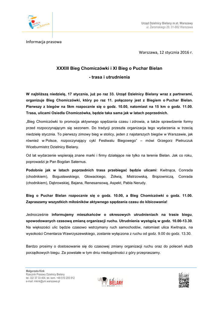 Urząd Dzielnicy Bielany m.st. Warszawy ul. Żeromskiego 29, 01-882 Warszawa Informacja prasowa Warszawa, 12 stycznia 2016 r. XXXIII Bieg Chomiczówki i XI Bieg o Puchar Bielan - trasa i utrudnienia W najbliższą niedzielę, 17 stycznia, już po raz 33. Urząd Dzielnicy Bielany wraz z partnerami, organizuje Bieg Chomiczówki, który po raz 11. połączony jest z Biegiem o Puchar Bielan. Pierwszy z biegów na 5km rozpocznie się o godz. 10.00, natomiast na 15 km o godz. 11.00. Trasa, ulicami Osiedla Chomiczówka, będzie taka sama jak w latach poprzednich. „Bieg Chomiczówki to promocja aktywnego spędzania czasu i zdrowia, a także sprawdzenie formy przed rozpoczynającym się sezonem. Do tradycji przeszła organizacja tego wydarzenia w trzecią niedzielę stycznia. To pierwszy zimowy bieg w stolicy, jeden z najstarszych biegów w Warszawie, jak również w Polsce, rozpoczynający cykl Festiwalu Biegowego” – mówi Grzegorz Pietruczuk Wiceburmistrz Dzielnicy Bielany. Od lat wydarzenie wspierają znane marki i firmy działające nie tylko na terenie Bielan. Jak co roku, poprowadzi je Pan Bogdan Saternus. Podobnie jak w latach poprzednich trasa przebiegać będzie ulicami: Kwitnąca, Conrada (chodnikiem), Bogusławskiego, Głowackiego, Żółwią, Mistrzowską, Brązowniczą, Conrada (chodnikiem), Dąbrowskiej, Bajana, Renesansową, Aspekt, Pabla Nerudy. Bieg o Puchar Bielan rozpocznie się o godz. 10.00, a Bieg Chomiczówki o godz. 11.00. Zapraszamy wszystkich miłośników aktywnego spędzania czasu do kibicowania! Jednocześnie informujemy mieszkańców o okresowych utrudnieniach na trasie biegu, spowodowanych czasową zmianą organizacji ruchu. Utrudnienia wystąpią w godz. 10.00-13.30. Na większości ulic będzie czasowo wstrzymany ruch samochodów, natomiast ulica Kwitnąca, na wysokości Cmentarza Wawrzyszewskiego, zostanie wyłączona z ruchu od godz. 9.00 do godz. 13.30. Bardzo prosimy o dostosowanie się do czasowej zmiany organizacji ruchu oraz do poleceń służb porządkowych biegu. Za powstałe w tym dniu niedogodności z góry przepraszamy. Małgorzata Kink Rzecznik Prasowy Dzielnicy Bielany tel. /22/ 37 33 404, tel. kom. +48 510 205 912 e-mail: [email protected] Urząd Dzielnicy Bielany m.st. Warszawy ul. Żeromskiego 29, 01-882 Warszawa Organizator Urząd Dzielnicy Bielany m.st. Warszawy Współorganizatorzy TKKF CHomiczówka, WSM-B Chomiczówka, Zespół Szkół 124 Sponsorzy Veolia, Pol-Mot AUTO, MATEXI, Decathlon, SKM, ArcelorMittal Huta Warszawa Partner CM Damiania Patroni medialni TVP Warszawa, Radio Wawa, Nasze Miasto, Maratonczyk.pl, Nasze Bielany Małgorzata Kink Rzecznik Prasowy Dzielnicy Bielany tel. /22/ 37 33 404, tel. kom. +48 510 205 912 e-mail: [email protected]