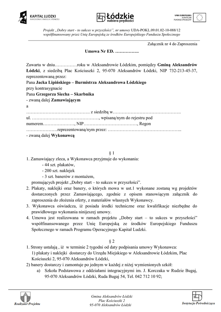 Projekt „Dobry start - to sukces w przyszłości”, nr umowy UDA-POKL.09.01.02-10-088/12 współfinansowany przez Unię Europejską ze środków Europejskiego Funduszu Społecznego Załącznik nr 4 do Zaproszenia Umowa Nr ED. ……………. Zawarta w dniu……………roku w Aleksandrowie Łódzkim, pomiędzy Gminą Aleksandrów Łódzki, z siedzibą Plac Kościuszki 2, 95-070 Aleksandrów Łódzki, NIP 732-213-45-37, reprezentowaną przez: Pana Jacka Lipińskiego – Burmistrza Aleksandrowa Łódzkiego przy kontrasygnacie Pana Grzegorza Siecha – Skarbnika - zwaną dalej Zamawiającym a ……………………………………. z siedzibą w………………………………………. ul. ………………………………………, wpisaną/nym do rejestru pod numerem…………………, NIP………………………………, Regon …………………reprezentowaną/nym przez: ………………………………………….. - zwaną dalej Wykonawcą §1 1. Zamawiający zleca, a Wykonawca przyjmuje do wykonania: - 44 szt. plakatów, - 200 szt. naklejek - 3 szt. banerów z montażem, promujących projekt „Dobry start – to sukces w przyszłości”. 2. Plakaty, naklejki oraz banery, o których mowa w ust.1 wykonane zostaną wg projektów dostarczonych przez Zamawiającego, zgodnie z opisem stanowiącym załącznik do zaproszenia do złożenia oferty, z materiałów własnych Wykonawcy. 3. Wykonawca oświadcza, iż posiada środki techniczne oraz kwalifikacje niezbędne do prawidłowego wykonania ninijeszej umowy. 4. Umowa jest realizowana w ramach projektu „Dobry start – to sukces w przyszłości” współfinansowanego przez Unię Europejską ze środków Europejskiego Funduszu Społecznego w ramach Programu Operacyjnego Kapitał Ludzki. §2 1. Strony ustalają , iż w terminie 2 tygodni od daty podpisania umowy Wykonawca: 1) plakaty i naklejki dostarczy do Urzędu Miejskiego w Aleksandrowie Łódzkim, Plac Kościuszki 2, 95-070 Aleksandrów Łódzki, 2) banery dostarczy i zamontuje po jednym w każdej z niżej wymienionych szkół: a) Szkoła Podstawowa z oddziałami integracyjnymi im. J. Korczaka w Rudzie Bugaj, 95-070 Aleksandrów Łódzki, Ruda Bugaj 54, Tel. 042 712 10 92; Gmina Aleksandrów Łódzki Plac Kościuszki 2 95-070 Aleksandrów Łódzki Projekt „Dobry start - to sukces w przyszłości”, nr umowy UDA-POKL.09.01.02-10-088/12 współfinansowany przez Unię Europejską ze środków Europejskiego Funduszu Społecznego b) Szkoła Podstawowa im. Ryszarda Wyrzykowskiego w Bełdowie, 95-070 Aleksandrów Łódzki, Bełdów 37, Tel. 042 712 14 94; c) Szkoła Podstawowa im. Ks. Stefana Kardynała Wyszyńskiego Prymasa Tysiąclecia w Rąbieniu, 95-070 Rąbień, ul. Słowiańska 5, Tel. 042 712 19 24 po wcześniejszym uzgodnieniu szczegółowego terminu z Zamawiającym. 2. Wykonawca zobowiązany jest do montażu banerów w miejscach wskazanych przez Zamawiającego, z uwzględnieniem wymogów bezpieczeństwa oraz przewidywanym 2-letnim okresem wykorzystywania baneru. §3 1. 2. W razie stwierdzenia w toku odbioru, że przedmiot ma wady lub jest niezgodny z opisem załączonym do zaproszenia, Zamawiający odmówi jego przyjęcia, a Wykonawca zobowiązany jest do dostarczenia przedmiotu wolnego od wad bądź zgodnego z opisem. Zaistnienie sytuacji określonej w ust. 2 nie powoduje przedłużenie terminu określonego w § 2 umowy. §4 Wykonawca zobowiązuje się, do udzielenia wszelkich niezbędnych wyjaśnień dotyczących przedmiotu niniejszej umowy zarówno w czasie jej wykonywania jak i po jej wykonaniu Zamawiającemu jak i instytucjom kontrolującym. 1. 2. 1. 2. 3. 4. 5. §5 Wykonawca nie może powierzyć wykonania przedmiotu umowy innej osobie bez zgody Zamawiającego. Ewentualna zmiana po stronie Wykonawcy, dokonana w trybie ust. 1 nie może prowadzić do zwiększenia wynagrodzenia określonego w § 6 ust. 1 umowy. §6 Strony ustalają, że obowiązującą formą wynagrodzenia będzie wynagrodzenie ryczałtowe, które wraz z należnym podatkiem od towarów i usług VAT będzie wynosiło: …………………………………. zł brutto (słownie ……………………………. zł brutto) Cena ryczałtowa obejmuje wynagrodzenie za wszystkie obowiązki Wykonawcy, niezbędne dla zrealizowania przedmiotu umowy. Wynagrodzenie należne Wykonawcy będzie płatne po należytym wykonaniu przedmiotu umowy oraz po przedłożeniu Zamawiającemu rachunku/ faktury, wraz z potwierdzeniem odbioru przedmiotu umowy przez uprawnionego przedstawiciela Zamawiającego. Zapłata wynagrodzenia nastąpi na rachunek bankowy wskazany przez Wykonawcę w terminie 30 dni licząc od daty dostarczenia rachunku/ faktury wraz z potwierdzeniem odbioru przedmiotu umowy do siedziby Zamawiającego. Za dzień zapłaty uważa się dzień obciążenia rachunku bankowego Zamawiającego. Gmina Aleksandrów Łódzki Plac Kościuszki 2 95-070 Aleksandrów Łódzki Projekt „Dobry start - to sukces w przyszłości”, nr umowy UDA-POKL.09.01.02-10-088/12 współfinansowany przez Unię Europejską ze środków Europejskiego Funduszu Społecznego §7 1. Strony mają prawo naliczania kar umownych za: 1) bezzasadne odstąpienie od umowy: strona odstępująca zapłaci karę umowną w wysokości 20% wartości wynagrodzenia ryczałtowego brutto, 2) nieterminowe wykonanie przedmiotu umowy w wysokości 2 % wynagrodzenia ryczałtowego brutto za każdy dzień zwłoki. 2. Zastrzeżenie kar umownych nie wyklucza dochodzenia odszkodowania na zasadach ogólnych. §8 W sprawach nieuregulowanych w niniejszej umowie będą miały zastosowanie przepisy obowiązujące w Rzeczpospolitej Polskiej, a w szczególności przepisy Kodeksu cywilnego. 1. 2. §9 Wszelkie zmiany i uzupełnienia treści niniejszej umowy wymagają formy pisemnej pod rygorem nieważności w postaci aneksu podpisanego przez obie strony. Ewentualne spory powstałe na tle realizacji przedmiotu umowy strony poddają rozstrzygnięciu sądu mi
