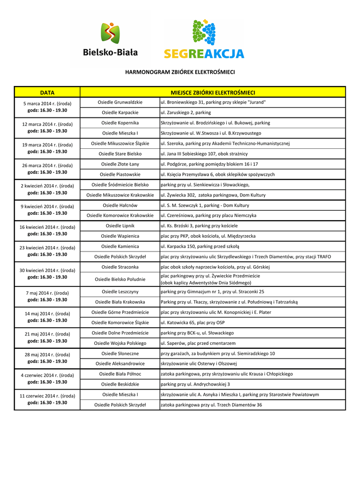 HARMONOGRAM ZBIÓREK ELEKTROŚMIECI DATA MIEJSCE ZBIÓRKI ELEKTROŚMIECI 5 marca 2014 r. (środa) godz: 16.30 - 19.30 Osiedle Grunwaldzkie Osiedle Karpackie ul. Zaruskiego 2, parking 12 marca 2014 r. (środa) godz: 16.30 - 19.30 Osiedle Kopernika Skrzyżowanie ul. Brodzińskiego i ul. Bukowej, parking Osiedle Mieszka I Skrzyżowanie ul. W.Stwosza i ul. B.Krzywoustego 19 marca 2014 r. (środa) godz: 16.30 - 19.30 Osiedle Mikuszowice Śląskie 26 marca 2014 r. (środa) godz: 16.30 - 19.30 Osiedle Złote Łany ul. Podgórze, parking pomiędzy blokiem 16 i 17 Osiedle Piastowskie ul. Księcia Przemysława 6, obok sklepików spożywczych 2 kwiecień 2014 r. (środa) godz: 16.30 - 19.30 9 kwiecień 2014 r. (środa) godz: 16.30 - 19.30 16 kwiecień 2014 r. (środa) godz: 16.30 - 19.30 23 kwiecień 2014 r. (środa) godz: 16.30 - 19.30 30 kwiecień 2014 r. (środa) godz: 16.30 - 19.30 7 maj 2014 r. (środa) godz: 16.30 - 19.30 Osiedle Stare Bielsko Osiedle Śródmieście Bielsko Osiedle Mikuszowice Krakowskie Osiedle Hałcnów Osiedle Komorowice Krakowskie Osiedle Lipnik ul. Broniewskiego 31, parking przy sklepie "Jurand" ul. Szeroka, parking przy Akademii Techniczno-Humanistycznej ul. Jana III Sobieskiego 107, obok strażnicy parking przy ul. Sienkiewicza i Słowackiego, ul. Żywiecka 302, zatoka parkingowa, Dom Kultury ul. S. M. Szewczyk 1, parking - Dom Kultury ul. Czereśniowa, parking przy placu Niemczyka ul. Ks. Brzóski 3, parking przy kościele Osiedle Wapienica plac przy PKP, obok kościoła, ul. Międzyrzecka Osiedle Kamienica ul. Karpacka 150, parking przed szkołą Osiedle Polskich Skrzydeł Osiedle Straconka Osiedle Bielsko Południe Osiedle Leszczyny Osiedle Biała Krakowska plac przy skrzyżowaniu ulic Skrzydlewskiego i Trzech Diamentów, przy stacji TRAFO plac obok szkoły naprzeciw kościoła, przy ul. Górskiej plac parkingowy przy ul. Żywieckie Przedmieście (obok kaplicy Adwentystów Dnia Siódmego) parking przy Gimnazjum nr 1, przy ul. Straconki 25 Parking przy ul. Tkaczy, skrzyżowanie z ul. Południową i Tatrzańską 14 maj 2014 r. (środa) godz: 16.30 - 19.30 Osiedle Górne Przedmieście plac przy skrzyżowaniu ulic M. Konopnickiej i E. Plater Osiedle Komorowice Śląskie ul. Katowicka 65, plac przy OSP 21 maj 2014 r. (środa) godz: 16.30 - 19.30 Osiedle Dolne Przedmieście parking przy BCK-u, ul. Słowackiego Osiedle Wojska Polskiego ul. Saperów, plac przed cmentarzem 28 maj 2014 r. (środa) godz: 16.30 - 19.30 Osiedle Słoneczne Osiedle Aleksandrowice przy garażach, za budynkiem przy ul. Siemiradzkiego 10 skrzyżowanie ulic Osterwy i Olszowej 4 czerwiec 2014 r. (środa) godz: 16.30 - 19.30 Osiedle Biała Północ Osiedle Beskidzkie parking przy ul. Andrychowskiej 3 11 czerwiec 2014 r. (środa) godz: 16.30 - 19.30 Osiedle Mieszka I skrzyżowanie ulic A. Asnyka i Mieszka I, parking przy Starostwie Powiatowym Osiedle Polskich Skrzydeł zatoka parkingowa, przy skrzyżowaniu ulic Krausa i Chłopickiego zatoka parkingowa przy ul. Trzech Diamentów 36