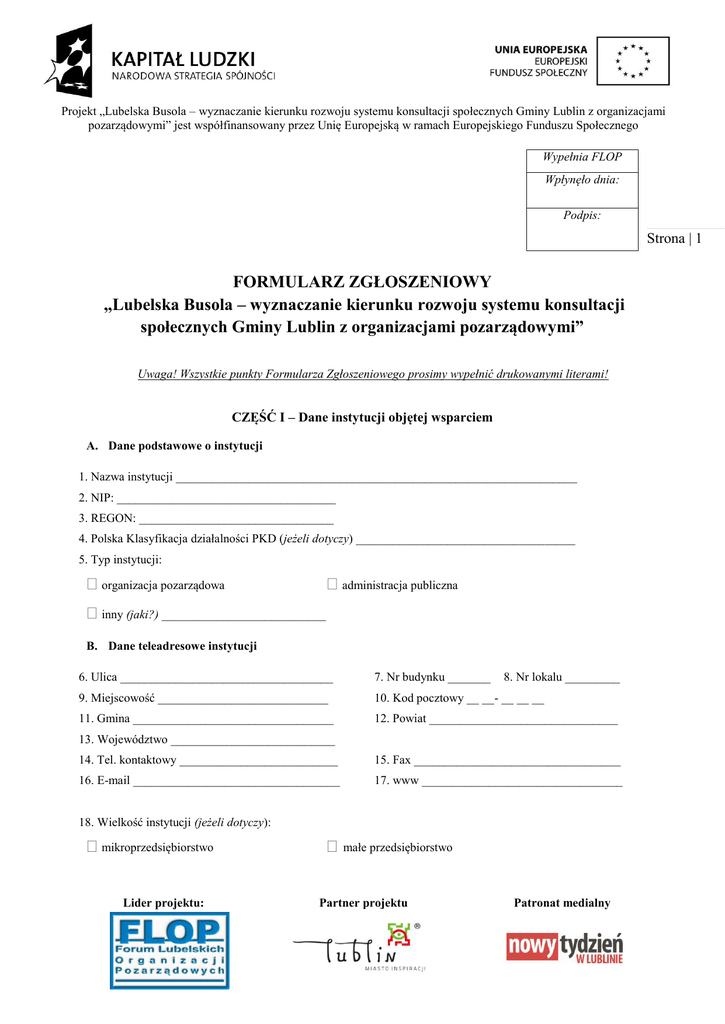 Projekt „Lubelska Busola – wyznaczanie kierunku rozwoju systemu konsultacji społecznych Gminy Lublin z organizacjami pozarządowymi” jest współfinansowany przez Unię Europejską w ramach Europejskiego Funduszu Społecznego Wypełnia FLOP Wpłynęło dnia: Podpis: Strona | 1 FORMULARZ ZGŁOSZENIOWY „Lubelska Busola – wyznaczanie kierunku rozwoju systemu konsultacji społecznych Gminy Lublin z organizacjami pozarządowymi” Uwaga! Wszystkie punkty Formularza Zgłoszeniowego prosimy wypełnić drukowanymi literami! CZĘŚĆ I – Dane instytucji objętej wsparciem A. Dane podstawowe o instytucji 1. Nazwa instytucji __________________________________________________________________ 2. NIP: ____________________________________ 3. REGON: ________________________________ 4. Polska Klasyfikacja działalności PKD (jeżeli dotyczy) ____________________________________ 5. Typ instytucji: organizacja pozarządowa administracja publiczna inny (jaki?) ___________________________ B. Dane teleadresowe instytucji 6. Ulica ___________________________________ 7. Nr budynku _______ 8. Nr lokalu _________ 9. Miejscowość ____________________________ 10. Kod pocztowy __ __- __ __ __ 11. Gmina _________________________________ 12. Powiat _______________________________ 13. Województwo ___________________________ 14. Tel. kontaktowy __________________________ 15. Fax __________________________________ 16. E-mail __________________________________ 17. www _________________________________ 18. Wielkość instytucji (jeżeli dotyczy): mikroprzedsiębiorstwo Lider projektu: małe przedsiębiorstwo Partner projektu Patronat medialny Projekt „Lubelska Busola – wyznaczanie kierunku rozwoju systemu konsultacji społecznych Gminy Lublin z organizacjami pozarządowymi” jest współfinansowany przez Unię Europejską w ramach Europejskiego Funduszu Społecznego średnie przedsiębiorstwo duże przedsiębiorstwo C. Deklaracja udziału w projekcie Działając w imieniu _________________________________________________________________ (Nazwa instytucji objętej wsparciem) deklaruję udział w „Lubelska Busola – wyznaczanie kierunku rozwoju systemu konsultacji społecznych Gminy Lublin z organizacjami pozarządowymi” realizowanego w ramach Programu Operacyjnego Kapitał Ludzki 2007-2013, Priorytet V. „Dobre rządzenie”, Poddz. 5.4.2 „Rozwój dialogu obywatelskiego” ………………………………. …………………………………………………………. (Miejscowość i data) (Podpis i pieczęć osoby upoważnionej do reprezentacji) CZĘŚĆ II – Dane Uczestnika Projektu – osoby oddelegowanej przez instytucję objętą wsparciem A. Dane podstawowe uczestnika 1. Nazwisko _____________________________________________ 2. Imię (imiona) __________________________________________ 3. Płeć: kobieta mężczyzna 4. Data i miejsce urodzenia _ _ . _ _ . _ _ _ _ r. w ________________________ 5. PESEL 6. Wykształcenie: □ brak formalnego wykształcenia □ podstawowe □ gimnazjalne □ ponadgimnazjalne (średnie lub zasadnicze zawodowe □ pomaturalne (ukończona szkoła policealna, ale nie ukończone studia wyższe) □ wyższe Lider projektu: Partner projektu Patronat medialny Strona | 2 Projekt „Lubelska Busola – wyznaczanie kierunku rozwoju systemu konsultacji społecznych Gminy Lublin z organizacjami pozarządowymi” jest współfinansowany przez Unię Europejską w ramach Europejskiego Funduszu Społecznego B. Dane teleadresowe uczestnika Adres zamieszkania: 7. Ulica ___________________________________ 8. Nr budynku _______ 9. Nr lokalu _______ 10. Miejscowość ____________________________ 11. Kod pocztowy __ __- __ __ __ 12. Gmina _________________________________ 13. Powiat ________________________________ 14. Województwo ___________________________ 15. Obszar zamieszkania: □ miejski □ wiejski 16. Tel. __________________________ 17. Kom. ________________________________ 18. E-mail __________________________________ C. Status uczestnika na rynku pracy w chwili przystąpienia do projektu (zaznacz odpowiednie): □ TAK □ NIE □ osoba długotrwale bezrobotna 19. Bezrobotny w tym: w tym: □ TAK □ NIE □ osoba ucząca się lub kształcąca 21. Zatrudniony □ TAK w tym: □ rolnik □ samozatrudniony □ w mikroprzedsiębiorstwie □ w małym przedsiębiorstwie □ w średnim przedsiębiorstwie □ w dużym przedsiębiorstwie □ w administracji publicznej □ w organizacji pozarządowej 20. Nieaktywny zawodowo □ NIE D. Które ze szkoleń pogłębionych Państwo wybierają: (zaznacz odpowiednio wybrany jeden blok szkoleniowy) □ Blok 2 (8 godz.): M3. Prawne aspekty prowadzenia konsultacji społ., partycypacji obywatelskiej i współpracy międzysektorowej □ Blok 3 (8 godz.): Lider projektu: M4. Wykorzystanie nowych technologii ICT w procesie dialogu i konsultacji społ. – dobre praktyki Partner projektu Patronat medialny Strona | 3 Projekt „Lubelska Busola – wyznaczanie kierunku rozwoju systemu konsultacji społecznych Gminy Lublin z organizacjami pozarządowymi” jest współfinansowany przez Unię Europejską w ramach Europejskiego Funduszu Społecznego E. Jak oceniają Państwo swoją wiedzę z proponowanego zakresu szkolenia? Proszę dokonać oceny zakreślając odpowiednią zdaniem Państwa notę, wg następującej skali: 1. zdecydowanie źle; 2. niezadowalająco; 3. średnio; 4. dobrze; 5. bardzo dobrze Metod i technik prowadzenia konsultacji społecznych Prawnych aspektów prowadzenia konsultacji społecznych Prawnych aspektów partycypacji obywatelskiej Prawnych aspektów współpracy międzysektorowej Wykorzystanie nowych technologii ICT w procesie dialogu i konsultacji społecznych ………………………… 2 3 4 5 □ □ □ □ □ □ □ □ □ □ □ □ □ □ □ □ □ □ □ □ □ □ □ □ □ ………….……………………….. (Miejscowość i data) Lider projektu: 1 (Czytelny podpis) Partner projektu 