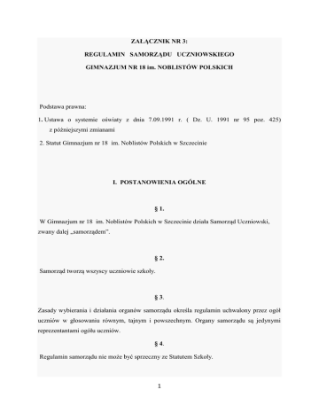 ZAŁĄCZNIK NR 3: REGULAMIN SAMORZĄDU UCZNIOWSKIEGO GIMNAZJUM NR 18 im. NOBLISTÓW POLSKICH Podstawa prawna: 1. Ustawa o systemie oświaty z dnia 7.09.1991 r. ( Dz. U. 1991 nr 95 poz. 425) z późniejszymi zmianami 2. Statut Gimnazjum nr 18 im. Noblistów Polskich w Szczecinie I. POSTANOWIENIA OGÓLNE § 1. W Gimnazjum nr 18 im. Noblistów Polskich w Szczecinie działa Samorząd Uczniowski, zwany dalej „samorządem”. § 2. Samorząd tworzą wszyscy uczniowie szkoły. § 3. Zasady wybierania i działania organów samorządu określa regulamin uchwalony przez ogół uczniów w głosowaniu równym, tajnym i powszechnym. Organy samorządu są jedynymi reprezentantami ogółu uczniów. § 4. Regulamin samorządu nie może być sprzeczny ze Statutem Szkoły. 1 § 5. Samorząd może przedstawiać Radzie Rodziców, Radzie Pedagogicznej oraz Dyrektorowi wnioski i opinie we wszystkich sprawach szkoły, w szczególności dotyczących realizacji podstawowych praw uczniów, takich jak: 1. prawo do zapoznania się z programem nauczania, z jego treścią, celami i stawianymi wymaganiami, 2. prawo do jawnej i umotywowanej oceny w nauce i zachowaniu, 3. prawo do organizacji życia szkolnego, umożliwiające zachowanie właściwych proporcji między wysiłkiem szkolnym a możliwością rozwijania i zaspokajania własnych zainteresowań, 4. prawo do redagowania i wydawania gazety szkolnej, 5. prawo organizowania działalności kulturalnej, oświatowej, sportowej oraz rozrywkowej zgodnie z własnymi potrzebami oraz możliwościami organizacyjnymi, w porozumieniu z dyrektorami, 6. prawo wyboru nauczyciela pełniącego funkcje opiekuna samorządu, 7. prawo angażowania się do działających na terenie szkoły stowarzyszeń oraz innych organizacji, których celem statutowym jest wolontariat, działalność wychowawcza oraz rozszerzanie i wzbogacanie form działalności dydaktycznej, wychowawczej oraz opiekuńczej szkoły. II. ORGANY SAMORZĄDU § 6. Organami samorządu są: 1. Sejmik Uczniowski – po dwóch przedstawicieli z każdej klasy, 2. Przewodniczący Samorządu, 3. Rada Samorządu Uczniowskiego (RSU) składająca się z 5 osób. 2 § 7. Członkami Rady Samorządu Uczniowskiego (RSU) zostają uczniowie, którzy w wyborach powszechnych, równych, tajnych i bezpośrednich uzyskali największą ilość głosów. § 8. Uczeń, który otrzymał na koniec roku szkolnego lub semestru ocenę co najwyżej nieodpowiednią z zachowania nie może być członkiem RSU. § 9. Co rok następuje koniec kadencji części członków RSU. Wybory uzupełniające do RSU powinny odbywać się do końca września nowego roku szkolnego. § 10. Uczeń, który zakończył kadencje w RSU może ponownie startować w nowych wyborach. Na wniosek opiekuna Samorządu Uczniowskiego, kadencja ucznia, który aktywnie pracował w RSU, może być przedłużona o rok. § 11. Organy samorządu zobowiązane są raz w roku przedstawiać sprawozdanie ze swojej działalności na posiedzeniu Sejmiku Uczniowskiego. III. SEJMIK UCZNIOWSKI § 12. W posiedzeniu Sejmiku Uczniowskiego uczestniczy po dwóch przedstawicieli rad samorządów klasowych. 3 § 13. Obradami Sejmiku Uczniowskiego kieruje opiekun Samorządu Uczniowskiego. § 14. Sejmik podejmuje decyzje w formie opinii i wniosków. Decyzje zapadają zwykłą większością głosów. § 15. Do kompetencji Sejmiku Uczniowskiego należy: przyjmowanie sprawozdań z działalności samorządu, wyrażenie swojej opinii o pracy 1. Rady Samorządu Uczniowskiego, prawo odwoływania organów samorządu lub poszczególnych osób, jeśli nie wykonują 2. powierzonych im zadań, przedstawianie propozycji działań samorządu uczniowskiego. 3. IV. PRZEWODNICZĄCY SAMORZĄDU UCZNIOWSKIEGO § 16. Przewodniczący Samorządu uczniowskiego: 1. reprezentuje samorząd wobec Rady Rodziców, Rady Pedagogicznej i Dyrektora szkoły, 2. kieruje pracą samorządu, 3. organizuje współdziałanie samorządu uczniowskiego z samorządami klasowymi. 4 § 17. Kandydata na przewodniczącego samorządu proponuje opiekun samorządu spośród członków nowej RSU na pierwszym jej posiedzeniu. Kandydat powinien mieć akceptację pozostałych członków rady. § 18 Kandydat na przewodniczącego powinien: 1. mieć co najmniej dobre oceny, 2. nie sprawiać kłopotów wychowawczych, 3. uzyskać akceptację grona pedagogicznego. § 19. 1. Przewodniczący samorządu może być odwołany ze swojej funkcji na wniosek złożony na ręce opiekuna samorządu przez grupę co najmniej 20 uczniów. 2. W takim wypadku opiekun samorządu wśród członków Sejmiku Uczniowskiego przeprowadza głosowanie nad votum nieufności dla Przewodniczącego samorządu. Odwołanie przewodniczącego następuje, jeżeli co najmniej 50% uczniów biorących w nim udział opowie się za odwołaniem. 3. Funkcję przewodniczącego pełni wówczas osoba wybrana na mocy § 17. 4. Mimo odwołania z funkcji przewodniczącego samorządu uczeń ten może pozostać członkiem RSU. § 20. Decyzje RSU podejmuje zwykła większością głosów w głosowaniu jawnym. W przypadku równowagi głos decydujący ma przewodniczący. 5 § 21. Zadania Rady Samorządu Uczniowskiego: 1. opracowuje i przedstawia projekt prac samorządu, 2. inicjuje działania społeczności uczniowskiej na terenie szkoły i poza nią, 3. podejmuje decyzje o zwołaniu Sejmiku Uczniowskiego, 4. jest pośrednim wyrazicielem woli uczniów wobec Dyrektora szkoły i Rady Pedagogicznej, 5. propaguje idee wolontariatu § 22. Na czele Radu Samorządu Uczniowskiego stoi Przewodniczący samorządu. § 23. Zadania Przewodniczącego samorządu: 1. realizacja programu prac samorządu, 2. kierowanie pracami komisji, 3. współpraca z przewodniczącymi samorządów klas, 4. reprezentowanie społeczności uczniowskiej wobec Rady Pedagogicznej, Rady Rodziców oraz Dyrektora szkoły. § 24. Zadania zastępcy przewodniczącego: 1. wspomaganie przewodniczącego we wszystkich zadaniach wynikających z jego funkcji, 2. wsp
