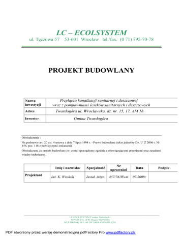 LC – ECOLSYSTEM ul. Tęczowa 57 53-601 Wrocław tel./fax. (0 71) 795-70-78 PROJEKT BUDOWLANY Nazwa inwestycji Adres Inwestor Przyłącza kanalizacji sanitarnej i deszczowej wraz z pompowniami ścieków sanitarnych i deszczowych Twardogóra ul. Wrocławska, dz. nr. 15, 17, AM 18 Gmina Twardogóra Oświadczenie : Na podstawie art. 20 ust. 4 ustawy z dnia 7 lipca 1994 r. –Prawo budowlane (tekst jednolity Dz. U. Z 2006 r. Nr 156, poz. 118 z późniejszymi zmianami) Oświadczam, że projekt budowlany jw. został sporządzony zgodnie z obowiązującymi przepisami oraz zasadami wiedzy technicznej. Imię i nazwisko Projektant Inż. K. Wroński Specjalność Nr uprawnień Instal .inżyn. 457/76/Wwm Data Podpis 07.2008r ________________________________________________________________________________________ LC-ECOLSYSTEM Czesław Nahrebecki NIP 894-176-12-96 Regon 932987186 MULTIBANK 08 1140 2017 0000 4302 0359 1203 PDF stworzony przez wersję demonstracyjną pdfFactory Pro www.pdffactory.pl/ ZAWARTOŚĆ OPRACOWANIA 1. Strona tytułowa - str. 1 2. Zawartość teczki - str. 2 3. Zaświadczenie o członkostwie w DOIIB - str. 3 - 4 4. Stwierdzenie przygotowania zawodowego - str. 5 - 6 5. Opis techniczny - str. 7 - 21 6. Opinia ZUDP Oleśnica - str. 22 7. Plan usytuowania kanalizacji sanitarnej z klauzulą ZUDP - str. 23 8. Warunki odprowadzania ścieków sanitarnych i deszczo-wych wydane przez ZGKiM Twardogóra + zał. mapowy - str. 24-26 9. Uzgodnienie proj. bud. przez ZGKiM Twardogóra - str. 27 10. Warunki przyłączenia do sieci elektroenergetycznej - str. 28 – 30 11. Decyzja ZDP w Oleśnicy z dnia 21.08.2008 r.w sprawie zgody na wejście w drogę ( ul. Wrocławska ) + zał. Map. 12. Mapa ewid. Ww. terenu - str. 31 – 32 - str. 33 13. Plan usytuowania przyłączy kanalizacji sanit. i deszczowej wraz z pompowniami ami ścieków - str. 34 14. Profil podłużny przylączy - str. 35-36 14. Karta informacyjna pompowni - str. 37 -38 15. Lokalizacja sieci elektr. - str. 39 PDF stworzony przez wersję demonstracyjną pdfFactory Pro www.pdffactory.pl/ KARTA INFORMACYJNA POMPOWNI EPS KARTA INFORMACYJNA POMPOWNI EPS TYP: PS / 1200 - 3,90 / N - 80 / SV 014 CLU TYP: PD / 2500 - 3,67 / N - 200 / S1 074 E1 Twardogóra, Pompownia sanitarna Twardogóra, Pompownia Deszczowa Wlot 1 Wlot 1 W 2 4 Właz żeliwny A15 fi800 Pompa Grundfos 1 SV 014 CLU 2 5 Sterowanie EPS 6 Kołnierz normowy DN 80 Sterowanie EPS Wentylacja 3 4 7 Szafa sterownicza 8 Zbiornik BETON B45 Ø 2500 mm H= 3,67m 7 PE100 SDR17 PN10 (250x220,4) L=60m H ter 3 6 H tlo WYLOT 2 H dop 2 1 2 3 4 H alarm alarm 5 H max 6 max H dop 1 1 7 8 8 H min min such 9 10 Hsuch H dna Ø EKOL-UNICON Sp. z o.o. 80-067 Gdańsk, ul. Równa 2 tel.: (0-58) 306-56-78 fax.:(0-58) 306-57-02 11 12 Oznaczenie Hpok Hter Htło Hdop1 Hdop2 Halarm Hmax Hmin Hsuch Hdna α1 α2 m n.p.m. 174,98 174,80 173,30 6 H tlo Wlot 2 WYLOT 2 H dop 2 alarm Wlot 1 1 2 3 4 H alarm 172,00 172,20 171,90 171,60 171,50 171,00 H 3 Wlot 2 H I n= 16,7A H pok H ter 5 2 S1 074 E1 6 Kołnierz normowy DN 200 PE100 SDR17 PN10 (90x79,2) L=60m H pok Wlot 1 2 1 P 1= 9,6 kW P2= 7,5 kW 1 2 4 Właz lekki aluminiowy 1000x1500 Pompa Grundfos 5 Sterowanie EPS 1 1 mb. 3 Zasuwa DN 200 I n= 4,4 A 7 Szafa sterownicza 8 Zbiornik BETON B45 Ø 1200 mm H= 3,90m 7 szt. Nazwa elementu 1 Orurowanie DN 200 2 Zawór kulowy zwrotny DN 200 6 WYLOT P1 = 2,3 kW P2= 1,7 kW 4 2 3 Zasuwa DN 80 3 α α α WYLOT szt. mb. 2 2 Wentylacja Nazwa elementu 1 Orurowanie DN 80 2 Zawór kulowy zwrotny DN 80 lot lot 6 Sterowanie EPS W α 5 H max 6 max H dop 1 1 7 8 8 H min min such H dna 5 9 10 H such 243 st. Ø EKOL-UNICON Sp. z o.o. 80-067 Gdańsk, ul. Równa 2 tel.: (0-58) 306-56-78 fax.:(0-58) 306-57-02 PDF stworzony przez wersję demonstracyjną pdfFactory Pro www.pdffactory.pl/ 11 12 Oznaczenie Hpok Hter Htło Hdop1 Hdop2 Halarm Hmax Hmin Hsuch Hdna α1 α2 m n.p.m. 174,82 174,80 173,30 173,20 173,10 172,90 171,90 171,80 171,15 224 st. 1 1 1 1 Przyłącza kanalizacji sanitarnej i deszczowej wraz z pompowniami ścieków sanitarnych i deszczowych, Twardogóra ul. Wrocławska Zawartość opracowania I. Opis techniczny 1. Dane ogólne 2. Materiały wyjściowe 3. Przedmiot i zakres opracowania 4. Opis projektowanego przyłącza kanalizacji sanitarnej 4.1. Obliczenie ilości odprowadzanych ścieków 4.2. Przyłącze kanalizacji sanitarnej 4.3. Przepompownia ścieków sanitarnych 5. Opis projektowanego przyłącza kanalizacji deszczowej 5.1. Obliczenie ilości odprowadzanych ścieków 4.2. Przyłącze kanalizacji deszczowej 4.3. Przepompownia ścieków deszczowych 6. Wykopy 7. Uwagi końcowe 8. Informacja dotycząca bezpieczeństwa i ochrony zdrowia II. Rysunki 1. Plan usytuowania pompowni oraz przyłączy kanalizacji sanitarnej i deszczowej – rys 1 2. Profil podłużny kanalizacji sanitarnej – rys. 2 3. Profil podłużny kanalizacji deszczowej – rys. 3 4. Rzut i przekrój pompowni sanitarnej – rys. 4 5. Rzut i przekrój pompowni deszczowej – rys. 5 PDF stworzony przez wersję demonstracyjną pdfFactory Pro www.pdffactory.pl/ 2 Przyłącza kanalizacji sanitarnej i deszczowej wraz z pompowniami ścieków sanitarnych i deszczowych, Twardogóra ul. Wrocławska I, Opis techniczny 1. Dane ogólne • • Inwestor: Gmina Twardogóra ul. Ratuszowa 14, 56-416 Twardogóra Adres inwestycji: Twardogóra ul. Wrocławska – dz. nr 15, 17, AM 18 2. Materiały wyjściowe Wykaz wykorzystanych materiałów i dokumentów • • • • Plan syt.wysok. terenu w skali 1:500 Warunki techniczne odprowadzenie ścieków sanitarnych i deszczowych z Gimnazjum nr 1, Szkoły Podstawowej nr 2 i hali widowiskowo-sportowej do miejskiej kanalizacji sanitarnej i deszczowej w ul. Wrocławskiej w Twardogórze wydane przez Zakład Gospodarki Komunalnej i Mieszkaniowej w Twardogórze ul. Wrocławska 8, 56-416 Twardogóra – pismo L. Dz. DW/3384/08 z dnia 2008-07-11 Prawo Budowlane Dz.U. nr 89 poz 414 z 1994r Obowiązujące Polskie Normy oraz Normy Branżowe 3. Przedmiot