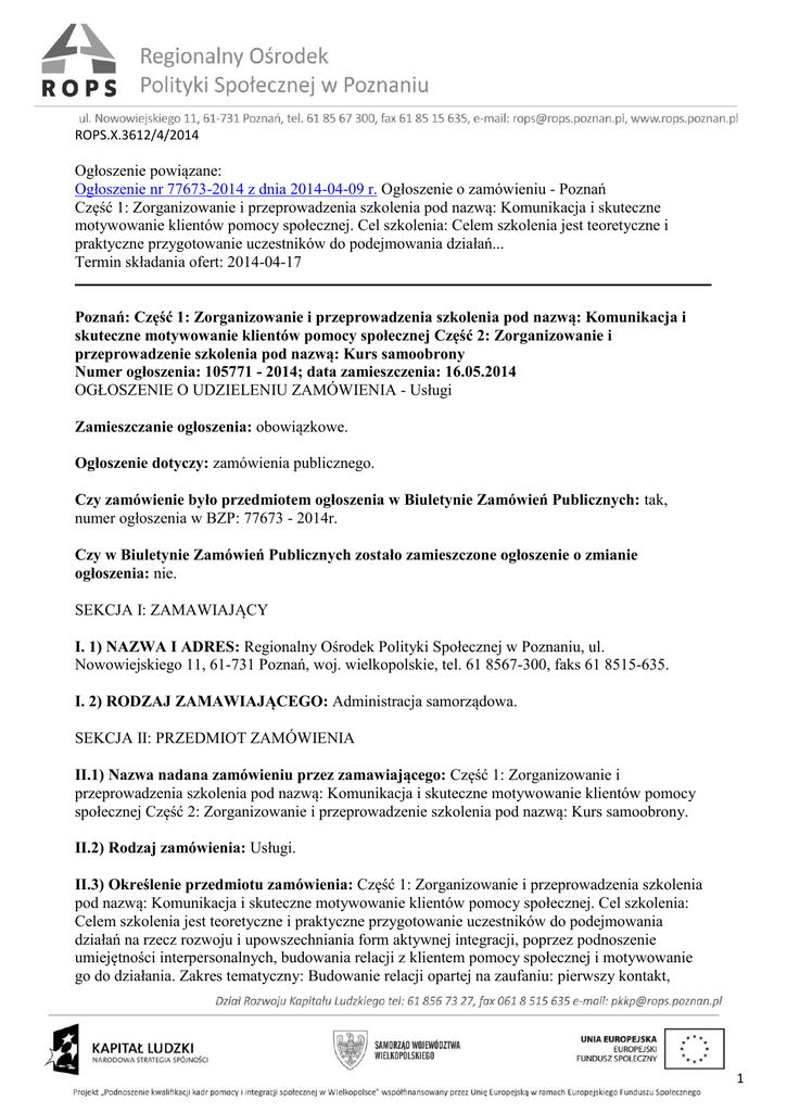 ROPS.X.3612/4/2014 Ogłoszenie powiązane: Ogłoszenie nr 77673-2014 z dnia 2014-04-09 r. Ogłoszenie o zamówieniu - Poznań Część 1: Zorganizowanie i przeprowadzenia szkolenia pod nazwą: Komunikacja i skuteczne motywowanie klientów pomocy społecznej. Cel szkolenia: Celem szkolenia jest teoretyczne i praktyczne przygotowanie uczestników do podejmowania działań... Termin składania ofert: 2014-04-17 Poznań: Część 1: Zorganizowanie i przeprowadzenia szkolenia pod nazwą: Komunikacja i skuteczne motywowanie klientów pomocy społecznej Część 2: Zorganizowanie i przeprowadzenie szkolenia pod nazwą: Kurs samoobrony Numer ogłoszenia: 105771 - 2014; data zamieszczenia: 16.05.2014 OGŁOSZENIE O UDZIELENIU ZAMÓWIENIA - Usługi Zamieszczanie ogłoszenia: obowiązkowe. Ogłoszenie dotyczy: zamówienia publicznego. Czy zamówienie było przedmiotem ogłoszenia w Biuletynie Zamówień Publicznych: tak, numer ogłoszenia w BZP: 77673 - 2014r. Czy w Biuletynie Zamówień Publicznych zostało zamieszczone ogłoszenie o zmianie ogłoszenia: nie. SEKCJA I: ZAMAWIAJĄCY I. 1) NAZWA I ADRES: Regionalny Ośrodek Polityki Społecznej w Poznaniu, ul. Nowowiejskiego 11, 61-731 Poznań, woj. wielkopolskie, tel. 61 8567-300, faks 61 8515-635. I. 2) RODZAJ ZAMAWIAJĄCEGO: Administracja samorządowa. SEKCJA II: PRZEDMIOT ZAMÓWIENIA II.1) Nazwa nadana zamówieniu przez zamawiającego: Część 1: Zorganizowanie i przeprowadzenia szkolenia pod nazwą: Komunikacja i skuteczne motywowanie klientów pomocy społecznej Część 2: Zorganizowanie i przeprowadzenie szkolenia pod nazwą: Kurs samoobrony. II.2) Rodzaj zamówienia: Usługi. II.3) Określenie przedmiotu zamówienia: Część 1: Zorganizowanie i przeprowadzenia szkolenia pod nazwą: Komunikacja i skuteczne motywowanie klientów pomocy społecznej. Cel szkolenia: Celem szkolenia jest teoretyczne i praktyczne przygotowanie uczestników do podejmowania działań na rzecz rozwoju i upowszechniania form aktywnej integracji, poprzez podnoszenie umiejętności interpersonalnych, budowania relacji z klientem pomocy społecznej i motywowanie go do działania. Zakres tematyczny: Budowanie relacji opartej na zaufaniu: pierwszy kontakt, 1 budowanie warunków pierwszego kontaktu, rola pierwszego kontaktu, a w szczególności popełniane błędy i ich skutki dla późniejszej relacji, podstawy interakcji społecznych, budowanie i utrzymywanie relacji opartej na szacunku i zaufaniu. Komunikacja werbalna i niewerbalna: nieporozumienia w komunikacji werbalnej, rola i umiejętność aktywnego słuchania, budowanie i dobór pytań otwierających i precyzujących, prowadzenie rozmowy w oparciu o pytania. Budowanie w kliencie pomocy społecznej motywacji i poczucia wpływu: najczęściej popełniane błędy w motywowaniu, skuteczny wywiad z klientem, precyzowanie celu w oparciu o pytania, budowanie planu działania w oparciu o obszar wpływu i zasadę małych kroków. Budowanie informacji zwrotnej: budowanie informacji zwrotnej adekwatnej do sytuacji, budowanie umiejętności nagradzania małych kroków, budowanie w kliencie umiejętności samooceny i autonagradzania. Sposób organizacji szkolenia: Wykonawcy ubiegający się o realizację niniejszego zamówienia zobowiązują się zorganizować i przeprowadzić nie więcej niż 6 trzydniowych edycji szkoleń, w wymiarze 21 godzin dydaktycznych dla każdej edycji (przy założeniu, że jedna godzina zajęć dydaktycznych to 45 minut), dla 100 osób, w podziale na grupy (edycje) liczące maksymalnie 20 osób, wraz z zapewnieniem uczestnikom poszczególnych edycji dowozu, zakwaterowania oraz wyżywienia. Zajęcia będą prowadzone wspólnie przez dwóch szkoleniowców. Materiały szkoleniowe: Wykonawca zobowiązany jest zapewnić każdemu uczestnikowi materiały szkoleniowe wraz ze szczegółowym harmonogramem zajęć, w formie papierowej i na nośniku elektronicznym. Materiały szkoleniowe zostaną przekazane Zamawiającemu do akceptacji nie później niż 3 dni przed podpisaniem umowy. Materiały powinny być przekazane do akceptacji w wersji ostatecznej. Jeden komplet materiałów Wykonawca przekaże Zamawiającemu w momencie podpisania umowy. Rekrutacja i obsługa administracyjna: Współpraca z Zamawiającym w zakresie naboru kandydatów na szkolenie i tworzenie listy uczestników oznacza: nawiązanie kontaktu Wykonawcy z jednostkami pomocy i integracji społecznej w Wielkopolsce i na podstawie otrzymanych tą drogą zgłoszeń przeprowadzenie wstępnej kwalifikacji uczestników szkolenia oraz sporządzenie listy kandydatów do grupy, przekazanie sporządzonej listy kandydatów Zamawiającemu w celu uzyskania jej akceptacji. Dostarczenie ww. listy musi nastąpić na 2 dni przed terminem rozpoczęcia każdej edycji, poinformowanie kandydatów, po otrzymaniu od Zamawiającego akceptacji zgłoszonych uczestników, o zakwalifikowaniu się na szkolenie. Wykonawca dokonuje ww. czynności posługując się formularzami przygotowanymi przez Zamawiającego i z wykorzystaniem danych kontaktowych udostępnionych przez Zamawiającego (baza e-mail jednostek pomocy i integracji społecznej w Wielkopolsce). Zamawiający prowadzi działania wspierające działania Wykonawcy w formie ogłoszeń, listów oraz informacji na stronie internetowej. Mają one na celu promowanie szkolenia i informowanie o szkoleniu jednostek pomocy społecznej w Wielkopolsce. Organizacja szkolenia Dojazd: Wykonawca jest zobowiązany zorganizować dojazd uczestników na każdą edycję: pierwszego dnia z miejsca zbiórki uczestników szkolenia do miejsca, w którym realizowane będzie szkolenie oraz po zakończeniu edycji powrót do miejsca zbiórki. Miejscem zbiórki uczestników szkolenia jest Dworzec Letni w Poznaniu, ul. Dworcowa 1. Zakwaterowanie: Wykonawca jest zobowiązany zapewnić zakwaterowanie uczestników poszczególnych edycji w pokojach 2 lub 1 osobowych, w hotelu trzygwiazdkowym lub ośrodku rekreacyjno-szkoleniowym spełniającym stan