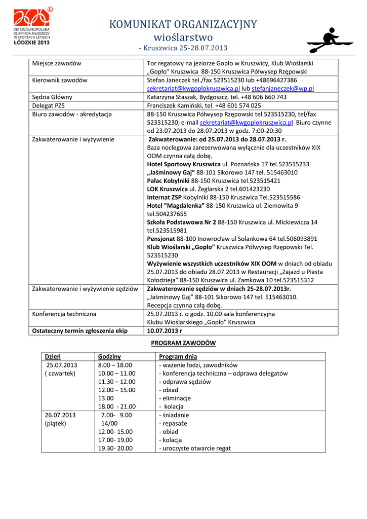 KOMUNIKAT ORGANIZACYJNY wioślarstwo