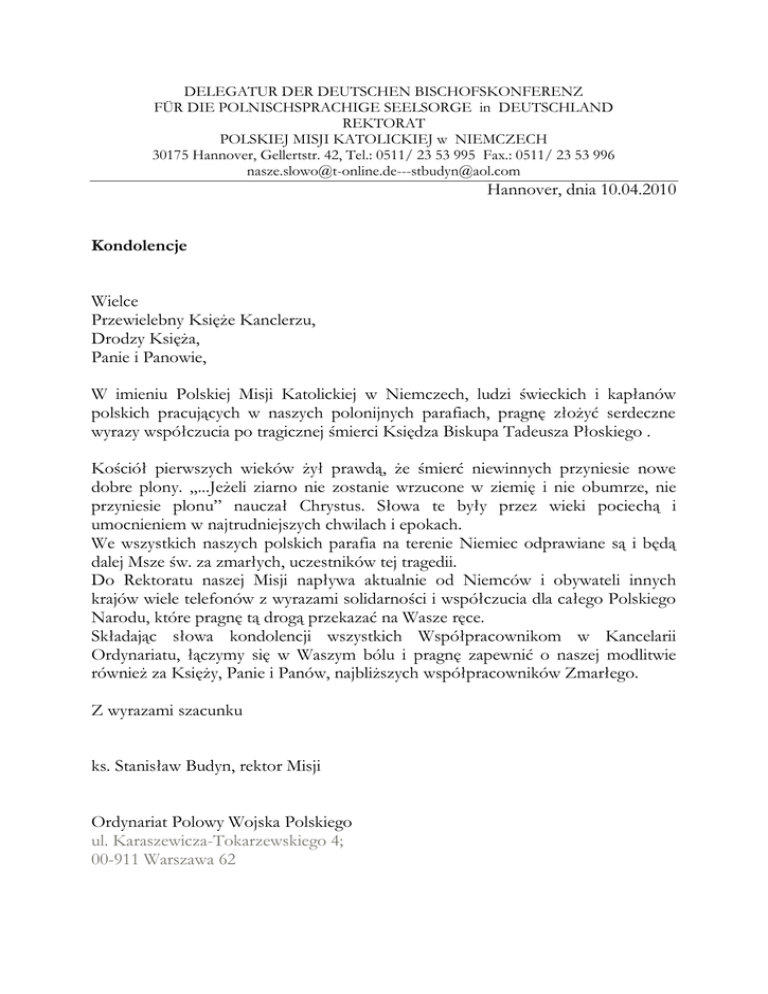 DELEGATUR DER DEUTSCHEN BISCHOFSKONFERENZ FÜR DIE POLNISCHSPRACHIGE SEELSORGE in DEUTSCHLAND REKTORAT POLSKIEJ MISJI KATOLICKIEJ w NIEMCZECH 30175 Hannover, Gellertstr. 42, Tel.: 0511/ 23 53 995 Fax.: 0511/ 23 53 996 [email protected]@aol.com Hannover, dnia 10.04.2010 Kondolencje Wielce Przewielebny Księże Kanclerzu, Drodzy Księża, Panie i Panowie, W imieniu Polskiej Misji Katolickiej w Niemczech, ludzi świeckich i kapłanów polskich pracujących w naszych polonijnych parafiach, pragnę złożyć serdeczne wyrazy współczucia po tragicznej śmierci Księdza Biskupa Tadeusza Płoskiego . Kościół pierwszych wieków żył prawdą, że śmierć niewinnych przyniesie nowe dobre plony. „...Jeżeli ziarno nie zostanie wrzucone w ziemię i nie obumrze, nie przyniesie plonu” nauczał Chrystus. Słowa te były przez wieki pociechą i umocnieniem w najtrudniejszych chwilach i epokach. We wszystkich naszych polskich parafia na terenie Niemiec odprawiane są i będą dalej Msze św. za zmarłych, uczestników tej tragedii. Do Rektoratu naszej Misji napływa aktualnie od Niemców i obywateli innych krajów wiele telefonów z wyrazami solidarności i współczucia dla całego Polskiego Narodu, które pragnę tą drogą przekazać na Wasze ręce. Składając słowa kondolencji wszystkich Współpracownikom w Kancelarii Ordynariatu, łączymy się w Waszym bólu i pragnę zapewnić o naszej modlitwie również za Księży, Panie i Panów, najbliższych współpracowników Zmarłego. Z wyrazami szacunku ks. Stanisław Budyn, rektor Misji Ordynariat Polowy Wojska Polskiego ul. Karaszewicza-Tokarzewskiego 4; 00-911 Warszawa 62