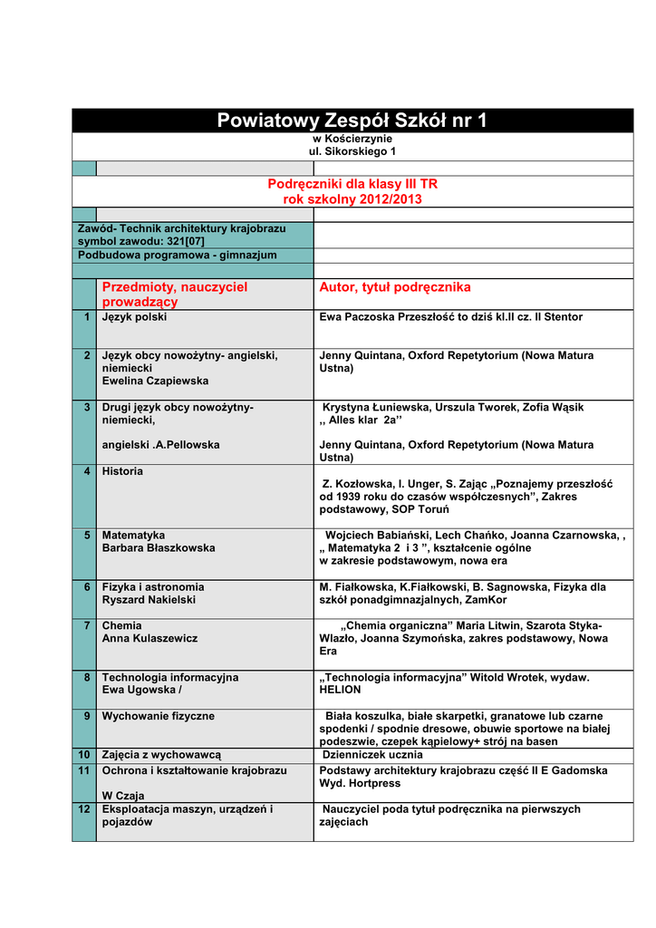 Powiatowy Zespół Szkół nr 1 w Kościerzynie ul. Sikorskiego 1 Podręczniki dla klasy III TR rok szkolny 2012/2013 Zawód- Technik architektury krajobrazu symbol zawodu: 321[07] Podbudowa programowa - gimnazjum Przedmioty, nauczyciel prowadzący Autor, tytuł podręcznika 1 Język polski Ewa Paczoska Przeszłość to dziś kl.II cz. II Stentor 2 Język obcy nowoŜytny- angielski, niemiecki Ewelina Czapiewska Jenny Quintana, Oxford Repetytorium (Nowa Matura Ustna) 3 Drugi język obcy nowoŜytnyniemiecki, Krystyna Łuniewska, Urszula Tworek, Zofia Wąsik ,, Alles klar 2a’’ angielski .A.Pellowska Jenny Quintana, Oxford Repetytorium (Nowa Matura Ustna) 4 Historia Z. Kozłowska, I. Unger, S. Zając „Poznajemy przeszłość od 1939 roku do czasów współczesnych”, Zakres podstawowy, SOP Toruń 5 Matematyka Barbara Błaszkowska Wojciech Babiański, Lech Chańko, Joanna Czarnowska, , „ Matematyka 2 i 3 ”, kształcenie ogólne w zakresie podstawowym, nowa era 6 Fizyka i astronomia Ryszard Nakielski M. Fiałkowska, K.Fiałkowski, B. Sagnowska, Fizyka dla szkół ponadgimnazjalnych, ZamKor 7 Chemia Anna Kulaszewicz „Chemia organiczna” Maria Litwin, Szarota StykaWlazło, Joanna Szymońska, zakres podstawowy, Nowa Era 8 Technologia informacyjna Ewa Ugowska / „Technologia informacyjna” Witold Wrotek, wydaw. HELION 9 Wychowanie fizyczne Biała koszulka, białe skarpetki, granatowe lub czarne spodenki / spodnie dresowe, obuwie sportowe na białej podeszwie, czepek kąpielowy+ strój na basen Dzienniczek ucznia Podstawy architektury krajobrazu część II E Gadomska Wyd. Hortpress 10 11 Zajęcia z wychowawcą Ochrona i kształtowanie krajobrazu 12 W Czaja Eksploatacja maszyn, urządzeń i pojazdów Nauczyciel poda tytuł podręcznika na pierwszych zajęciach 13 Rośliny ozdobne Nauczyciel poda tytuł podręcznika na pierwszych zajęciach 14 Urządzanie i pielęgnacja obiektów architektury krajobrazu Alicja Adamska „Urządzanie i pielęgnacja terenów zieleni cz. II tom II i III” K. Gadomski wyd. Hortpress 15 Podstawy projektowania architektury krajobrazu Alicja Adamska Prowadzenie działalności gospodarczej Podstawy architektury krajobrazu cz. I wyd. Hortpress 17 Religia/etyka Nie kupować (katecheta poda tytuł podręcznika na pierwszych zajęciach) 18 Wychowanie do Ŝycia w rodzinie Nauczyciel tytuł podręcznika poda na pierwszych zajęciach 16 Nauczyciel tytuł podręcznika poda na pierwszych zajęciach