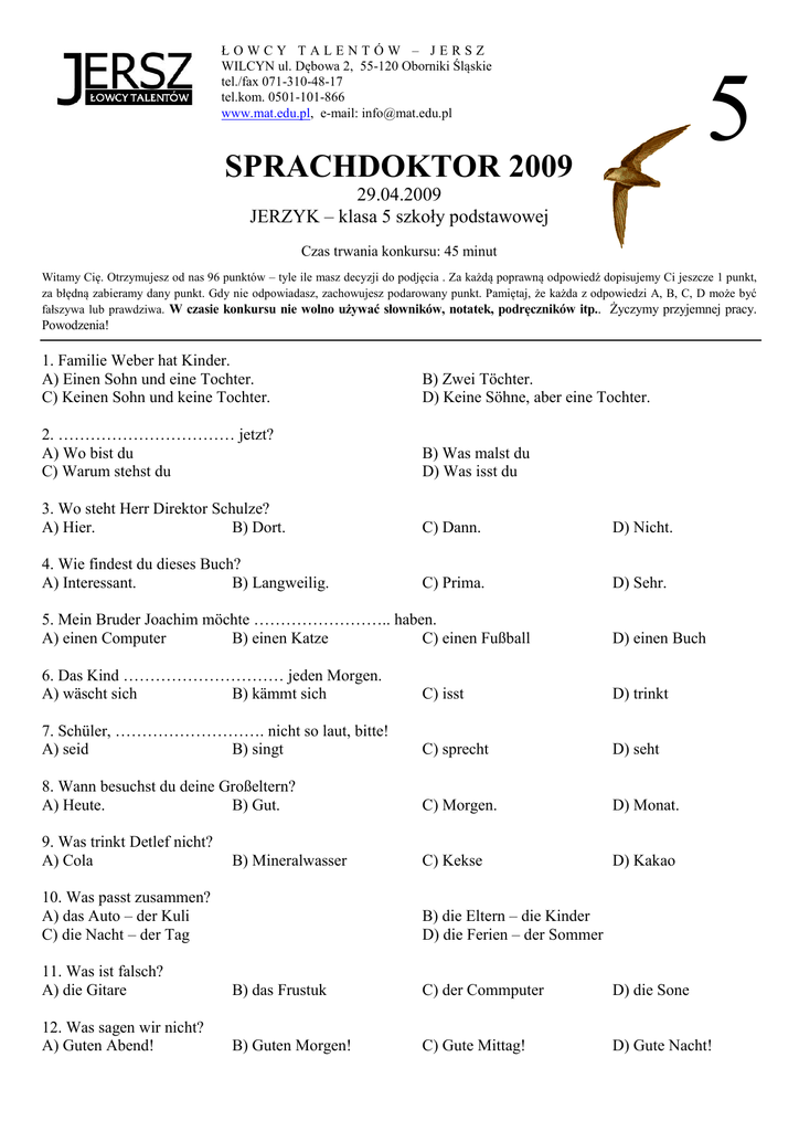 ŁOWCY TALENTÓW – JERSZ WILCYN ul. Dębowa 2, 55-120 Oborniki Śląskie tel./fax 071-310-48-17 tel.kom. 0501-101-866 www.mat.edu.pl, e-mail: [email protected] 5 SPRACHDOKTOR 2009 29.04.2009 JERZYK – klasa 5 szkoły podstawowej Czas trwania konkursu: 45 minut Witamy Cię. Otrzymujesz od nas 96 punktów – tyle ile masz decyzji do podjęcia . Za każdą poprawną odpowiedź dopisujemy Ci jeszcze 1 punkt, za błędną zabieramy dany punkt. Gdy nie odpowiadasz, zachowujesz podarowany punkt. Pamiętaj, że każda z odpowiedzi A, B, C, D może być fałszywa lub prawdziwa. W czasie konkursu nie wolno używać słowników, notatek, podręczników itp.. Życzymy przyjemnej pracy. Powodzenia! 1. Familie Weber hat Kinder. A) Einen Sohn und eine Tochter. C) Keinen Sohn und keine Tochter. B) Zwei Töchter. D) Keine Söhne, aber eine Tochter. 2. …………………………… jetzt? A) Wo bist du C) Warum stehst du B) Was malst du D) Was isst du 3. Wo steht Herr Direktor Schulze? A) Hier. B) Dort. C) Dann. D) Nicht. 4. Wie findest du dieses Buch? A) Interessant. B) Langweilig. C) Prima. D) Sehr. 5. Mein Bruder Joachim möchte …………………….. haben. A) einen Computer B) einen Katze C) einen Fußball D) einen Buch 6. Das Kind ………………………… jeden Morgen. A) wäscht sich B) kämmt sich C) isst D) trinkt 7. Schüler, ………………………. nicht so laut, bitte! A) seid B) singt C) sprecht D) seht 8. Wann besuchst du deine Großeltern? A) Heute. B) Gut. C) Morgen. D) Monat. 9. Was trinkt Detlef nicht? A) Cola C) Kekse D) Kakao B) Mineralwasser 10. Was passt zusammen? A) das Auto – der Kuli C) die Nacht – der Tag B) die Eltern – die Kinder D) die Ferien – der Sommer 11. Was ist falsch? A) die Gitare B) das Frustuk C) der Commputer D) die Sone 12. Was sagen wir nicht? A) Guten Abend! B) Guten Morgen! C) Gute Mittag! D) Gute Nacht! 13. Was nicht alt ist, ist ………………………. . A) dick B) neu C) jung D) rund 14. Mein Hund ………………………….. . A) springt B) liegt C) hat D) fragt 15. Wer geht in die Grundschule? A) Kinder B) Meine Freundin C) Ein Bäcker D) Ich 16. Ich …………………. in Wien. A) wohne B) komme C) lebe D) bleibe 17. Winter: ………………………. . A) Es schneit. B) Schlittenfahrt C) Weihnachten D) kalt 18 ……………………. Sofa. A) Eine B) Meine C) Die D) Das 19. Sie heißt …………………….. . A) Petra B) Andrea C) Peter D) Andreas 20. Wie alt ist Ulrike? A) Meine Schwester. C) Elf. B) Sie heißt Ulrike. D) Sie ist alt. 21. Assoziationen (skojarzenia) – „Klassenzimmer“: ……………………….. . A) Tafel B) Hund C) Regal D) Tisch 22. Orthographie: Wo steckt der Fehler? A) Taxifarer B) Verkeufer C) Programmirer D) Lerer 23. „Birne“ – Wie heißt das auf Polnisch? A) jabłko B) cytryna C) gruszka D) pomarańcza 24. Ein ………………….zimmer. A) KinderB) Küch- C) Wohn- D) Bade- © Copyright by Łowcy Talentów – JERSZ, Wrocław 2009
