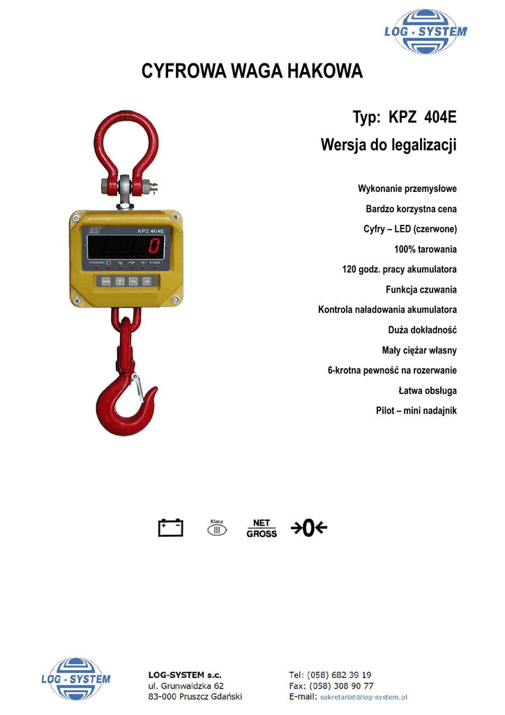 CYFROWA WAGA HAKOWA Typ: KPZ 404E Wersja do legalizacji Wykonanie przemysłowe Bardzo korzystna cena Cyfry – LED (czerwone) 100% tarowania 120 godz. pracy akumulatora Funkcja czuwania Kontrola naładowania akumulatora Duża dokładność Mały ciężar własny 6-krotna pewność na rozerwanie Łatwa obsługa Pilot – mini nadajnik Cyfrowa- waga hakowa, typ KPZ 404E KPZ 404E do zastosowania z legalizacją lub bez legalizacji. Lekka, a mimo to solidna waga hakowa o dużym udźwigu. Standardowo wyposażona w wewnętrzny akumulator, ładowarkę, pilot oraz w hak z zabezpieczeniem przed wyhaczeniem. Zaświadczenie: dopuszczenie do legalizacji EU klasa III, deklaracja zgodności CE Zakres ważenia: 1500kg, 3000kg i 5000kg Bezpieczeństwo: KPZ 404E ma 2-krotny udźwig i 6-krotne obciążenie niszczące. Panel sterujący: Najnowocześniejsza elektronika sterowana za pomocą mikroprocesora w obudowie aluminiowej, stosowana do najtrudniejszych zadań w przemyśle, dlatego największe znaczenie ma tu dokładność i niezawodność. Czytelny, 5- pozycyjny, 7- segmentowy wyświetlacz LED z cyframi o wysokości 25,4mm. Dokładność: < 0,1% vdE. Wyświetlacz LED: ustawianie zera, tara, stabilność, kontrola stanu ładowania, niski stan napięcia akumulatora, jednostka wagi, Funkcje: włączanie/ wyłączanie przez osobny włącznik, przełączanie ciężaru brutto-/netto, 100 % tary, automatyczne i ręczne ustawienie zera. 10-krotna wysoka rozdzielczość. Możliwość ustawienia przez menu: funkcja ciężaru zadanego (sygnał dźwiękowy po osiągnięciu wartości ciężaru) Pilot: do KPZ 404E z zasięgiem do ok. 24,6m. Funkcje: włączanie/wyłączanie, ustawianie zera, tarowanie, wskazywanie wartości brutto, wysoka rozdzielczość. Zasilanie sieciowe: Niezależne od sieci, przez akumulator do ponownego ładowania. Czas pracy: około 120 godzin. Możliwość odczytu napięcia akumulatora na panelu sterującym. Niski stan napięcia akumulatora wskazywany jest przez optyczny sygnał (mrugająca dioda LED) około 1 do 2 godzin przed kompletnym rozładowaniem akumulatora i wyłączeniem wagi. Funkcja czuwania / automatyczne rozłączenie panelu sterującego i/ lub wagi w celu oszczędności akumulatora. Ładowanie za pomocą ładowarki do gniazda wtykowego 230V. Kontrola stanu naładowania przez diodę LED. Wewnętrzny akumulator. Urządzenie do ładowania 230VAC. Temperatura pracy: od -10°C do + 40°C. Wymiary do 5tbciążenie Wymiary do 1,5t i 3t BC E F G Ciężar własny Typ Obciążenie znamionowe Podziałka Do legalizacji Ciężar własny 404E/0015 1.500 kg 0,5 kg Tak 14 kg 404E/0030 3.000 kg 1,0 kg Tak 14 kg 404E/0050 5.000 kg 2,0 kg Tak 22 kg