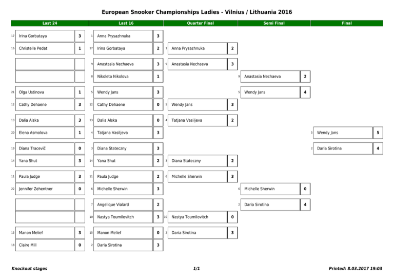 European Snooker Championships Ladies - Vilnius / Lithuania 2016 Last 24 Last 16 17 Irina Gorbataya 3 1 16 Christelle Pedat 1 17 Quarter Final Semi Final Final Anna Prysazhnuka 3 Irina Gorbataya 2 1 Anna Prysazhnuka 2 9 Anastasia Nechaeva 3 9 Anastasia Nechaeva 3 8 Nikoleta Nikolova 1 9 Anastasia Nechaeva 2 Wendy Jans 3 5 Wendy Jans 4 21 Olga Ustinova 1 5 12 Cathy Dehaene 3 12 Cathy Dehaene 0 5 Wendy Jans 3 13 Dalia Alska 3 13 Dalia Alska 0 4 Tatjana Vasiljeva 2 20 Elena Asmolova 1 4 Tatjana Vasiljeva 3 5 Wendy Jans 5 19 Diana Tracevič 0 3 Diana Stateczny 3 2 Daria Sirotina 4 14 Yana Shut 3 14 Yana Shut 2 3 Diana Stateczny 2 11 Paula Judge 3 11 Paula Judge 2 6 Michelle Sherwin 3 22 Jennifer Zehentner 0 6 Michelle Sherwin 3 6 Michelle Sherwin 0 7 Angelique Vialard 2 2 Daria Sirotina 4 10 Nastya Toumilovitch 3 10 2 15 Manon Melief 3 15 Manon Melief 0 18 Claire Mill 0 2 Daria Sirotina 3 Knockout stages Nastya Toumilovitch 0 Daria Sirotina 3 1/1 Printed: 8.03.2017 19:03
