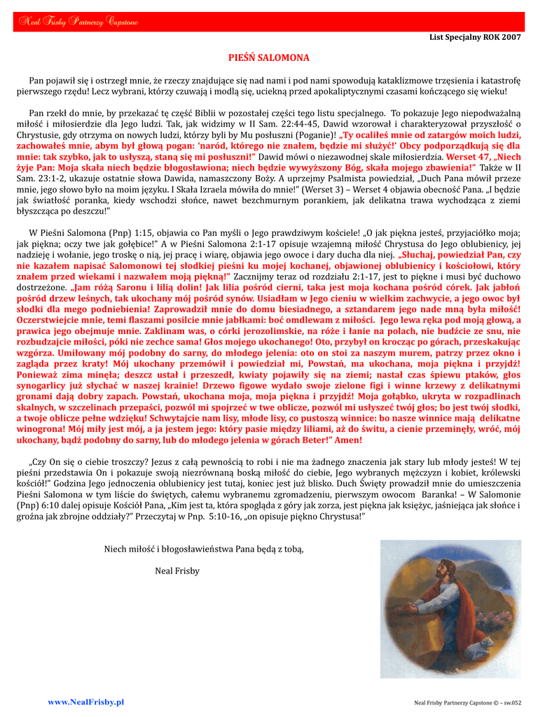 1. Neal Frisby Partnerzy Capstone List Specjalny ROK 2007 PIEŚŃ SALOMONA Pan pojawił się i ostrzegł mnie, że rzeczy znajdujące się nad nami i pod nami spowodują kataklizmowe trzęsienia i katastrofę pierwszego rzędu! Lecz wybrani, którzy czuwają i modlą się, uciekną przed apokaliptycznymi czasami kończącego się wieku! Pan rzekł do mnie, by przekazać tę część Biblii w pozostałej części tego listu specjalnego. To pokazuje Jego niepodważalną miłość i miłosierdzie dla Jego ludzi. Tak, jak widzimy w II Sam. 22:44-45, Dawid wzorował i charakteryzował przyszłość o Chrystusie, gdy otrzyma on nowych ludzi, którzy byli by Mu posłuszni (Poganie)! „Ty ocaliłeś mnie od zatargów moich ludzi, zachowałeś mnie, abym był głową pogan: ‘naród, którego nie znałem, będzie mi służyć!’ Obcy podporządkują się dla mnie: tak szybko, jak to usłyszą, staną się mi posłuszni!” Dawid mówi o niezawodnej skale miłosierdzia. Werset 47, „Niech żyje Pan: Moja skała niech będzie błogosławiona; niech będzie wywyższony Bóg, skała mojego zbawienia!” Także w II Sam. 23:1-2, ukazuje ostatnie słowa Dawida, namaszczony Boży. A uprzejmy Psalmista powiedział, „Duch Pana mówił przeze mnie, jego słowo było na moim języku. I Skała Izraela mówiła do mnie!” (Werset 3) – Werset 4 objawia obecność Pana. „I będzie jak światłość poranka, kiedy wschodzi słońce, nawet bezchmurnym porankiem, jak delikatna trawa wychodząca z ziemi błyszcząca po deszczu!” W Pieśni Salomona (Pnp) 1:15, objawia co Pan myśli o Jego prawdziwym kościele! „O jak piękna jesteś, przyjaciółko moja; jak piękna; oczy twe jak gołębice!” A w Pieśni Salomona 2:1-17 opisuje wzajemną miłość Chrystusa do Jego oblubienicy, jej nadzieję i wołanie, jego troskę o nią, jej pracę i wiarę, objawia jego owoce i dary ducha dla niej. „Słuchaj, powiedział Pan, czy nie kazałem napisać Salomonowi tej słodkiej pieśni ku mojej kochanej, objawionej oblubienicy i kościołowi, który znałem przed wiekami i nazwałem moją piękną!” Zacznijmy teraz od rozdziału 2:1-17, jest to piękne i musi być duchowo dostrzeżone. „Jam różą Saronu i lilią dolin! Jak lilia pośród cierni, taka jest moja kochana pośród córek. Jak jabłoń pośród drzew leśnych, tak ukochany mój pośród synów. Usiadłam w Jego cieniu w wielkim zachwycie, a jego owoc był słodki dla mego podniebienia! Zaprowadził mnie do domu biesiadnego, a sztandarem jego nade mną była miłość! Oczerstwiejcie mnie, temi flaszami posilcie mnie jabłkami: boć omdlewam z miłości. Jego lewa ręka pod moją głową, a prawica jego obejmuje mnie. Zaklinam was, o córki jerozolimskie, na róże i łanie na polach, nie budźcie ze snu, nie rozbudzajcie miłości, póki nie zechce sama! Głos mojego ukochanego! Oto, przybył on krocząc po górach, przeskakując wzgórza. Umiłowany mój podobny do sarny, do młodego jelenia: oto on stoi za naszym murem, patrzy przez okno i zagląda przez kraty! Mój ukochany przemówił i powiedział mi, Powstań, ma ukochana, moja piękna i przyjdź! Ponieważ zima minęła; deszcz ustał i przeszedł, kwiaty pojawiły się na ziemi; nastał czas śpiewu ptaków, głos synogarlicy już słychać w naszej krainie! Drzewo figowe wydało swoje zielone figi i winne krzewy z delikatnymi gronami dają dobry zapach. Powstań, ukochana moja, moja piękna i przyjdź! Moja gołąbko, ukryta w rozpadlinach skalnych, w szczelinach przepaści, pozwól mi spojrzeć w twe oblicze, pozwól mi usłyszeć twój głos; bo jest twój słodki, a twoje oblicze pełne wdzięku! Schwytajcie nam lisy, młode lisy, co pustoszą winnice: bo nasze winnice mają delikatne winogrona! Mój miły jest mój, a ja jestem jego: który pasie między liliami, aż do świtu, a cienie przeminęły, wróć, mój ukochany, bądź podobny do sarny, lub do młodego jelenia w górach Beter!” Amen! „Czy On się o ciebie troszczy? Jezus z całą pewnością to robi i nie ma żadnego znaczenia jak stary lub młody jesteś! W tej pieśni przedstawia On i pokazuje swoją niezrównaną boską miłość do ciebie, Jego wybranych mężczyzn i kobiet, królewski kościół!” Godzina Jego jednoczenia oblubienicy jest tutaj, koniec jest już blisko. Duch Święty prowadził mnie do umieszczenia Pieśni Salomona w tym liście do świętych, całemu wybranemu zgromadzeniu, pierwszym owocom Baranka! – W Salomonie (Pnp) 6:10 dalej opisuje Kościół Pana, „Kim jest ta, która spogląda z góry jak zorza, jest piękna jak księżyc, jaśniejąca jak słońce i groźna jak zbrojne oddziały?” Przeczytaj w Pnp. 5:10-16, „on opisuje piękno Chrystusa!” Niech miłość i błogosławieństwa Pana będą z tobą, Neal Frisby www.NealFrisby.pl Neal Frisby Partnerzy Capstone © – sw.052