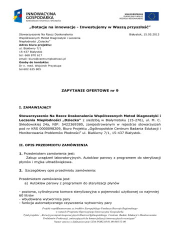 „Dotacje na innowacje - Inwestujemy w Waszą przyszłość” Stowarzyszenie Na Rzecz Doskonalenia Współczesnych Metod Diagnostyki i Leczenia Niepłodności „Dziecko” Adres biura projektu: ul. Białówny 7/1 15-437 Białystok tel: 668 870 617 email: [email protected] Osoby do kontaktu: Dr n. med. Wojciech Przystupa tel.602 635 805 Białystok, 15.05.2013 ZAPYTANIE OFERTOWE nr 9 I. ZAMAWIAJĄCY Stowarzyszenie Na Rzecz Doskonalenia Współczesnych Metod Diagnostyki i Leczenia Niepłodności „Dziecko” z siedzibą w Białymstoku (15-276), ul. M. C. Skłodowskiej 24a, NIP: 5422369380, zarejestrowanym w rejestrze stowarzyszeń pod nr KRS 0000098209, Biuro Projektu „Ogólnopolskie Centrum Badania Edukacji i Monitorowania Problemów Płodności” ul. Białówny 7/1, 15-437 Białystok. II. OPIS PRZEDMIOTU ZAMÓWIENIA 1. Przedmiotem zamówienia jest: Zakup urządzeń laboratoryjnych. Autoklaw parowy z programem do sterylizacji płynów i myjka ultradźwiękowa. 2. Szczegółowy opis przedmiotu zamówienia: Przedmiotem zamówienia jest: a) Autoklaw parowy z programem do sterylizacji płynów - pozioma, cylindryczna komora sterylizacyjna o pojemności użytkowej co najmniej 60 litrów - wbudowana wytwornica pary - funkcja automatycznego czyszczenia wytwornicy pary Projekt współfinansowany ze środków Europejskiego Funduszu Rozwoju Regionalnego w ramach Programu Operacyjnego Innowacyjna Gospodarka. Tytuł projektu: „Rozwój powiązań kooperacyjnych Klastra-Ogólnopolskiego Centrum Badań, Edukacji i Monitorowania Problemów Prokreacji, zmierzających do komercjalizacji innowacyjnych rozwiązań” Numer umowy o dofinansowanie UDA-POIG.05.01.00-005/12-00 „Dotacje na innowacje - Inwestujemy w Waszą przyszłość” -sterowanie mikroprocesorowe - programy sterylizacji obejmujące sterylizację pożywek, posiewów, płynów, szkła, odpadów, narzędzi chirurgicznych oraz innego wyposażenia laboratoryjnego - programowalna temperatura sterylizacji w zakresie co najmniej od 105 do 136 stopni Celsjusza - program do podgrzewania i utrzymywania zadanej temperatury od 60 stopni Celsjusza - system szybkiego chłodzenia oraz system próżniowy - system chłodzenia zrzutu kondensatu do wartości bezpiecznej dla instalacji kanalizacyjnej laboratorium - dodatkowy czujnik temperatury w komorze - automatyczne ryglowanie pokrywy z blokadą temperaturową - zamknięty obieg wody w systemie szybkiego chłodzenia - funkcja automatycznego czyszczenia wytwornicy pary - komora, wytwornica, pokrywa, rama i obudowa powinna być wykonana ze stali kwasoodpornej - funkcja aparatu Kocha - zasilanie elektryczne 230/400 V 50 Hz oraz wodą 0,1 – 0,6 MPa Autoklaw powinien umożliwiać sterylizację zarówno opakowanych i nieopakowanych materiałów. Dodatkowo autoklaw powinien być wyposażony w stację odwróconej osmozy do zasilania wytwornicy pary. - b) Myjka ultradźwiękowa pojemność komory 9-10 litrów długość komory 28 – 32 cm sterowanie analogowe zawór spustowy funkcja odgazowywania funkcja grzania w zakresie temperatur od 30 – 80 stopni Celsjusza funkcja zachowania jednorodnego pola dystrybucji dźwięku zasilanie elektryczne 230V 50 Hz Dostawa i montaż na koszt wykonawcy realizującego zlecenie. Sprzedający gwarantuje specjalistyczne szkolenie dotyczące sprzętu w ramach zakupu. obsługi III. TERMIN WYKONANIA ZAMÓWIENIA I WARUNKI PŁATNOŚCI 1. Termin wykonania przedmiotu zamówienia: od 01.06.2013 do 01.09.2013 r. 2. Płatność za wykonywane przedmiotu zamówienia będzie miała miejsce w w października, chyba że strony uzgodnią inaczej. Projekt współfinansowany ze środków Europejskiego Funduszu Rozwoju Regionalnego w ramach Programu Operacyjnego Innowacyjna Gospodarka. Tytuł projektu: „Rozwój powiązań kooperacyjnych Klastra-Ogólnopolskiego Centrum Badań, Edukacji i Monitorowania Problemów Prokreacji, zmierzających do komercjalizacji innowacyjnych rozwiązań” Numer umowy o dofinansowanie UDA-POIG.05.01.00-005/12-00 „Dotacje na innowacje - Inwestujemy w Waszą przyszłość” IV. OPIS SPOSBU PRZYGOTOWANIA OFERTY 1. Oferent powinien stworzyć ofertę, która powinna zawierać minimum: - opis doświadczenia jakim dysponuje Oferent przy działaniach związanych z przedmiotem zamówienia, cenę brutto za wykonanie przedmiotu zamówienia, okres gwarancyjny sprzętu warunki gwarancji warunki serwisu pogwarancyjnego termin dostarczenia sprzętu, których dotyczy niniejsze zapytanie, podpis osoby upoważnionej, 2. Oferta musi być ważna co najmniej 30 dni od daty jej wystawienia. 3. Oferent poniesie wszystkie koszty związane z przygotowaniem i złożeniem oferty. V. MIEJSCE ORAZ TERMIN SKŁADANIA OFERT 1. Oferta powinna być przesłana za pośrednictwem: poczty, kuriera lub też dostarczona osobiście na adres biura Projektu „Ogólnopolskie Centrum Badania, Edukacji i Monitorowania Problemów Płodności”: ul. Białówny 7/1, 15-437 Białystok do dnia 27.05.2013 do godz. 12.00 (decyduje data otrzymania oferty przez Zamawiającego). 2. Ocena ofert zostanie dokonana w dniu 28.05.2013 o godz. 16.00, a wyniki i wybór najkorzystniejszej oferty zostanie ogłoszony 31.05.2013 do godziny 16:00 w siedzibie Zamawiającego. 3. Oferty złożone po terminie nie będą rozpatrywane. 4. Oferent może przed upływem terminu składania ofert zmienić lub wycofać swoją ofertę. 5. W toku badania i oceny ofert Zamawiający może żądać od oferentów wyjaśnień dotyczących treści złożonych ofert. 6. Umowa z firmą lub firmami, które złożą najkorzystniejszą ofertę zostanie podpisana do dnia 01.06.2013. 7. Zapytanie ofertowe zamieszczono na stronie: www.stowarzyszenie- dziecko.com.pl, oraz www.centrumplodnosci.pl VI. OCENA OFERT Zamawiający dokona oceny ważnych ofert na podstawie następujących kryteriów: Projekt współfinansowany ze środków Europejskiego Funduszu Rozwoju Regionalnego w ramach Programu Operacyjnego Innowacyjna Gospodarka. Tytuł projektu: „Roz