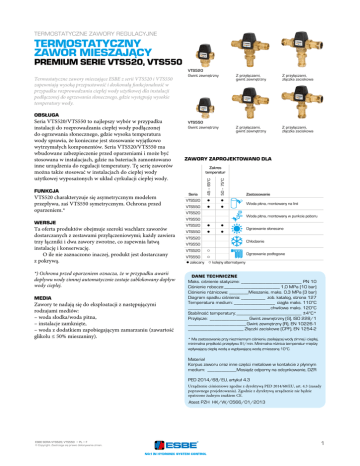 TERMOSTATYCZNE ZAWORY REGULACYJNE TERMOSTATYCZNY ZAWÓR MIESZAJĄCY PREMIUM SERIE VTS520, VTS550 Termostatyczne zawory mieszające ESBE z serii VTS520 i VTS550 zapewniają wysoką przepustowość i doskonałą funkcjonalność w przypadku rozprowadzania ciepłej wody użytkowej dla instalacji podłączonej do ogrzewania słonecznego, gdzie występują wysokie temperatury wody. VTS520 Gwint zewnętrzny Z przyłączami, gwint zewnętrzny Z przyłączami, złączka zaciskowa Z przyłączami, gwint zewnętrzny Z przyłączami, złączka zaciskowa OBSŁUGA VTS520 charakteryzuje się asymetrycznym modelem przepływu, zaś VTS550 symetrycznym. Ochrona przed oparzeniem.* WERSJE Ta oferta produktów obejmuje szeroki wachlarz zaworów dostarczanych z zestawami przyłączeniowymi; każdy zawiera trzy łączniki i dwa zawory zwrotne, co zapewnia łatwą instalację i konserwację. O ile nie zaznaczono inaczej, produkt jest dostarczany z pokrywą. *) Ochrona przed oparzeniem oznacza, że w przypadku awarii dopływu wody zimnej automatycznie zostaje zablokowany dopływ wody ciepłej. MEDIA Zawory te nadają się do eksploatacji z następującymi rodzajami mediów: – woda słodka/woda pitna, – instalacje zamknięte, – woda z dodatkiem zapobiegającym zamarzaniu (zawartość glikolu ≤ 50% mieszaniny). ZAWORY ZAPROJEKTOWANO DLA Zakres temperatur Seria 50 ‒ 75°C FUNKCJA VTS550 Gwint zewnętrzny 45 ‒ 65°C Seria VTS520/VTS550 to najlepszy wybór w przypadku instalacji do rozprowadzania ciepłej wody podłączonej do ogrzewania słonecznego, gdzie wysoka temperatura wody sprawia, że konieczne jest stosowanie wyjątkowo wytrzymałych komponentów. Seria VTS520/VTS550 ma wbudowane zabezpieczenie przed oparzeniami i może być stosowana w instalacjach, gdzie na bateriach zamontowano inne urządzenia do regulacji temperatury. Tę serię zaworów można także stosować w instalacjach do ciepłej wody użytkowej wyposażonych w układ cyrkulacji ciepłej wody. VTS520 ● ● VTS550 ● ● VTS520 Woda pitna, montowany na linii Woda pitna, montowany w punkcie poboru VTS550 VTS520 ● ● VTS550 ● ● VTS520 Ogrzewanie słoneczne Chłodzenie VTS550 VTS520 Zastosowanie ○ VTS550 ○ ● zalecany ○ kolejny alternatywny Ogrzewanie podłogowe DANE TECHNICZNE Maks. ciśnienie statyczne:__________________________ PN 10 Ciśnienie robocze:________________________ 1,0 MPa (10 bar) Ciśnienie różnicowe:_________Mieszanie, maks. 0,3 MPa (3 bar) Diagram spadku ciśnienia:___________ zob. katalog, strona 127 Temperatura medium:__________________ ciągła maks. 110°C __________________________________chwilowa maks. 120°C Stabilność temperatury:____________________________ ±4°C* Przyłącze:_________________ Gwint zewnętrzny (G), ISO 228/1 ________________________ Gwint zewnętrzny (R), EN 10226-1 _______________________ Złączki zaciskowe (CPF), EN 1254-2 * Ma zastosowanie przy niezmiennym ciśnieniu zasilającej wody zimnej i ciepłej, minimalna prędkość przepływu 9 l/min. Minimalna różnica temperatur między wpływającą ciepłą wodą a wypływającą wodą zmieszaną 10°C. Materiał Korpus zaworu oraz inne części metalowe w kontakcie z płynnym medium:_____________Mosiądz odporny na odcynkowanie, DZR PED 2014/68/EU, artykuł 4.3 Urządzenie ciśnieniowe zgodne z dyrektywą PED 2014/68/EU, art. 4.3 (zasady poprawnego projektowania). Zgodnie z dyrektywą urządzenie nie będzie opatrzone żadnym znakiem CE. Atest PZH HK/W/0566/01/2013 ESBE SERIA VTS520, VTS550 • PL • F © Copyright. Zastrzega się prawo dokonywania zmian. 1 TERMOSTATYCZNE ZAWORY REGULACYJNE TERMOSTATYCZNY ZAWÓR MIESZAJĄCY PREMIUM SERIE VTS520, VTS550 C Zimna Mieszana Ciepła Ciepła B Mieszana Zimna D E A VTS520 VTS550 SERIA VTS522, GWINT ZEWNĘTRZNY Nr art. 31720100 31720300 31720200 31720400 Nazwa Zakres temp. VTS522 45 - 65°C VTS522 50 - 75°C Kvs* Przyłącze E 3,2 G 1" 3,5 G 1¼" 3,2 G 1" 3,5 G 1¼" A Rozmiar B C D 84 62 56 60 84 62 60 56 A Rozmiar B C D 84 50 60 56 84 50 60 56 Uwaga Ciężar [kg] 0,86 0,95 0,86 0,95 SERIA VTS552, GWINT ZEWNĘTRZNY Nr art. 31740100 31740300 31740200 31740400 Nazwa Zakres temp. VTS552 45 - 65°C VTS552 50 - 75°C Kvs* Przyłącze E 3,2 G 1" 3,5 G 1¼" 3,2 G 1" 3,5 G 1¼" Uwaga Ciężar [kg] 0,78 0,87 0,78 0,87 * Wartość Kvs w m3/h przy spadku ciśnienia o 1 bar. PRZYKŁADOWE INSTALACJE Dalsze informacje i przykład podłączania można znaleźć w rozdziale katalogu „Jak wybrać poprawną instalację/ położenie”. VTS520/ VTA520 2 VTS550/ VTA550 ESBE SERIA VTS520, VTS550 • PL • F © Copyright. Zastrzega się prawo dokonywania zmian. TERMOSTATYCZNE ZAWORY REGULACYJNE TERMOSTATYCZNY ZAWÓR MIESZAJĄCY PREMIUM SERIE VTS520, VTS550 C Zimna Mieszana Ciepła Ciepła B Mieszana Zimna F A VTS520 D VTS550 SERIE VTS522/VTS523, Z PRZYŁĄCZAMI Nr art. Nazwa 31720500 VTS522 31720900 VTS523 31720700 VTS522 31721100 VTS523 31720600 VTS522 31721000 VTS523 31720800 VTS522 31721200 VTS523 Zakres temp. Kvs* 3,0 45 - 65°C 3,4 3,0 50 - 75°C 3,4 Przyłącze F A Rozmiar B C D Uwaga Ciężar [kg] R ¾" 154 97 1,22 CPF 22mm 180 110 1,42 R 1" 164 102 CPF 28mm 204 122 60 56 1) 1,59 1,90 R ¾" 154 97 1,22 CPF 22mm 180 110 1,42 R 1" 164 102 CPF 28mm 204 122 Przyłącze F A 60 56 1) 1,59 1,90 SERIA VTS552/VTS553, Z PRZYŁĄCZAMI Nr art. Nazwa 31740500 VTS552 31740900 VTS553 31740700 VTS552 31740600 VTS552 31741000 VTS553 31740800 VTS552 Zakres temp. 45 - 65°C Kvs* 3,0 3,4 50 - 75°C 3,0 3,4 Rozmiar B C R ¾" 154 85 CPF 22mm 180 98 R 1" 164 90 R ¾" 154 85 CPF 22mm 180 98 R 1" 164 90 D Uwaga Ciężar [kg] 1,14 60 56 1,34 1,51 1,14 60 56 1,34 1,51 * Wartość Kvs w m3/h przy spadku ciśnienia o 1 bar. CPF = złączka zaciskowa Uwaga: 1) Dołączone są dwa zawory zwrotne — do ciepłej i zimnej wody. ESBE SERIA VTS520, VTS550 • PL • F © Copyright. Zastrzega się prawo dokonywania zmian. 3