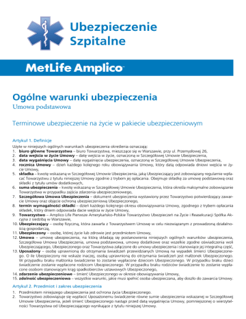 Ubezpieczenie Szpitalne Ogólne warunki ubezpieczenia Umowa podstawowa Terminowe ubezpieczenie na życie w pakiecie ubezpieczeniowym Artykuł 1. Definicje Użyte w niniejszych ogólnych warunkach ubezpieczenia określenia oznaczają: 1. biuro główne Towarzystwa – biuro Towarzystwa, mieszczące się w Warszawie, przy ul. Przemysłowej 26, 2. data wejścia w życie Umowy – datę wejścia w życie, oznaczoną w Szczegółowej Umowie Ubezpieczenia, 3. data wygaśnięcia Umowy – datę wygaśnięcia ubezpieczenia, oznaczoną w Szczegółowej Umowie Ubezpieczenia, 4. rocznica Umowy – dzień każdego kolejnego roku obowiązywania Umowy, który datą odpowiada dniowi wejścia w życie Umowy, 5. składka – kwotę wskazaną w Szczegółowej Umowie Ubezpieczenia, jaką Ubezpieczający jest zobowiązany regularnie wpłacać Towarzystwu z tytułu niniejszej Umowy zgodnie z trybem jej opłacania. Obejmuje składkę za umowę podstawową oraz składki z tytułu umów dodatkowych, 6. suma ubezpieczenia – kwotę wskazaną w Szczegółowej Umowie Ubezpieczenia, która określa maksymalne zobowiązanie Towarzystwa w przypadku zajścia zdarzenia ubezpieczeniowego, 7. Szczegółowa Umowa Ubezpieczenia – dokument ubezpieczenia wystawiony przez Towarzystwo potwierdzający zawarcie Umowy oraz objęcie ochroną ubezpieczeniową Ubezpieczonego, 8. termin wymagalności składki – dzień każdego kolejnego okresu obowiązywania Umowy, zgodnego z trybem opłacania składek, który dniem odpowiada dacie wejścia w życie Umowy, 9. Towarzystwo – Amplico Life Pierwsze Amerykańsko-Polskie Towarzystwo Ubezpieczeń na Życie i Reasekuracji Spółka Akcyjna z siedzibą w Warszawie, 10.Ubezpieczający – osobę fizyczną, która zawarła z Towarzystwem Umowę w celu niezwiązanym z prowadzoną działalnością gospodarczą, 11.Ubezpieczony – osobę, której życie lub zdrowie jest przedmiotem Umowy, 12.Umowa – umowę ubezpieczenia, na którą składają się postanowienia niniejszych ogólnych warunków ubezpieczenia, Szczegółowa Umowa Ubezpieczenia, umowa podstawowa, umowy dodatkowe oraz wszelkie zgodne oświadczenia woli Ubezpieczającego, Ubezpieczonego oraz Towarzystwa załączone do umowy ubezpieczenia i stanowiące jej integralną część, 13.Uposażony – osobę uprawnioną do otrzymania świadczeń przewidzianych Umową na wypadek śmierci Ubezpieczonego. O ile Ubezpieczony nie wskaże inaczej, osobą uprawnioną do otrzymania świadczeń jest małżonek Ubezpieczonego. W przypadku braku małżonka świadczenie to zostanie wypłacone dzieciom Ubezpieczonego. W przypadku braku dzieci świadczenie zostanie wypłacone rodzicom Ubezpieczonego. W przypadku braku rodziców świadczenie to zostanie wypłacone osobom stanowiącym krąg spadkobierców ustawowych Ubezpieczonego, 14.zdarzenie ubezpieczeniowe – śmierć Ubezpieczonego w okresie obowiązywania Umowy, 15.zdolność ubezpieczeniowa – wszystkie warunki, jakie musi spełnić osoba ubezpieczana, aby doszło do zawarcia Umowy. Artykuł 2. Przedmiot i zakres ubezpieczenia 1. Przedmiotem niniejszego ubezpieczenia jest ochrona życia Ubezpieczonego. 2. Towarzystwo zobowiązuje się wypłacić Uposażonemu świadczenie równe sumie ubezpieczenia wskazanej w Szczegółowej Umowie Ubezpieczenia, jeżeli śmierć Ubezpieczonego nastąpi przed datą wygaśnięcia Umowy, pomniejszonej o wierzytelności Towarzystwa od Ubezpieczającego wynikające z tytułu niniejszej Umowy. Artykuł 3. Kwalifikacja do ubezpieczenia 1. Ochroną ubezpieczeniową może zostać objęty Ubezpieczony, który ukończył pierwszy (1) rok życia i nie ukończył siedemdziesiątego pierwszego (71) roku życia. 2. Zawarcie Umowy przed ukończeniem pierwszego (1) roku życia lub po ukończeniu siedemdziesiątego pierwszego (71) roku życia przez Ubezpieczonego jest bezskuteczne i nie rodzi żadnych zobowiązań po stronie Towarzystwa, z wyjątkiem obowiązku zwrotu otrzymanej składki. Artykuł 4. Początek ubezpieczenia 1. Ochrona ubezpieczeniowa rozpoczyna się w dacie wejścia w życie Umowy, pod warunkiem opłacenia składki. Składka powinna wpłynąć do Towarzystwa w terminie 30 dni od daty wejścia w życie Umowy. W przypadku nieopłacenia składki w wyżej wymienionym terminie ochrona ubezpieczeniowa nie rozpocznie się. 2. Umowa zostaje zawarta następnego dnia po doręczeniu Ubezpieczającemu Szczegółowej Umowy Ubezpieczenia, z zastrzeżeniem punktu 3, 4 i 5 poniżej. 3. Jeżeli treść Szczegółowej Umowy Ubezpieczenia zawiera postanowienia odbiegające od treści: a) wniosku Ubezpieczającego lub b) Ogólnych Warunków Ubezpieczenia, Towarzystwo przy jej doręczeniu zwróci pisemnie uwagę na zachodzące różnice w Szczegółowej Umowie Ubezpieczenia. 4. W przypadku określonym w punkcie 3a) powyżej, jeżeli Ubezpieczający w terminie 7 dni od dostarczenia Szczegółowej Umowy Ubezpieczenia nie zgłosi sprzeciwu na piśmie, Umowę Ubezpieczenia uważa się za zawartą następnego dnia po upływie terminu wyznaczonego do złożenia sprzeciwu. 5. Jeżeli Ubezpieczający oświadczy, iż jest osobą zajmującą eksponowane stanowisko polityczne (zwaną dalej jako „PEP”) w rozumieniu Ustawy o przeciwdziałaniu praniu pieniędzy oraz finansowaniu terroryzmu, Umowa nie zostaje zawarta dnia następnego po doręczeniu Ubezpieczającemu Szczegółowej Umowy Ubezpieczenia i opłaceniu składki, a ochrona ubezpieczeniowa nie rozpoczyna się. Zawarcie Umowy z Ubezpieczającym będącym PEP następuje dopiero po wyrażeniu pisemnej zgody przez Zarząd, Członka Zarządu Towarzystwa lub osobę upoważnioną przez Zarząd. Artykuł 5. Błędne określenie wieku Maksymalny wiek Ubezpieczonego umożliwiający zawarcie Umowy wynosi siedemdziesiąt (70) lat. Zawarcie Umowy po ukończeniu przez Ubezpieczonego siedemdziesiątego pierwszego (71) roku życia jest bezskuteczne i nie rodzi żadnych zobowiązań ze strony Towarzystwa, oprócz obowiązku zwrotu składki. W przyp
