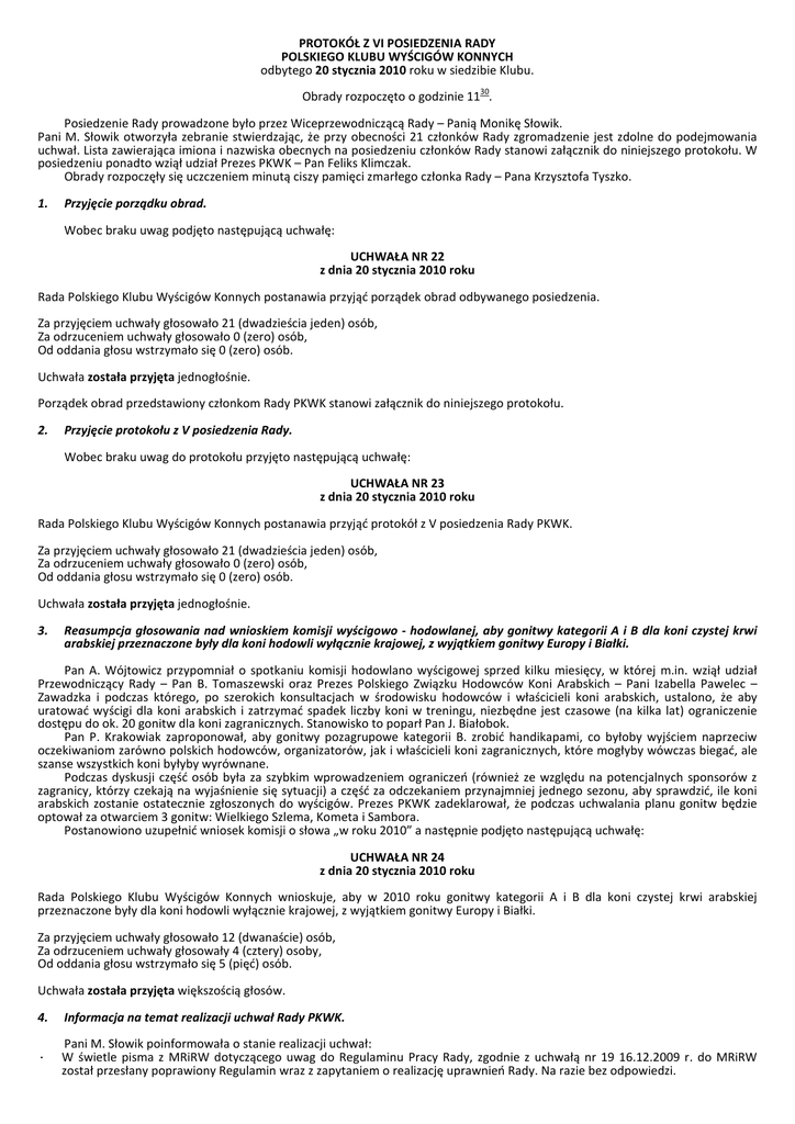 PROTOKÓŁ Z VI POSIEDZENIA RADY POLSKIEGO KLUBU WYŚCIGÓW KONNYCH odbytego 20 stycznia 2010 roku w siedzibie Klubu. 30 Obrady rozpoczęto o godzinie 11 . Posiedzenie Rady prowadzone było przez Wiceprzewodniczącą Rady – Panią Monikę Słowik. Pani M. Słowik otworzyła zebranie stwierdzając, że przy obecności 21 członków Rady zgromadzenie jest zdolne do podejmowania uchwał. Lista zawierająca imiona i nazwiska obecnych na posiedzeniu członków Rady stanowi załącznik do niniejszego protokołu. W posiedzeniu ponadto wziął udział Prezes PKWK – Pan Feliks Klimczak. Obrady rozpoczęły się uczczeniem minutą ciszy pamięci zmarłego członka Rady – Pana Krzysztofa Tyszko. 1. Przyjęcie porządku obrad. Wobec braku uwag podjęto następującą uchwałę: UCHWAŁA NR 22 z dnia 20 stycznia 2010 roku Rada Polskiego Klubu Wyścigów Konnych postanawia przyjąć porządek obrad odbywanego posiedzenia. Za przyjęciem uchwały głosowało 21 (dwadzieścia jeden) osób, Za odrzuceniem uchwały głosowało 0 (zero) osób, Od oddania głosu wstrzymało się 0 (zero) osób. Uchwała została przyjęta jednogłośnie. Porządek obrad przedstawiony członkom Rady PKWK stanowi załącznik do niniejszego protokołu. 2. Przyjęcie protokołu z V posiedzenia Rady. Wobec braku uwag do protokołu przyjęto następującą uchwałę: UCHWAŁA NR 23 z dnia 20 stycznia 2010 roku Rada Polskiego Klubu Wyścigów Konnych postanawia przyjąć protokół z V posiedzenia Rady PKWK. Za przyjęciem uchwały głosowało 21 (dwadzieścia jeden) osób, Za odrzuceniem uchwały głosowało 0 (zero) osób, Od oddania głosu wstrzymało się 0 (zero) osób. Uchwała została przyjęta jednogłośnie. 3. Reasumpcja głosowania nad wnioskiem komisji wyścigowo - hodowlanej, aby gonitwy kategorii A i B dla koni czystej krwi arabskiej przeznaczone były dla koni hodowli wyłącznie krajowej, z wyjątkiem gonitwy Europy i Białki. Pan A. Wójtowicz przypomniał o spotkaniu komisji hodowlano wyścigowej sprzed kilku miesięcy, w której m.in. wziął udział Przewodniczący Rady – Pan B. Tomaszewski oraz Prezes Polskiego Związku Hodowców Koni Arabskich – Pani Izabella Pawelec – Zawadzka i podczas którego, po szerokich konsultacjach w środowisku hodowców i właścicieli koni arabskich, ustalono, że aby uratować wyścigi dla koni arabskich i zatrzymać spadek liczby koni w treningu, niezbędne jest czasowe (na kilka lat) ograniczenie dostępu do ok. 20 gonitw dla koni zagranicznych. Stanowisko to poparł Pan J. Białobok. Pan P. Krakowiak zaproponował, aby gonitwy pozagrupowe kategorii B. zrobić handikapami, co byłoby wyjściem naprzeciw oczekiwaniom zarówno polskich hodowców, organizatorów, jak i właścicieli koni zagranicznych, które mogłyby wówczas biegać, ale szanse wszystkich koni byłyby wyrównane. Podczas dyskusji część osób była za szybkim wprowadzeniem ograniczeń (również ze względu na potencjalnych sponsorów z zagranicy, którzy czekają na wyjaśnienie się sytuacji) a część za odczekaniem przynajmniej jednego sezonu, aby sprawdzić, ile koni arabskich zostanie ostatecznie zgłoszonych do wyścigów. Prezes PKWK zadeklarował, że podczas uchwalania planu gonitw będzie optował za otwarciem 3 gonitw: Wielkiego Szlema, Kometa i Sambora. Postanowiono uzupełnić wniosek komisji o słowa „w roku 2010” a następnie podjęto następującą uchwałę: UCHWAŁA NR 24 z dnia 20 stycznia 2010 roku Rada Polskiego Klubu Wyścigów Konnych wnioskuje, aby w 2010 roku gonitwy kategorii A i B dla koni czystej krwi arabskiej przeznaczone były dla koni hodowli wyłącznie krajowej, z wyjątkiem gonitwy Europy i Białki. Za przyjęciem uchwały głosowało 12 (dwanaście) osób, Za odrzuceniem uchwały głosowały 4 (cztery) osoby, Od oddania głosu wstrzymało się 5 (pięć) osób. Uchwała została przyjęta większością głosów. 4. Informacja na temat realizacji uchwał Rady PKWK. · Pani M. Słowik poinformowała o stanie realizacji uchwał: W świetle pisma z MRiRW dotyczącego uwag do Regulaminu Pracy Rady, zgodnie z uchwałą nr 19 16.12.2009 r. do MRiRW został przesłany poprawiony Regulamin wraz z zapytaniem o realizację uprawnień Rady. Na razie bez odpowiedzi. · 16.12.2009 wysłano 2 pisma: do Prezesa PKWK oraz do Prezesa Totalizatora Sportowego z prośbą o udostępnienie członkom Rady do wglądu umowy dzierżawy z dnia 14.05.2008 r. zawartej przez PKWK i TS. Na razie bez odpowiedzi. Prezes Klimczak poinformował, że odbył spotkanie z zarządem TS w tej sprawie, który zasięgnął opinii swoich prawników i pod ich wpływem prawdopodobnie odpowiedź będzie negatywna. Odpowiedź zostanie udzielona na piśmie przez Prezesa TS. W wyniku dyskusji, zgodnie z sugestią Przewodniczącego ustalono, że jeżeli odpowiedź będzie negatywna lub w ogóle jej nie będzie, to trzeba będzie wysłać pismo z konkretnymi pytaniami dotyczącymi umowy, które zostaną ustalone przez Radę. Podjęto następującą uchwałę: UCHWAŁA NR 25 z dnia 20 stycznia 2010 roku Rada Polskiego Klubu Wyścigów Konnych postanawia przesłać ponownie prośbę o odpowiedź na pismo skierowane 16.12.2009 r. do Prezesa PKWK i TS w sprawie udostępnienia członkom Rady treści umowy dzierżawy a jeżeli odpowiedź będzie negatywna lub nie zostanie udzielona, wówczas Rada ustali listę pytań, które złożone zostaną na ręce Prezesa Polskiego Klubu Wyścigów Konnych i Prezesa Totalizatora Sportowego. Za przyjęciem uchwały głosowało 18 (osiemnaście) osób, Za odrzuceniem uchwały głosowała 1 (jedna) osoba, Od oddania głosu wstrzymały się 3 (trzy) osoby. Uchwała została przyjęta większością głosów. 5. Projekt nowelizacji Regulaminu wyścigów konnych. Pan Wojnarowski poinformował o pracy komisji regulaminowej w dniu 7.01.2010 r. w składzie: M. Wojnarowski, A. Stasiowski, P. Krakowiak, M. Łojek, R. Mateusiak, W. Bąkowski, Mirosław Stawski (sędzia – członek komi
