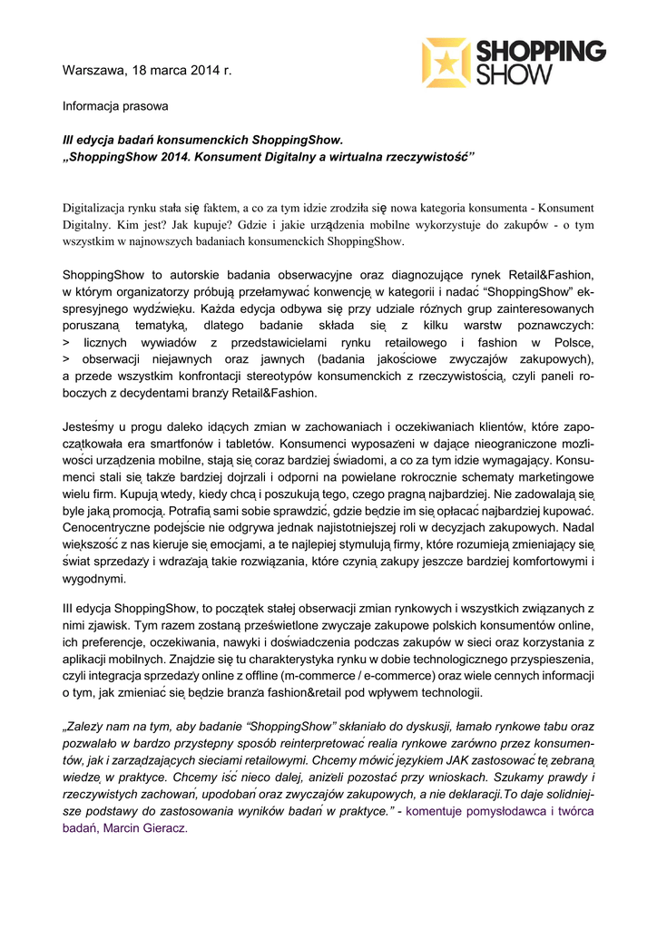 Warszawa, 18 marca 2014 r. Informacja prasowa III edycja badań konsumenckich ShoppingShow. „ShoppingShow 2014. Konsument Digitalny a wirtualna rzeczywistość” Digitalizacja rynku stała się faktem, a co za tym idzie zrodziła się nowa kategoria konsumenta - Konsument Digitalny. Kim jest? Jak kupuje? Gdzie i jakie urządzenia mobilne wykorzystuje do zakupów - o tym wszystkim w najnowszych badaniach konsumenckich ShoppingShow. ShoppingShow to autorskie badania obserwacyjne oraz diagnozujące rynek Retail&Fashion, w którym organizatorzy próbują przełamywać konwencję w kategorii i nadać “ShoppingShow” ekspresyjnego wydźwięku. Każda edycja odbywa się przy udziale różnych grup zainteresowanych poruszaną tematyką, dlatego badanie składa się z kilku warstw poznawczych: > licznych wywiadów z przedstawicielami rynku retailowego i fashion w Polsce, > obserwacji niejawnych oraz jawnych (badania jakościowe zwyczajów zakupowych), a przede wszystkim konfrontacji stereotypów konsumenckich z rzeczywistością, czyli paneli roboczych z decydentami branży Retail&Fashion. Jesteśmy u progu daleko idących zmian w zachowaniach i oczekiwaniach klientów, które zapoczątkowała era smartfonów i tabletów. Konsumenci wyposażeni w dające nieograniczone możliwości urządzenia mobilne, stają się coraz bardziej świadomi, a co za tym idzie wymagający. Konsumenci stali się także bardziej dojrzali i odporni na powielane rokrocznie schematy marketingowe wielu firm. Kupują wtedy, kiedy chcą i poszukują tego, czego pragną najbardziej. Nie zadowalają się byle jaką promocją. Potrafią sami sobie sprawdzić, gdzie będzie im się opłacać najbardziej kupować. Cenocentryczne podejście nie odgrywa jednak najistotniejszej roli w decyzjach zakupowych. Nadal większość z nas kieruje się emocjami, a te najlepiej stymulują firmy, które rozumieją zmieniający się świat sprzedaży i wdrażają takie rozwiązania, które czynią zakupy jeszcze bardziej komfortowymi i wygodnymi. III edycja ShoppingShow, to początek stałej obserwacji zmian rynkowych i wszystkich związanych z nimi zjawisk. Tym razem zostaną prześwietlone zwyczaje zakupowe polskich konsumentów online, ich preferencje, oczekiwania, nawyki i doświadczenia podczas zakupów w sieci oraz korzystania z aplikacji mobilnych. Znajdzie się tu charakterystyka rynku w dobie technologicznego przyspieszenia, czyli integracja sprzedaży online z offline (m-commerce / e-commerce) oraz wiele cennych informacji o tym, jak zmieniać się będzie branża fashion&retail pod wpływem technologii. „Zależy nam na tym, aby badanie “ShoppingShow” skłaniało do dyskusji, łamało rynkowe tabu oraz pozwalało w bardzo przystępny sposób reinterpretować realia rynkowe zarówno przez konsumentów, jak i zarządzających sieciami retailowymi. Chcemy mówić językiem JAK zastosować tę zebraną wiedzę w praktyce. Chcemy iść nieco dalej, aniżeli pozostać przy wnioskach. Szukamy prawdy i rzeczywistych zachowań, upodobań oraz zwyczajów zakupowych, a nie deklaracji.To daje solidniejsze podstawy do zastosowania wyników badań w praktyce.” - komentuje pomysłodawca i twórca badań, Marcin Gieracz. W pierwszej kolejności publikujemy przewodnik po raportach z Polski i ze świata, obrazujących digitalizację rynku. Nasz przewodnik składa się z kilkudziesięciu zestawień, danych i faktów, co pozwala jeszcze bardziej wzmocnić przekonanie, że zmiany w e-handlu zaczynają bardzo mocno wpływać i ingerować w zwyczaje zakupowe konsumentów. Dlatego chcemy, aby całe badanie nie tylko dostarczało nowej wiedzy, ale tez było motywacją oraz inspiracją do digitalnego, prorynkowego działania. Digitalizacja rynku stała się faktem i dzieje się na naszych oczach. Raport dostępny na stronie www.shoppingshow.pl Organizatorzy badań: Rubikom Strategy Consultants jest agencją doradczą, która od 2005 roku wspiera polskie przedsiębiorstwa w zakresie strategy&marketing management. Firma skupia analityków, strategów marketingowych oraz doradców w zakresie komunikacji i nowoczesnych form sprzedaży. Swoje doświadczenie firma zdobywała pracując dla kilkudziesięciu czołowych marek oraz spółek sektora MSP. W strukturach Rubikom działa także Upwebb, który specjalizuje się w strategii obecności marki w internecie. www.rubikom.pl Virtoo. Digital Sale Support to marka nowoczesnych rozwiązań. Należy do spółki Plug&Sale, która powstała z inicjatywy lidera branży nowych technologii - Grupy i3D oraz funduszu inwestycyjnego BonusCard. Virtoo oferuje nie tylko innowacyjne, multimedialne narzędzia wsparcia sprzedaży, ale także nieszablonowe rozwiązania dla branży retail, fashion i entertainment. Virtoo to także kompleksowe wsparcie w zakresie wdrażania i opracowywania strategii trade komunikacji przy użyciu urządzeń digitalnych. Partnerzy: Partner merytoryczny: Evigo.pl Partnerzy medialni: Marketing w Praktyce; Marketr+; Retail360; OOH Magazine; e-biznes.pl; Brief.pl; Nowy Marketing; PRCH (Polska Rada Centrów Handlowych); Zolago Group; Freshmail; Smart Media Project; FashionPR; Strategy Journal; Movedo. Shopper&Trade Marketing. Kontakt: Edyta Dobrowolska PR & New Business Manager tel. 515 630 762 [email protected] W ramach realizowanego projektu, w kwietniu i maju odbędą się nieodpłatne warsztaty związane z praktycznymi zastosowaniami e-commerce, m-commerce i digitalnymi rozwiązaniami w branży Retail&Fashion. Zainteresowanych zapraszamy do kontaktu.