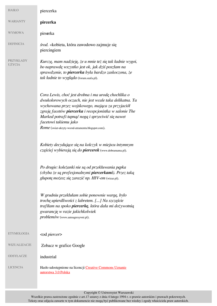 HASŁO piercerka WARIANTY pircerka WYMOWA pirserka DEFINICJA środ. «kobieta, która zawodowo zajmuje się piercingiem» PRZYKŁADY UŻYCIA Kurczę, mam nadzieję, że u mnie też się tak ładnie wygoi, bo naprawdę wszystko jest ok, jak dziś poszłam na sprawdzenie, to piercerka była bardzo zaskoczona, że tak ładnie to wygląda (forum.szafa.pl). Cora Lewis, choć jest drobna i ma urodę chochlika o dwukolorowych oczach, nie jest wcale taka delikatna. Ta wychowana przez wojskowego, mająca za przyjaciół zgraję facetów piercerka i recepcjonistka w salonie The Marked potrafi tupnąć nogą i sprzeciwić się nawet facetowi takiemu jako Rome (swiat-ukryty-wsrod-atramentu.blogspot.com). Kobiety decydujące się na kolczyk w miejscu intymnym częściej wybierają się do piercerek (www.dobramama.pl). Po drugie: koleżanki nie są od przekłuwania pępka (chyba że są profesjonalnymi piercerkami). Przez taką głupotę możesz się zarazić np. HIV-em (wizaz.pl). W grudniu przekłułam sobie ponownie wargę, było trochę upierdliwości z labretem. [...] Na szczęście trafiłam na spoko piercerkę, która dała mi dożywotnią gwarancję w razie jakichkolwiek problemów (www.autoagresywni.pl). ETYMOLOGIA WIZUALIZACJE <od piercer> Zobacz w grafice Google ODSYŁACZE industrial LICENCJA Hasło udostępnione na licencji Creative Commons Uznanie autorstwa 3.0 Polska Copyright © Uniwersytet Warszawski Wszelkie prawa zastrzeżone zgodnie z art.17 ustawy z dnia 4 lutego 1994 r. o prawie autorskim i prawach pokrewnych. Teksty oraz zdjęcia zawarte w tym dokumencie nie mogą być publikowane bez wiedzy i zgody właściciela praw autorskich. DATA Rejestracja hasła: 27.06.2016, 09.41, ostatnia aktualizacja hasła: 11.08.2016, 23.32 AUTOR Agnieszka Kostrowiecka REDAKTOR Maciej Czeszewski Copyright © Uniwersytet Warszawski Wszelkie prawa zastrzeżone zgodnie z art.17 ustawy z dnia 4 lutego 1994 r. o prawie autorskim i prawach pokrewnych. Teksty oraz zdjęcia zawarte w tym dokumencie nie mogą być publikowane bez wiedzy i zgody właściciela praw autorskich. Powered by TCPDF (www.tcpdf.org)