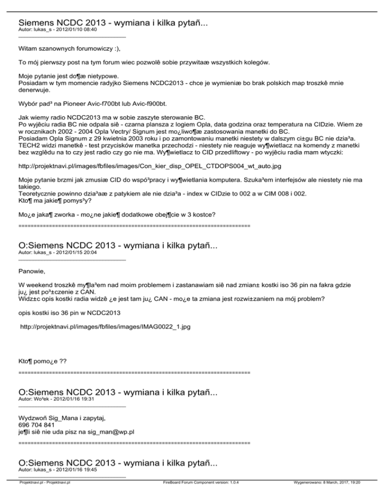 Siemens NCDC 2013 - wymiana i kilka pytañ... Autor: lukas_s - 2012/01/10 08:40 _____________________________________ Witam szanownych forumowiczy :), To mój pierwszy post na tym forum wiec pozwolê sobie przywitaæ wszystkich kolegów. Moje pytanie jest do¶æ nietypowe. Posiadam w tym momencie radyjko Siemens NCDC2013 - chce je wymieniæ bo brak polskich map troszkê mnie denerwuje. Wybór pad³ na Pioneer Avic-f700bt lub Avic-f900bt. Jak wiemy radio NCDC2013 ma w sobie zaszyte sterowanie BC. Po wyjêciu radia BC nie odpala siê - czarna plansza z logiem Opla, data godzina oraz temperatura na CIDzie. Wiem ze w rocznikach 2002 - 2004 Opla Vectry/ Signum jest mo¿liwo¶æ zastosowania manetki do BC. Posiadam Opla Signum z 29 kwietnia 2003 roku i po zamontowaniu manetki niestety w dalszym ci±gu BC nie dzia³a. TECH2 widzi manetkê - test przycisków manetka przechodzi - niestety nie reaguje wy¶wietlacz na komendy z manetki bez wzglêdu na to czy jest radio czy go nie ma. Wy¶wietlacz to CID przedliftowy - po wyjêciu radia mam wtyczki: http://projektnavi.pl/images/fbfiles/images/Con_kier_disp_OPEL_CTDOPS004_wt_auto.jpg Moje pytanie brzmi jak zmusiæ CID do wspó³pracy i wy¶wietlania komputera. Szuka³em interfejsów ale niestety nie ma takiego. Teoretycznie powinno dzia³aæ z patykiem ale nie dzia³a - index w CIDzie to 002 a w CIM 008 i 002. Kto¶ ma jakie¶ pomys³y? Mo¿e jaka¶ zworka - mo¿ne jakie¶ dodatkowe obej¶cie w 3 kostce? ============================================================================ O:Siemens NCDC 2013 - wymiana i kilka pytañ... Autor: lukas_s - 2012/01/15 20:04 _____________________________________ Panowie, W weekend troszkê my¶la³em nad moim problemem i zastanawiam siê nad zmian± kostki iso 36 pin na fakra gdzie ju¿ jest po³±czenie z CAN. Widz±c opis kostki radia widzê ¿e jest tam ju¿ CAN - mo¿e ta zmiana jest rozwi±zaniem na mój problem? opis kostki iso 36 pin w NCDC2013 http://projektnavi.pl/images/fbfiles/images/IMAG0022_1.jpg Kto¶ pomo¿e ?? ============================================================================ O:Siemens NCDC 2013 - wymiana i kilka pytañ... Autor: Wo³ek - 2012/01/16 19:31 _____________________________________ Wydzwoñ Sig_Mana i zapytaj, 696 704 841 je¶li siê nie uda pisz na [email protected] ============================================================================ O:Siemens NCDC 2013 - wymiana i kilka pytañ... Autor: lukas_s - 2012/01/16 19:45 _____________________________________ Projektnavi.pl - Projektnavi.pl FireBoard Forum Component version: 1.0.4 Wygenerowano: 8 March, 2017, 19:20 Wo³ek napisa³: Wydzwoñ Sig_Mana i zapytaj, 696 704 841 je¶li siê nie uda pisz na [email protected] ju¿ pisa³em - 11 stycznia - mam potwierdzenie odbioru maila i nic wiêcej nie bêdê siê naprzykrzaæ choæ mi³o by by³o :) generalnie 2 problemy: - CID nie gada z manetk± - CID nie wy¶wietla BC jak nie ma radia generalnie gdzie¶ dzi¶ na forum omegi wyczyta³em ¿e ponoæ po wylogowaniu radia manetka zaczyna rozmawiaæ z kompem - kto¶ potwierdzi? ============================================================================ Projektnavi.pl - Projektnavi.pl FireBoard Forum Component version: 1.0.4 Wygenerowano: 8 March, 2017, 19:20