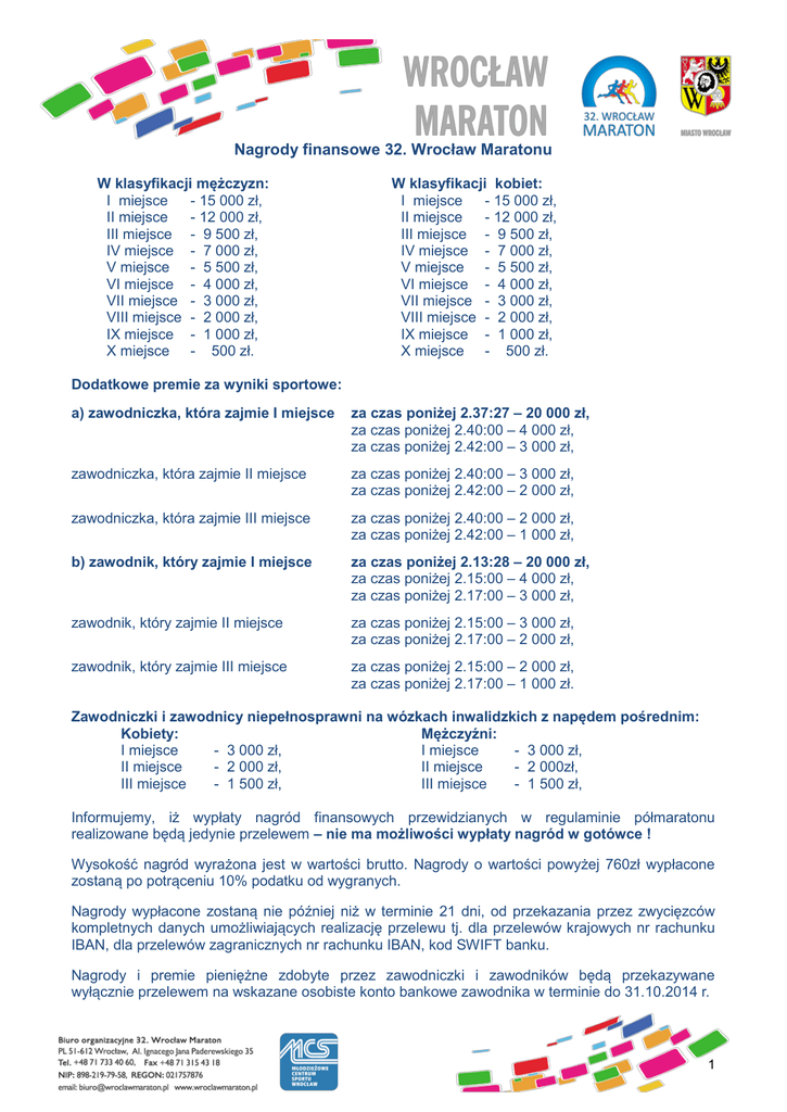 Nagrody finansowe 32. Wrocław Maratonu W klasyfikacji mężczyzn: I miejsce - 15 000 zł, II miejsce - 12 000 zł, III miejsce - 9 500 zł, IV miejsce - 7 000 zł, V miejsce - 5 500 zł, VI miejsce - 4 000 zł, VII miejsce - 3 000 zł, VIII miejsce - 2 000 zł, IX miejsce - 1 000 zł, X miejsce - 500 zł. W klasyfikacji kobiet: I miejsce - 15 000 zł, II miejsce - 12 000 zł, III miejsce - 9 500 zł, IV miejsce - 7 000 zł, V miejsce - 5 500 zł, VI miejsce - 4 000 zł, VII miejsce - 3 000 zł, VIII miejsce - 2 000 zł, IX miejsce - 1 000 zł, X miejsce - 500 zł. Dodatkowe premie za wyniki sportowe: a) zawodniczka, która zajmie I miejsce za czas poniżej 2.37:27 – 20 000 zł, za czas poniżej 2.40:00 – 4 000 zł, za czas poniżej 2.42:00 – 3 000 zł, zawodniczka, która zajmie II miejsce za czas poniżej 2.40:00 – 3 000 zł, za czas poniżej 2.42:00 – 2 000 zł, zawodniczka, która zajmie III miejsce za czas poniżej 2.40:00 – 2 000 zł, za czas poniżej 2.42:00 – 1 000 zł, b) zawodnik, który zajmie I miejsce za czas poniżej 2.13:28 – 20 000 zł, za czas poniżej 2.15:00 – 4 000 zł, za czas poniżej 2.17:00 – 3 000 zł, zawodnik, który zajmie II miejsce za czas poniżej 2.15:00 – 3 000 zł, za czas poniżej 2.17:00 – 2 000 zł, zawodnik, który zajmie III miejsce za czas poniżej 2.15:00 – 2 000 zł, za czas poniżej 2.17:00 – 1 000 zł. Zawodniczki i zawodnicy niepełnosprawni na wózkach inwalidzkich z napędem pośrednim: Kobiety: Mężczyźni: I miejsce - 3 000 zł, I miejsce - 3 000 zł, II miejsce - 2 000 zł, II miejsce - 2 000zł, III miejsce - 1 500 zł, III miejsce - 1 500 zł, Informujemy, iż wypłaty nagród finansowych przewidzianych w regulaminie półmaratonu realizowane będą jedynie przelewem – nie ma możliwości wypłaty nagród w gotówce ! Wysokość nagród wyrażona jest w wartości brutto. Nagrody o wartości powyżej 760zł wypłacone zostaną po potrąceniu 10% podatku od wygranych. Nagrody wypłacone zostaną nie później niż w terminie 21 dni, od przekazania przez zwycięzców kompletnych danych umożliwiających realizację przelewu tj. dla przelewów krajowych nr rachunku IBAN, dla przelewów zagranicznych nr rachunku IBAN, kod SWIFT banku. Nagrody i premie pieniężne zdobyte przez zawodniczki i zawodników będą przekazywane wyłącznie przelewem na wskazane osobiste konto bankowe zawodnika w terminie do 31.10.2014 r. 1