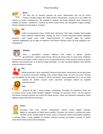 Nasz horoskop Baran Nie łódź się, że sytuacja poprawi się sama. Natychmiast weź się do pracy! Połowa miesiąca będzie dla Ciebie bardzo emocjonalna. Uważaj by to nie odbiło się zbytnio na twoim samopoczuciu. Nie popadaj w rozpacz, nie buduj zbędnych iluzji. Postaraj się podejść do sprawy z dystansem. Trzymaj się motta: każdy koniec jest początkiem czegoś nowego. W końcu kiedyś musi być dobrze. Prawda? Byk Czeka cię intensywna praca. Szkoła teraz zdominuje Twój świat, niestety Twój wysiłek może pozostać niedoceniony. Uważaj, bo ktoś w Twoim otoczeniu będzie próbował przypisać część twojej pracy sobie. Nieporozumienia w relacjach będą się nasilały. Wyjaśnij wątpliwości, by do tego nie dopuścić. Pod koniec miesiąca czeka cię miło spędzony czas. Powodzenia! Bliźnięta Wraz z początkiem miesiąca będziesz mieć mętlik w głowie. Spróbuj go poskromić i zaufać swojej intuicji. Zburzą się Twoje wizje na czyjś temat. Dojdziesz do pewnych przemyśleń i zrobisz miejsce na to co naprawdę ważne. Czeka cię spory sukces w szkole. Będziesz miał świadomość, że w pełni na niego zasłużyłeś. A w tym wszystkim będziesz mieć niemałe wsparcie bliskiej Ci osoby. Rak Szkoła przyniesie ci dużo satysfakcji! Wreszcie ktoś doceni Twoją pracę, ale nie spoczywaj na laurach, ponieważ niedługo znów trzeba będzie wziąć się ostro do pracy. Uważaj, by nie oddalać się od osoby, na której Ci zależy. Samotność, którą wybierzesz da Ci się we znaki szybciej niż myślisz. Czasem warto wymienić ostrzejsze zdania, by wyjaśnić nieporozumienia. Lew Wracasz do gdy z nową energią i pomysłami. Poczujesz się spełniony, okaże się, że wyższe oceny są dla Ciebie bardziej osiągalne. Pamiętaj, by zachować umiar i nie być egoistą. Pod koniec miesiąca pojawią się trudne dla Ciebie decyzje. Ukaże się możliwość nawiązania nowej głębszej relacji, jeśli tylko się otworzysz. Panna Poczujesz dość dużo nowych obowiązków, którym trzeba będzie sprostać. Będzie to wymagało od Ciebie sporo wysiłku. Poczujesz się znużony i przytłoczony takim obrotem spraw. Jednak świetnie stawisz czoła w momencie, kiedy trzeba będzie zawalczyć o samego Siebie i swoje poglądy. W połowie miesiąca sytuacja się uspokoi. Uważaj na plotki, przez które możesz poczuć dozę niepokoju. Waga Będziesz kierować się intuicją i wewnętrzną mądrością. Odniesiesz z tego powodu sporo korzyści! Pewna osoba wprowadzi świeżą energię do Twojego życia. Daj sobie czas na zastanowienie, by entuzjazm nie wypalił się zbyt szybko. Dobrze zweryfikuj swoje potrzeby w tym okresie. Może się to okazać kluczem do rozwiązania problemów. Skorpion Nastaw się na intensywną pracę, która przyniesie sporo korzyści. W połowie miesiąca staniesz przed wyborami i decyzjami co dalej. Z okazji urodzin dostaniesz sporo pieniędzy. Może powrócić do Ciebie temat, który dawniej uważałeś za zamknięty. Poczujesz spokój. Lecz popracuj nad zaufaniem i zazdrością. Strzelec Miesiąc zaczniesz bardzo rozradowany. Twój zapał i praca zostanie teraz doceniona i to bardziej niż myślisz. Koniec miesiąca będzie przepełniony nauką. Dobrze przemyśl każdy krok. Nadchodzi czas sprzyjający. Wreszcie odważysz się bardziej otworzyć na bliskie Ci osoby. Zaowocuje to szczęściem obu stron. Koziorożec Zaczniesz miesiąc od niezadowolenia z obecnej sytuacji w szkole. Poczujesz się przygnębiony, a może nawet załamany. Ostatnie zdarzenia mogły Cię przybić emocjonalnie. Ten stan utrzyma się przez jakiś czas. Postaraj się jednak szybko nad nim zapanować. W połowie miesiąca poczujesz siłę i sytuacja wyda Ci się inna niż wcześniej. Na szczęście otrzymasz wsparcie od bliskiej osoby. Wodnik Miesiąc zacznie się od szybkich zmian. To, w co wierzyłeś do tej pory, może okazać się zupełnie nieprawdziwe. Odrzuć jak najszybciej wszystkie iluzje. Zmiany będą radykalne, lecz bez nich nie ruszysz do przodu. Pod koniec miesiąca spotkasz kogoś, kto zainspiruje cię do zmian. Uważaj na wypowiadane słowa w kierunku bliskie Ci osoby. Pamiętaj, kłamstwo zawsze ma krótkie nogi! Ryby Poddasz się Twojej intuicji, pomoże Ci ona wydostać się z tego, w co ostatnio się zaplątałeś. Poczujesz się znudzony codziennością. Zrozumiesz wreszcie, że na sukces trzeba zapracować. Nauczysz się doceniać to, co masz. Uważaj na słowa wypowiadane pod adresem kogoś bliskiego. To dobry czas na uporządkowanie spraw osobistych. Maria Kroczek 3c