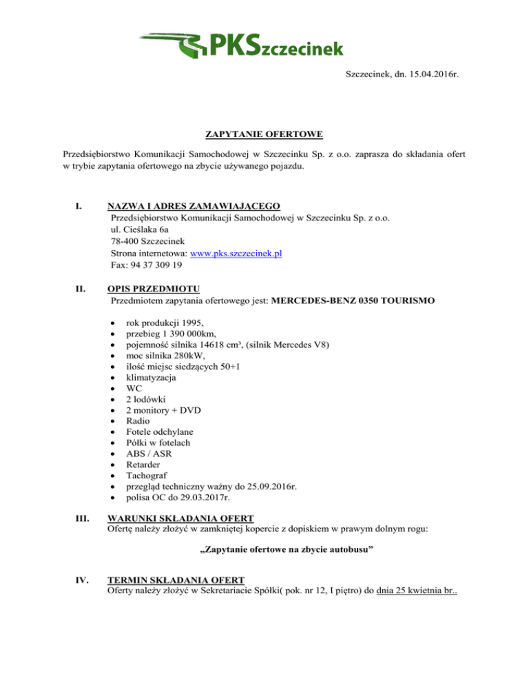 Szczecinek, dn. 15.04.2016r. ZAPYTANIE OFERTOWE Przedsiębiorstwo Komunikacji Samochodowej w Szczecinku Sp. z o.o. zaprasza do składania ofert w trybie zapytania ofertowego na zbycie używanego pojazdu. I. NAZWA I ADRES ZAMAWIAJĄCEGO Przedsiębiorstwo Komunikacji Samochodowej w Szczecinku Sp. z o.o. ul. Cieślaka 6a 78-400 Szczecinek Strona internetowa: www.pks.szczecinek.pl Fax: 94 37 309 19 II. OPIS PRZEDMIOTU Przedmiotem zapytania ofertowego jest: MERCEDES-BENZ 0350 TOURISMO III. rok produkcji 1995, przebieg 1 390 000km, pojemność silnika 14618 cm³, (silnik Mercedes V8) moc silnika 280kW, ilość miejsc siedzących 50+1 klimatyzacja WC 2 lodówki 2 monitory + DVD Radio Fotele odchylane Półki w fotelach ABS / ASR Retarder Tachograf przegląd techniczny ważny do 25.09.2016r. polisa OC do 29.03.2017r. WARUNKI SKŁADANIA OFERT Ofertę należy złożyć w zamkniętej kopercie z dopiskiem w prawym dolnym rogu: „Zapytanie ofertowe na zbycie autobusu” IV. TERMIN SKŁADANIA OFERT Oferty należy złożyć w Sekretariacie Spółki( pok. nr 12, I piętro) do dnia 25 kwietnia br.. V. DODATKOWE INFORMACJE Dodatkowe informacje udziela Andrzej Makarewicz pod numerem tel. 500 224 778 oraz pod adresem email: [email protected]