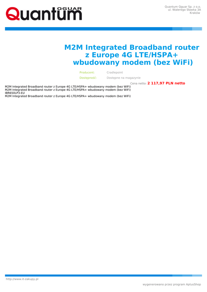 Quantum Qguar Sp. z o.o. ul. Walerego Sławka 3A Kraków M2M Integrated Broadband router z Europe 4G LTE/HSPA+ wbudowany modem (bez WiFi) Producent: Cradlepoint Dostępność: Dostępne na magazynie Cena netto: M2M Integrated Broadband router z Europe 4G LTE/HSPA+ wbudowany modem (bez WiFi) M2M Integrated Broadband router z Europe 4G LTE/HSPA+ wbudowany modem (bez WiFi) IBR650LP3-EU M2M Integrated Broadband router z Europe 4G LTE/HSPA+ wbudowany modem (bez WiFi) 2 117,97 PLN netto http://www.it-zakupy.pl wygenerowano przez program AptusShop
