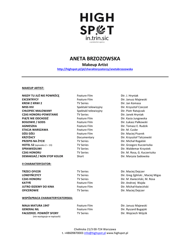 ANETA BRZOZOWSKA Makeup Artist http://highspot.pl/pl/charakteryzatorzy/anetabrzozowska MAKEUP ARTIST: NIGDY TU JUŻ NIE POWRÓCĘ EXCENTRYCY KREW Z KRWI 2 MISS HIV CHŁOPIEC MALOWANY CZAS HONORU-‐POWSTANIE PIĄTE NIE ODCHODŹ BOGOWIE / GODS AGNIESZKA STACJA WARSZAWA DŻEJ DŻEJ KRZYŻACY PRZEPIS NA ŻYCIE HOTEL 52 (episodes 2 – 13) SPRAWIEDLIWI CZAS HONORU DEMAKIJAŻ / NON STOP KOLOR II CHARAKTERYZATOR: TRZECI OFICER LONDYŃCZYCY CZAS HONORU KATYŃ JUTRO IDZIEMY DO KINA OFICEROWIE WSPÓŁPRACA CHARAKTERYZATORSKA: MAŁA MATURA 1947 GENERAŁ NIL FAŁSZERZE. POWRÓT SFORY Feature Film Feature Film TV Series Spektakl telewizyjny Spektakl telewizyjny TV Series Feature Film Feature Film Feature Film Feature Film Feature Film Documentary TV Series TV Series TV Series TV Series Short Dir. J. Hryniak Dir. Janusz Majewski Dir. Jan Komasa Dir. Krzysztof Czeczot Dir. Piotr Ratajczak Dir. Janek Hryniak Dir. Kasia Jungowska Dir. Łukasz Palkowski Dir. Tomasz E. Rudzik Dir. M. Cuske Dir. Maciej Pisarek Dir. Krzysztof Talczewski Dir. Michał Rogalski Dir. Grzegorz Kuczeriszka Dir. Waldemar Krzystek Dir. M. Rosa, G. Kuczeriszka Dir. Marysia Sadowska TV Series TV Series TV Series Feature Film Feature Film TV Series Dir. Maciej Dejczer Dir. Greg Zgliński , Maciej Migas Dir. M .Kwieciński, M. Rosa Dir. Andrzej Wajda Dir. Michał Kwieciński Dir. Maciej Dejczer Feature Film Feature Film TV Series Dir. Janusz Majewski Dir. Ryszard Bugajski Dir. Wojciech Wójcik (nie występuje w napisach) Chełmska 21/3 00-‐724 Warszawa t. +48609870003 [email protected] www.highspot.pl MAKEUP ARTIST ASSISTANT: STATYŚCI TV Series Dir. Michał Kwieciński INDIVIDUAL AWARDS: 2014 – BOGOWIE / GODS, Gdynia (Gdynia Film Festival) Nagroda za charakteryzację Chełmska 21/3 00-‐724 Warszawa t. +48609870003 [email protected] www.highspot.pl