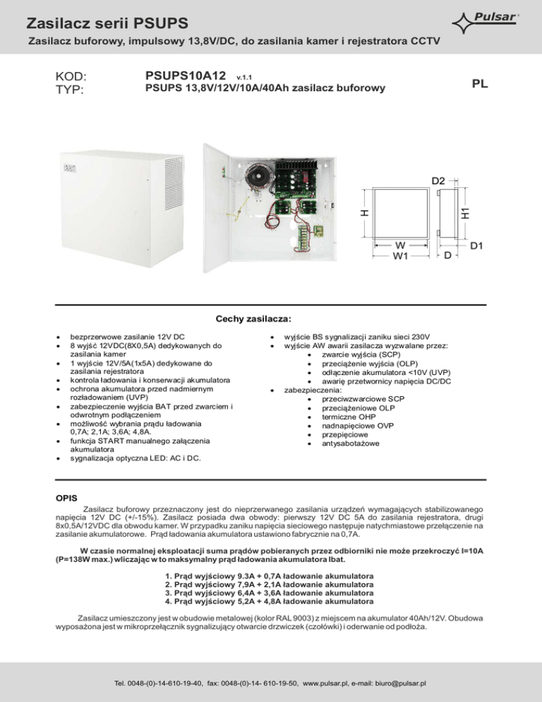 Pulsar Zasilacz serii PSUPS Zasilacz buforowy, impulsowy 13,8V/DC, do zasilania kamer i rejestratora CCTV KOD: TYP: PSUPS10A12 v.1.1 PSUPS 13,8V/12V/10A/40Ah zasilacz buforowy PL Cechy zasilacza: · · · · · · · · · bezprzerwowe zasilanie 12V DC 8 wyjść 12VDC(8X0,5A) dedykowanych do zasilania kamer 1 wyjście 12V/5A(1x5A) dedykowane do zasilania rejestratora kontrola ładowania i konserwacji akumulatora ochrona akumulatora przed nadmiernym rozładowaniem (UVP) zabezpieczenie wyjścia BAT przed zwarciem i odwrotnym podłączeniem możliwość wybrania prądu ładowania 0,7A; 2,1A; 3,6A; 4,8A. funkcja START manualnego załączenia akumulatora sygnalizacja optyczna LED: AC i DC. · · · wyjście BS sygnalizacji zaniku sieci 230V wyjście AW awarii zasilacza wyzwalane przez: · zwarcie wyjścia (SCP) · przeciążenie wyjścia (OLP) · odłączenie akumulatora <10V (UVP) · awarię przetwornicy napięcia DC/DC zabezpieczenia: · przeciwzwarciowe SCP · przeciążeniowe OLP · termiczne OHP · nadnapięciowe OVP · przepięciowe · antysabotażowe OPIS Zasilacz buforowy przeznaczony jest do nieprzerwanego zasilania urządzeń wymagających stabilizowanego napięcia 12V DC (+/-15%). Zasilacz posiada dwa obwody: pierwszy 12V DC 5A do zasilania rejestratora, drugi 8x0,5A/12VDC dla obwodu kamer. W przypadku zaniku napięcia sieciowego następuje natychmiastowe przełączenie na zasilanie akumulatorowe. Prąd ładowania akumulatora ustawiono fabrycznie na 0,7A. W czasie normalnej eksploatacji suma prądów pobieranych przez odbiorniki nie może przekroczyć I=10A (P=138W max.) wliczając w to maksymalny prąd ładowania akumulatora Ibat. 1. Prąd wyjściowy 9.3A + 0,7A ładowanie akumulatora 2. Prąd wyjściowy 7,9A + 2,1A ładowanie akumulatora 3. Prąd wyjściowy 6,4A + 3,6A ładowanie akumulatora 4. Prąd wyjściowy 5,2A + 4,8A ładowanie akumulatora Zasilacz umieszczony jest w obudowie metalowej (kolor RAL 9003) z miejscem na akumulator 40Ah/12V. Obudowa wyposażona jest w mikroprzełącznik sygnalizujący otwarcie drzwiczek (czołówki) i oderwanie od podłoża. wyjście TAMPER : przewody 30cm Tel. 0048-(0)-14-610-19-40, fax: 0048-(0)-14- 610-19-50, www.pulsar.pl, e-mail: [email protected] ® Pulsar Zasilacz serii PSUPS Zasilacz buforowy, impulsowy 13,8V/DC, do zasilania kamer i rejestratora CCTV DANE TECHNICZNE Typ zasilacza Napięcie zasilania Pobór prądu Moc zasilacza Napięcie wyjściowe Prąd wyjściowy Pobór prądu przez układy zasilacza podczas pracy bateryjnej Napięcie tętnienia Prąd ładowania akumulatora Zabezpieczenie przed zwarciem SCP Zabezpieczenie przed przeciążeniem OLP Zabezpieczenie w obwodzie akumulatora SCP i odwrotna polaryzacja podłączenia Zabezpieczenie akumulatora przed nadmiernym rozładowaniem UVP Wyjścia techniczne: - BS wyjście sygnalizujące awarię zasilania AC - AW wyjście sygnalizujące awarię (zadziałanie SCP, OLP, UVP, awaria przetwornicy) - TAMPER wyjście sygnalizujące otwarcie obudowy zasilacza Optyczna sygnalizacja pracy Warunki pracy Obudowa Wymiary Waga netto/brutto Miejsce na akumulator Zamykanie Uwagi A (EPS - External Power Source) 230V AC (-15%/+10%), 50Hz 1,1A max 138W 11,0V ÷ 12,0V DC – praca buforowa 10,0V ÷ 12,0V DC – praca bateryjna 8x0,5A +1x5A przy założeniu: 9,3A+0,7A ład.akumulatora 7,9A+2,1A ład.akumulatora 6,4A+3,6A ład.akumulatora 5,2A+4,8A ład.akumulatora 20mA max. 50mV p-p max. 0,7A / 2,1A / 3,6A / 4,8A – (0,7A ustawienie fabryczne) 200% ÷ 250% mocy zasilacza, tryb hiccup – 13A/200ms i/lub uszkodzenie bezpiecznika topikowego w obwodzie akumulatora (wymaga wymiany wkładki topikowej) 110% ÷ 150% mocy zasilacza – elektroniczne. Odłączenie wyjść zasilacza – ponowne załączenie automatycznie po odłączeniu obwodu wyjściowego DC 10A - ograniczenie prądu, bezpiecznik topikowy F1 (awaria wymaga wymiany wkładki topikowej) U < 10,0V (± 5%) - typ OC, 50mA max. stan normalny: poziom hi-Z, awaria: poziom L (0V), opóźnienie 30s. - typ OC, 50mA max. stan normalny: poziom L(0V), awaria: poziom hi-Z, (powrót automatyczny po powrocie prawidłowej pracy) - mikrowyłącznik x2, styki NC (obudowa zamknięta i zamontowana na podłożu), 0,5A@50V DC (max.) Tak - diody LED o o II klasa środowiskowa, -10 C÷40 C metalowa IP20, kolor RAL9003 400 x 440 x 170 + 8 (WxHxD) [mm] (+/- 2), z pokrywą: 405x445x 178 11,75 / 12,60 kg 40Ah / 12V (SLA) max. Wkręt walcowy (z czoła), możliwość montażu zamka Obudowa posiada dystans od ściany (podłoża) - 8 mm Chłodzenie zasilacza: konwekcyjne ZŁĄCZA; zasilanie: f0,63-2,50, I/O PCB : f0,41÷1,63, wyjścia akumulatora BAT: 6,3F-2,5/30cm, wyjście TAMPER : przewody 30cm Tel. 0048-(0)-14-610-19-40, fax: 0048-(0)-14- 610-19-50, www.pulsar.pl, e-mail: [email protected] ®