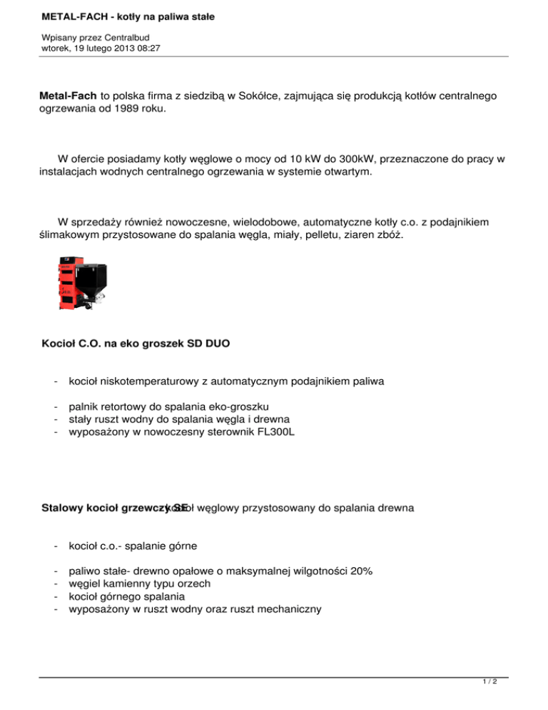 METAL-FACH - kotły na paliwa stałe Wpisany przez Centralbud wtorek, 19 lutego 2013 08:27 Metal-Fach to polska firma z siedzibą w Sokółce, zajmująca się produkcją kotłów centralnego ogrzewania od 1989 roku. W ofercie posiadamy kotły węglowe o mocy od 10 kW do 300kW, przeznaczone do pracy w instalacjach wodnych centralnego ogrzewania w systemie otwartym. W sprzedaży również nowoczesne, wielodobowe, automatyczne kotły c.o. z podajnikiem ślimakowym przystosowane do spalania węgla, miały, pelletu, ziaren zbóż. Kocioł C.O. na eko groszek SD DUO - kocioł niskotemperaturowy z automatycznym podajnikiem paliwa - palnik retortowy do spalania eko-groszku stały ruszt wodny do spalania węgla i drewna wyposażony w nowoczesny sterownik FL300L Stalowy kocioł grzewczy - kocioł SE węglowy przystosowany do spalania drewna - kocioł c.o.- spalanie górne - paliwo stałe- drewno opałowe o maksymalnej wilgotności 20% węgiel kamienny typu orzech kocioł górnego spalania wyposażony w ruszt wodny oraz ruszt mechaniczny 1/2 METAL-FACH - kotły na paliwa stałe Wpisany przez Centralbud wtorek, 19 lutego 2013 08:27 Kocioł na pellet ,SDG eko-groszek iruszt ziarna zbóż SD DUO BIO kocioł niskotemperaturowy zze automatycznym podajnikiem paliwa palnik do spalania eko-groszku, pelletu i ziaren zbóż - stały rusz wodny do spalania węgla idolnego drewna Kocioł c.o. na węgiel i wyborem drewno spalanie dolne lub dolno-górne model paliwo stałedrewno opałowe ostali maksymalnej wilgotności 20% węgiel kamienny typu orzech zrynnowy ręcznym spalania lub dolno-górnego wyposażony w ruszt wodny oraz mechaniczny korpus prostopadłościenny kotłowej grubości 5mm Pełną ofertę oraz dostępność kotłów ustalą Państwo w oddziałach naszych hurtowni. 2/2