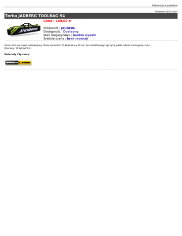 Informacje o produkcie Utworzono 08-03-2017 Torba JADBERG TOOLBAG-94 Cena : 149,00 zł Producent : JADBERG Dostępność : Dostępny Stan magazynowy : bardzo wysoki Średnia ocena : brak recenzji Duża torba na sprzęt unihokejowy. Może pomieścić 10 kijów (max 20 szt. bez dodatkowego sprzętu), patki, odzież treningową, buty... Wymiary: 123x25x23cm Materiały i Systemy:
