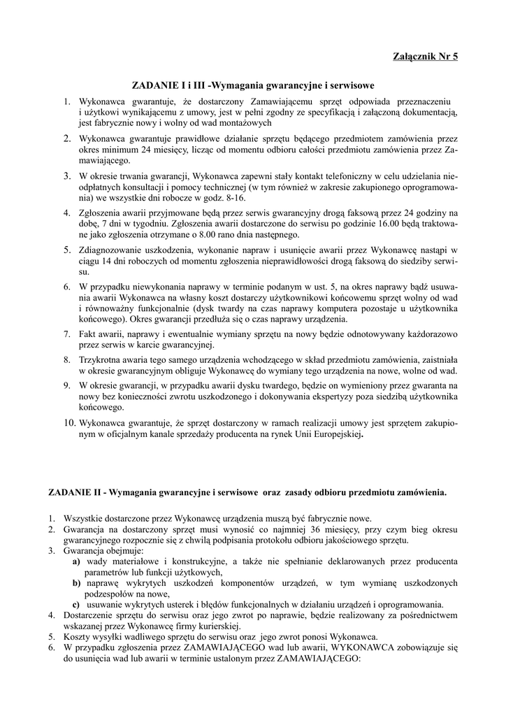 Załącznik Nr 5 ZADANIE I i III -Wymagania gwarancyjne i serwisowe 1. Wykonawca gwarantuje, że dostarczony Zamawiającemu sprzęt odpowiada przeznaczeniu i użytkowi wynikającemu z umowy, jest w pełni zgodny ze specyfikacją i załączoną dokumentacją, jest fabrycznie nowy i wolny od wad montażowych 2. Wykonawca gwarantuje prawidłowe działanie sprzętu będącego przedmiotem zamówienia przez okres minimum 24 miesięcy, licząc od momentu odbioru całości przedmiotu zamówienia przez Zamawiającego. 3. W okresie trwania gwarancji, Wykonawca zapewni stały kontakt telefoniczny w celu udzielania nieodpłatnych konsultacji i pomocy technicznej (w tym również w zakresie zakupionego oprogramowania) we wszystkie dni robocze w godz. 8-16. 4. Zgłoszenia awarii przyjmowane będą przez serwis gwarancyjny drogą faksową przez 24 godziny na dobę, 7 dni w tygodniu. Zgłoszenia awarii dostarczone do serwisu po godzinie 16.00 będą traktowane jako zgłoszenia otrzymane o 8.00 rano dnia następnego. 5. Zdiagnozowanie uszkodzenia, wykonanie napraw i usunięcie awarii przez Wykonawcę nastąpi w ciągu 14 dni roboczych od momentu zgłoszenia nieprawidłowości drogą faksową do siedziby serwisu. 6. W przypadku niewykonania naprawy w terminie podanym w ust. 5, na okres naprawy bądź usuwania awarii Wykonawca na własny koszt dostarczy użytkownikowi końcowemu sprzęt wolny od wad i równoważny funkcjonalnie (dysk twardy na czas naprawy komputera pozostaje u użytkownika końcowego). Okres gwarancji przedłuża się o czas naprawy urządzenia. 7. Fakt awarii, naprawy i ewentualnie wymiany sprzętu na nowy będzie odnotowywany każdorazowo przez serwis w karcie gwarancyjnej. 8. Trzykrotna awaria tego samego urządzenia wchodzącego w skład przedmiotu zamówienia, zaistniała w okresie gwarancyjnym obliguje Wykonawcę do wymiany tego urządzenia na nowe, wolne od wad. 9. W okresie gwarancji, w przypadku awarii dysku twardego, będzie on wymieniony przez gwaranta na nowy bez konieczności zwrotu uszkodzonego i dokonywania ekspertyzy poza siedzibą użytkownika końcowego. 10. Wykonawca gwarantuje, że sprzęt dostarczony w ramach realizacji umowy jest sprzętem zakupionym w oficjalnym kanale sprzedaży producenta na rynek Unii Europejskiej. ZADANIE II - Wymagania gwarancyjne i serwisowe oraz zasady odbioru przedmiotu zamówienia. 1. Wszystkie dostarczone przez Wykonawcę urządzenia muszą być fabrycznie nowe. 2. Gwarancja na dostarczony sprzęt musi wynosić co najmniej 36 miesięcy, przy czym bieg okresu gwarancyjnego rozpocznie się z chwilą podpisania protokołu odbioru jakościowego sprzętu. 3. Gwarancja obejmuje: a) wady materiałowe i konstrukcyjne, a także nie spełnianie deklarowanych przez producenta parametrów lub funkcji użytkowych, b) naprawę wykrytych uszkodzeń komponentów urządzeń, w tym wymianę uszkodzonych podzespołów na nowe, c) usuwanie wykrytych usterek i błędów funkcjonalnych w działaniu urządzeń i oprogramowania. 4. Dostarczenie sprzętu do serwisu oraz jego zwrot po naprawie, będzie realizowany za pośrednictwem wskazanej przez Wykonawcę firmy kurierskiej. 5. Koszty wysyłki wadliwego sprzętu do serwisu oraz jego zwrot ponosi Wykonawca. 6. W przypadku zgłoszenia przez ZAMAWIAJĄCEGO wad lub awarii, WYKONAWCA zobowiązuje się do usunięcia wad lub awarii w terminie ustalonym przez ZAMAWIAJĄCEGO: 7. 8. 9. 10. a) do 2 godzin od momentu zgłoszenia (przy naprawach i konsultacjach prowadzonych w sposób zdalny). W przypadku gdy naprawy prowadzona w sposób zdalny nie przyniesie skutku w postaci przywrócenia pełnej funkcjonalności, Wykonawca usunie zgłoszoną awarię zgodnie z ppkt. b. b) do 14 dni od momentu zgłoszenia wad i awarii w przypadku naprawy w serwisie Wykonawcy. Jeżeli naprawa uszkodzonego urządzenia nie będzie możliwa w terminie określonym w pkt. 6, dostarczone zostanie na czas naprawy urządzenie zastępcze funkcjonalnie zgodne z urządzeniem będącym w trakcie naprawy. Urządzenie zastępcze będzie dostarczone nie później niż w przeciągu 24 godzin od momentu wyznaczonego na usunięcie usterki. Elementy zastępcze wprowadzone mogą być na okres nie dłuższy niż 60 dni. Zgłoszenia uszkodzeń, usterek i błędów dokonywane będą przez uprawnione osoby Zamawiającego w formie pisemnej (fax) do zespołu serwisowego Dostawcy. W uzasadnionych przypadkach dopuszcza się zgłoszenia telefoniczne pod warunkiem jego potwierdzenia do 24 godzin zgłoszeniem pisemnym. Części i podzespoły do dostarczonego sprzętu będą dostępne na terenie Polski przez okres minimum 10 lat po zakończeniu okresu gwarancji. Trzykrotne uszkodzenie tego samego egzemplarza urządzenia lub jego elementu w okresie gwarancyjnym skutkuje wymianą sprzętu na nowy w ciągu 14 dni od chwili ostatniego zgłoszenia. Okres gwarancji na wymienione urządzenie lub jego element wynosi minimum12 miesięcy liczonych od chwili podpisania protokołu naprawy, lecz nie krócej niż okres trwania gwarancji na cały dostarczony w ramach umowy sprzęt. Przedmiot umowy będzie odbierany w dwóch etapach: 1. Odbiór jakościowy: a) Odbiór jakościowy w zakresie spełnienia wymagań i funkcjonalności określonych w załączniku nr 1 do Umowy sprzętu przeprowadzony zostanie przez Komisję powołaną do odbioru przedmiotu zamówienia ze strony Zamawiającego, w obecności przedstawiciela Wykonawcy. b) O przygotowaniu przedmiotu Umowy do odbioru jakościowego Wykonawca powiadomi Wydział Łączności i Informatyki Komendy Wojewódzkiej Policji w Szczecinie faksem na numer (91) 8211613 z co najmniej 48 godzinnym wyprzedzeniem, podając: • numer Umowy; • planowaną datę dostarczenia sprzętu do odbioru jakościowego, • nr seryjny sprzętu. c) Odbiór jakościowy przeprowadzony zostanie w Sekcji Telekomunikacji Wydziału Łączności i Informatyki Komendy Wojewódzkiej Policji w Szczecinie przy ul. Małopolskiej 47, w ciągu do 3 dni roboczych (pn-pt 7:30 – 