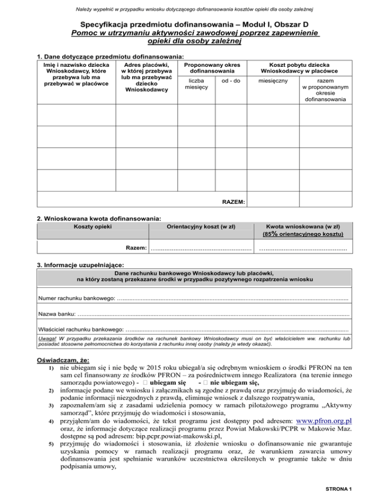 Należy wypełnić w przypadku wniosku dotyczącego dofinansowania kosztów opieki dla osoby zależnej Specyfikacja przedmiotu dofinansowania – Moduł I, Obszar D Pomoc w utrzymaniu aktywności zawodowej poprzez zapewnienie opieki dla osoby zależnej 1. Dane dotyczące przedmiotu dofinansowania: Imię i nazwisko dziecka Wnioskodawcy, które przebywa lub ma przebywać w placówce Adres placówki, w której przebywa lub ma przebywać dziecko Wnioskodawcy Proponowany okres dofinansowania liczba miesięcy od - do Koszt pobytu dziecka Wnioskodawcy w placówce miesięczny razem w proponowanym okresie dofinansowania RAZEM: 2. Wnioskowana kwota dofinansowania: Koszty opieki Orientacyjny koszt (w zł) Razem: ….................................................... Kwota wnioskowana (w zł) (85% orientacyjnego kosztu) …............................................. 3. Informacje uzupełniające: Dane rachunku bankowego Wnioskodawcy lub placówki, na który zostaną przekazane środki w przypadku pozytywnego rozpatrzenia wniosku Numer rachunku bankowego: ….......................................................................................................................................... Nazwa banku: …................................................................................................................................................................... Właściciel rachunku bankowego: …..................................................................................................................................... Uwaga! W przypadku przekazania środków na rachunek bankowy Wnioskodawcy musi on być właścicielem ww. rachunku lub posiadać stosowne pełnomocnictwa do korzystania z rachunku innej osoby (należy je wtedy okazać). Oświadczam, że: 1) 2) 3) 4) 5) nie ubiegam się i nie będę w 2015 roku ubiegał/a się odrębnym wnioskiem o środki PFRON na ten sam cel finansowany ze środków PFRON – za pośrednictwem innego Realizatora (na terenie innego samorządu powiatowego) ubiegam się - nie ubiegam się, informacje podane we wniosku i załącznikach są zgodne z prawdą oraz przyjmuję do wiadomości, że podanie informacji niezgodnych z prawdą, eliminuje wniosek z dalszego rozpatrywania, zapoznałem/am się z zasadami udzielenia pomocy w ramach pilotażowego programu „Aktywny samorząd”, które przyjmuję do wiadomości i stosowania, przyjąłem/am do wiadomości, że tekst programu jest dostępny pod adresem: www.pfron.org.pl oraz, że informacje dotyczące realizacji programu przez Powiat Makowski/PCPR w Makowie Maz. dostępne są pod adresem: bip.pcpr.powiat-makowski.pl, przyjmuję do wiadomości i stosowania, iż złożenie wniosku o dofinansowanie nie gwarantuje uzyskania pomocy w ramach realizacji programu oraz, że warunkiem zawarcia umowy dofinansowania jest spełnianie warunków uczestnictwa określonych w programie także w dniu podpisania umowy, STRONA 1 6) 7) 8) 9) 10) przyjmuję do wiadomości i stosowania, że ewentualne wyjaśnienia, uzupełnienia zapisów lub brakujących załączników do wniosku należy dostarczyć niezwłocznie, w terminie wyznaczonym przez Realizatora programu, oraz że prawidłowo zaadresowana korespondencja, która pomimo dwukrotnego awizowania nie zostanie odebrana, uznawana będzie za doręczoną, posiadam środki finansowe na pokrycie udziału własnego, wynoszącego co najmniej 15% kosztów opieki dla osoby zależnej: - posiadam - nie posiadam, przyjmuję do wiadomości, że środki finansowe stanowiące udział własny Wnioskodawcy nie mogą pochodzić ze środków PFRON, w ciągu ostatnich 3 (trzech ) lat byłem/am stroną umowy dofinansowania ze środków PFRON i rozwiązanej z przyczyn leżących po mojej stronie: byłem/am nie byłem/am, przyjmuję do wiadomości i stosowania, iż w przypadku przyznanego dofinansowania, przekazanie środków finansowych następuje na wskazany rachunek Wnioskodawcy lub na rachunek sprzedawcy przedmiotu zakupu/usługodawcy, na podstawie przedstawionej i podpisanej przez Wnioskodawcę faktury VAT. Wnioskodawca nie mogący pisać, lecz mogący czytać, zamiast podpisu może uczynić na dokumencie tuszowy odcisk palca, a obok tego odcisku inna osoba wypisze jej imię i nazwisko umieszczając swój podpis; zamiast Wnioskodawcy może także podpisać się inna osoba, z tym, że jej podpis musi być poświadczony przez notariusza lub wójta (burmistrza, prezydenta miasta), starostę lub marszałka województwa z zaznaczeniem, że podpis został złożony na życzenie nie mogącego pisać, lecz mogącego czytać. …................................., dnia …......../.................../2015 r. …................................................................ podpis Wnioskodawcy miejscowość 3. Załączniki wymagane do wniosku oraz złożone dodatkowo: WYPEŁNIA WYŁĄCZNIE REAALIZATOR PROGRAMU (należy zaznaczyć właściwe) Dołączono do wniosku Uzupełniono Nazwa załącznika Kserokopia aktualnego orzeczenia o znacznym lub umiarkowanym stopniu niepełnosprawności lub orzeczenia równoważnego Oświadczenie o wysokości przeciętnego miesięcznego dochodu w przeliczeniu na jednego członka rodziny pozostającego we wspólnym gospodarstwie domowym (sporządzone według wzoru określonego w załączniku nr 1 do wniosku) Oświadczenie/a o wyrażeniu zgody na przetwarzanie danych osobowych (sporządzone według wzoru określonego w załączniku nr 2 do formularza wniosku) – wypełnione przez Wnioskodawcę oraz inne osoby posiadające zdolność do czynności prawnych, których dane osobowe zostały przekazane do Realizatora programu 4 Kserokopia aktu urodzenia dziecka/dzieci 5 Kserokopia dokumentu stanowiących podopiecznym/podopiecznymi – o ile dotyczy 6 W przypadku zatrudnienia – zaświadczenie potwierdzające ten fakt 7 W przypadku Wnioskodawców, którzy są zarejestrowani w Powiatowym Urzędzie Pracy, zaświadczenie potwierdzające rejestrację w ww. Urzędzie 8 Faktura, z