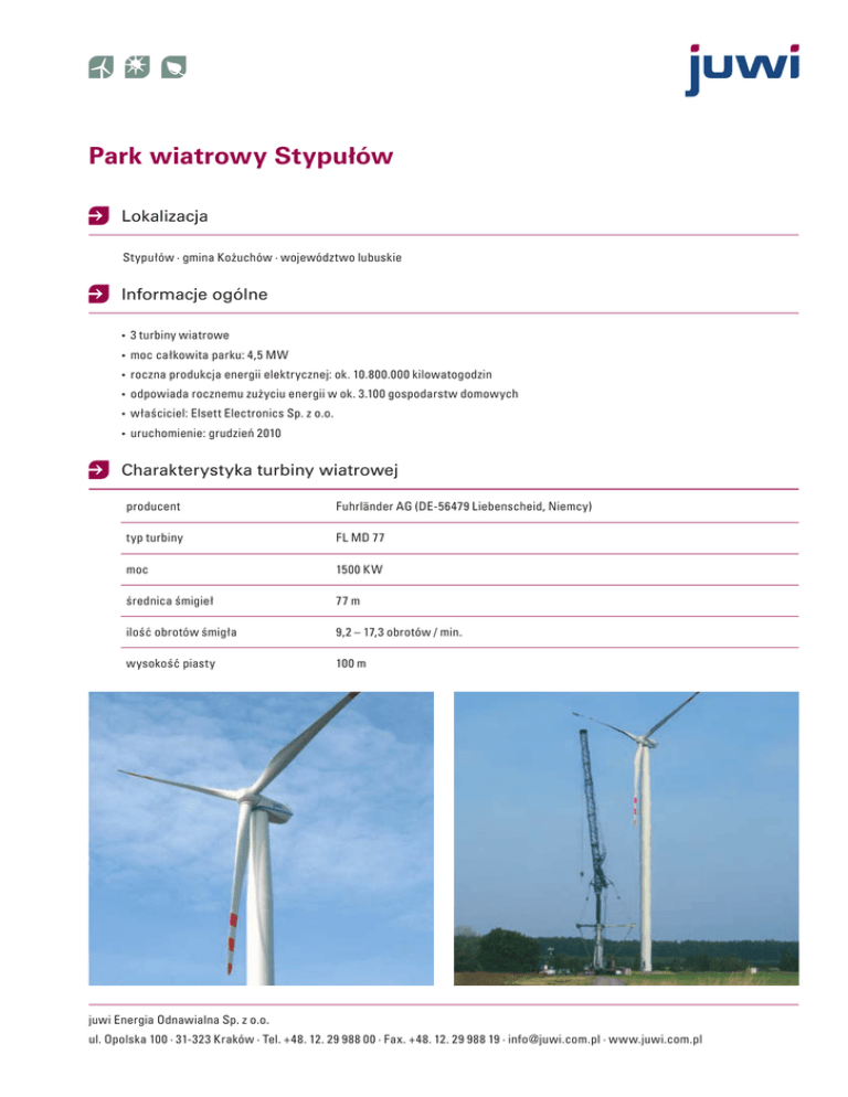 Park wiatrowy Stypułów Lokalizacja Stypułów · gmina Kożuchów · województwo lubuskie Informacje ogólne • 3 turbiny wiatrowe • moc całkowita parku: 4,5 MW • roczna produkcja energii elektrycznej: ok. 10.800.000 kilowatogodzin • odpowiada rocznemu zużyciu energii w ok. 3.100 gospodarstw domowych • właściciel: Elsett Electronics Sp. z o.o. • uruchomienie: grudzień 2010 Charakterystyka turbiny wiatrowej producent Fuhrländer AG (DE-56479 Liebenscheid, Niemcy) typ turbiny FL MD 77 moc 1500 KW średnica śmigieł 77 m ilość obrotów śmigła 9,2 – 17,3 obrotów / min. wysokość piasty 100 m juwi Energia Odnawialna Sp. z o.o. ul. Opolska 100 · 31-323 Kraków · Tel. +48. 12. 29 988 00 · Fax. +48. 12. 29 988 19 · [email protected] · www.juwi.com.pl