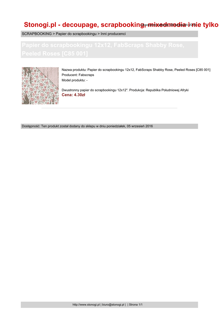 Utworzono: wtorek, 06 wrzesień i2016 Stonogi.pl - decoupage, scrapbooking, mixedmedia nie tylko. SCRAPBOOKING > Papier do scrapbookingu > Inni producenci Papier do scrapbookingu 12x12, FabScraps Shabby Rose, Peeled Roses [C85 001] Nazwa produktu: Papier do scrapbookingu 12x12, FabScraps Shabby Rose, Peeled Roses [C85 001] Producent: Fabscraps Model produktu: Dwustronny papier do scrapbookingu 12x12". Produkcja: Republika Południowej Afryki Cena: 4.30zł Dostępność: Ten produkt został dodany do sklepu w dniu poniedziałek, 05 wrzesień 2016 http://www.stonogi.pl | [email protected] | | Strona 1/1