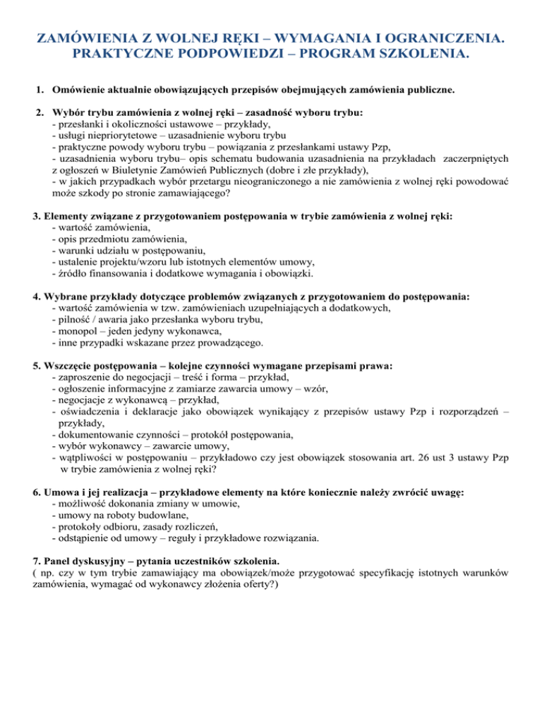 ZAMÓWIENIA Z WOLNEJ RĘKI – WYMAGANIA I OGRANICZENIA. PRAKTYCZNE PODPOWIEDZI – PROGRAM SZKOLENIA. 1. Omówienie aktualnie obowiązujących przepisów obejmujących zamówienia publiczne. 2. Wybór trybu zamówienia z wolnej ręki – zasadność wyboru trybu: - przesłanki i okoliczności ustawowe – przykłady, - usługi niepriorytetowe – uzasadnienie wyboru trybu - praktyczne powody wyboru trybu – powiązania z przesłankami ustawy Pzp, - uzasadnienia wyboru trybu– opis schematu budowania uzasadnienia na przykładach zaczerpniętych z ogłoszeń w Biuletynie Zamówień Publicznych (dobre i złe przykłady), - w jakich przypadkach wybór przetargu nieograniczonego a nie zamówienia z wolnej ręki powodować może szkody po stronie zamawiającego? 3. Elementy związane z przygotowaniem postępowania w trybie zamówienia z wolnej ręki: - wartość zamówienia, - opis przedmiotu zamówienia, - warunki udziału w postępowaniu, - ustalenie projektu/wzoru lub istotnych elementów umowy, - źródło finansowania i dodatkowe wymagania i obowiązki. 4. Wybrane przykłady dotyczące problemów związanych z przygotowaniem do postępowania: - wartość zamówienia w tzw. zamówieniach uzupełniających a dodatkowych, - pilność / awaria jako przesłanka wyboru trybu, - monopol – jeden jedyny wykonawca, - inne przypadki wskazane przez prowadzącego. 5. Wszczęcie postępowania – kolejne czynności wymagane przepisami prawa: - zaproszenie do negocjacji – treść i forma – przykład, - ogłoszenie informacyjne z zamiarze zawarcia umowy – wzór, - negocjacje z wykonawcą – przykład, - oświadczenia i deklaracje jako obowiązek wynikający z przepisów ustawy Pzp i rozporządzeń – przykłady, - dokumentowanie czynności – protokół postępowania, - wybór wykonawcy – zawarcie umowy, - wątpliwości w postępowaniu – przykładowo czy jest obowiązek stosowania art. 26 ust 3 ustawy Pzp w trybie zamówienia z wolnej ręki? 6. Umowa i jej realizacja – przykładowe elementy na które koniecznie należy zwrócić uwagę: - możliwość dokonania zmiany w umowie, - umowy na roboty budowlane, - protokoły odbioru, zasady rozliczeń, - odstąpienie od umowy – reguły i przykładowe rozwiązania. 7. Panel dyskusyjny – pytania uczestników szkolenia. ( np. czy w tym trybie zamawiający ma obowiązek/może przygotować specyfikację istotnych warunków zamówienia, wymagać od wykonawcy złożenia oferty?)