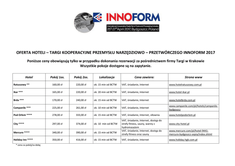 OFERTA HOTELI – TARGI KOOPERACYJNE PRZEMYSŁU NARZĘDZIOWO – PRZETWÓRCZEGO INNOFORM 2017 Poniższe ceny obowiązują tylko w przypadku dokonania rezerwacji za pośrednictwem firmy Targi w Krakowie Wszystkie pokoje dostępne są na zapytanie. Hotel Pokój 1os. Pokój 2os. Ratuszowy ** 160,00 zł 220,00 zł ok. 15 min od BCTW VAT, śniadanie, Internet www.hotelratuszowy.com.pl Ikar *** 165,00 zł 220,00 zł ok. 20 min od BCTW VAT, śniadanie, Internet www.hotel-ikar.pl Brda *** 170,00 zł 240,00 zł ok. 15 min od BCTW VAT, śniadanie, Internet www.hotelbrda.com.pl Campanile *** 225,00 zł 261,00 zł ok. 10 min od BCTW VAT, śniadanie, Internet www.campanile.com/pl/hotels/campanilebydgoszcz Pod Orłem **** 278,00 zł 333,00 zł ok. 15 min od BCTW VAT, śniadanie, Internet, siłownia www.hotelpodorlem.pl City **** 297,00 zł 374,00 zł ok. 10 min od BCTW Mercure **** 340,00 zł 390,00 zł ok. 15 min od BCTW Holiday Inn **** 350,00 zł 416,00 zł ok. 15 min od BCTW * cena za pokój/za dobę Lokalizacja Cena zawiera: VAT, śniadanie, Internet, dostęp do strefy fitness, sauny, wanny z hydromasażem VAT, śniadanie, Internet, dostęp do strefy fitness oraz sauny VAT, śniadanie, Internet Strona www www.city-hotel.pl www.mercure.com/pl/hotel-9441mercure-bydgoszcz-sepia/index.shtml www.holiday.hgb.com.pl