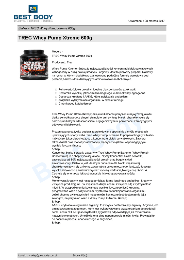 Utworzono : 08 marzec 2017 Białka > TREC Whey Pump Xtreme 600g TREC Whey Pump Xtreme 600g Model : TREC Whey Pump Xtreme 600g Producent : Trec Whey Pump Xtreme - to najwyższej jakości koncentrat białek serwatkowych wzbogacony w dużą dawkę kreatyny i argininy. Jest to pierwszy preparat białkowy na rynku, w którym dodatkowo zastosowano podwójną formułę wzrostową pod postacią bardzo silnie działających aminokwasów anabolicznych. � Pełnowartościowe proteiny, idealne dla sportowców sztuk walki � Dostarcza wysokiej jakości białka bogatego w aminokwasy egzogenne � Dostarcza kreatyny i AAKG, które zwiększają anabolizm � Zwiększa wytrzymałość organizmu w czasie treningu � Chroni przed katabolizmem y d Trec Whey Pump Xtreme dzięki unikalnemu połączeniu najwyższej jakości białka serwatkowego z silnymi stymulatorami syntezy białek, charakteryzuje się bardziej unikalnymi właściwościami ergogenicznymi w porównaniu z tradycyjnymi odżywkami białkowymi. o B Prezentowana odżywka została zaprojektowana specjalnie z myślą o osobach uprawiających sporty walki. Trec Whey Pump X-Treme to preparat bogaty w białko najwyższej jakości pochodzące z koncentratu białek serwatkowych. Zawiera także AAKG oraz monohydrat kreatyny, będące związkami wspomagającymi wysiłek fizyczny. Koncentrat białka serwatki zawarty w Trec Whey Pump Extreme (Whey Protein Concentrate) to wysokiej jakości, czysty koncentrat białka serwatki, zawierający aż 80% najwyższej jakości protein oraz bogaty skład aminokwasowy. Białko to jest idealnym budulcem dla tkanki mięśniowej, charakteryzującym się znikomą zawartością cukru mlecznego (laktozy), tłuszczu, wysoką aktywnością anaboliczną oraz wysoką wartością biologiczną BV=104. Cechuje się ono także lekkostrawnością i świetną przyswajalnością. Monohydrat kreatyny jest najpopularniejszą formą legalnego anabolika - kreatyny. Zwiększa produkcję ATP w mięśniach dzięki czemu zwiększa siłę i wytrzymałość mięśni. W przypadku umiarkowanego wysiłku fizycznego ilość kreatyny, przyjmowana wraz z pożywieniem, wystarcza do funkcjonowania organizmu. Jeżeli chcemy zwiększyć siłę i masę mięśni konieczne jest dostarczenie jej z zewnątrz, na przykaład wraz z Whey Pump X-Treme. AAKG, czyli alfa-ketoglutaran argininy, to związek dostarczający argininy. Arginina jest aminokwasem egzogennym, który jest wykorzystywane przez organizm do produkcji tlenku azotu NO. NO jest cząsteczką sygnałową odpowiadającą za rozkurczanie naczyń krwionośnych. Umożliwia ona silne napompowaie mięśni krwią. Prowadzi to do nasilenia procesu anabolicznego w mięśniach. t s e B kontakt : - [email protected] Strona 1/{nb} Utworzono : 08 marzec 2017 Białka > TREC Whey Pump Xtreme 600g TREC Whey Pump Xtreme 600g t s e B kontakt : - [email protected] Strona 2/{nb} o B y d Utworzono : 08 marzec 2017 Białka > TREC Whey Pump Xtreme 600g TREC Whey Pump Xtreme 600g Wielkość porcji: 30g Ilość porcji w opakowaniu: 20 Dawkowanie i sposób użycia: stosować 1 porcje Whey Pump Extreme 1-2 razy dziennie, najlepiej po treningu oraz w okolicy posiłków ubogich w proteiny. UWAGA - kopiowanie oraz rozpowrzechnianie opisów jest zabronione przez BEST BODY © 2010. Ustawa z dnia 4 lutego 1994 r. o prawie autorskim i prawach pokrewnych (Dz. U. z 2006 r. Nr 90, poz. 631 z późn. zm.). Ochrona autorskich praw osobistych: Twórca, którego autorskie prawa osobiste zostały zagrożone cudzym działaniem, może żądać zaniechania tego działania. W razie dokonanego naruszenia może także żądać, aby osoba, która dopuściła się naruszenia, dopełniła czynności potrzebnych do usunięcia jego skutków, w szczególności, aby złożyła publiczne oświadczenie o odpowiedniej treści i formie. Jeżeli naruszenie było zawinione, sąd może przyznać twórcy odpowiednią sumę pieniężną tytułem zadośćuczynienia za doznaną krzywdę albo - na żądanie twórcy - zobowiązać sprawcę, aby uiścił odpowiednią sumę pieniężną na wskazany przez twórcę cel społeczny. o B Cena : 59,00 zł Brutto ( 55,14 zł Netto) t s e B Dostępność: Produkt dostępny w naszym sklepie od 01 czerwiec 2013 kontakt : - [email protected] Strona 3/{nb} y d